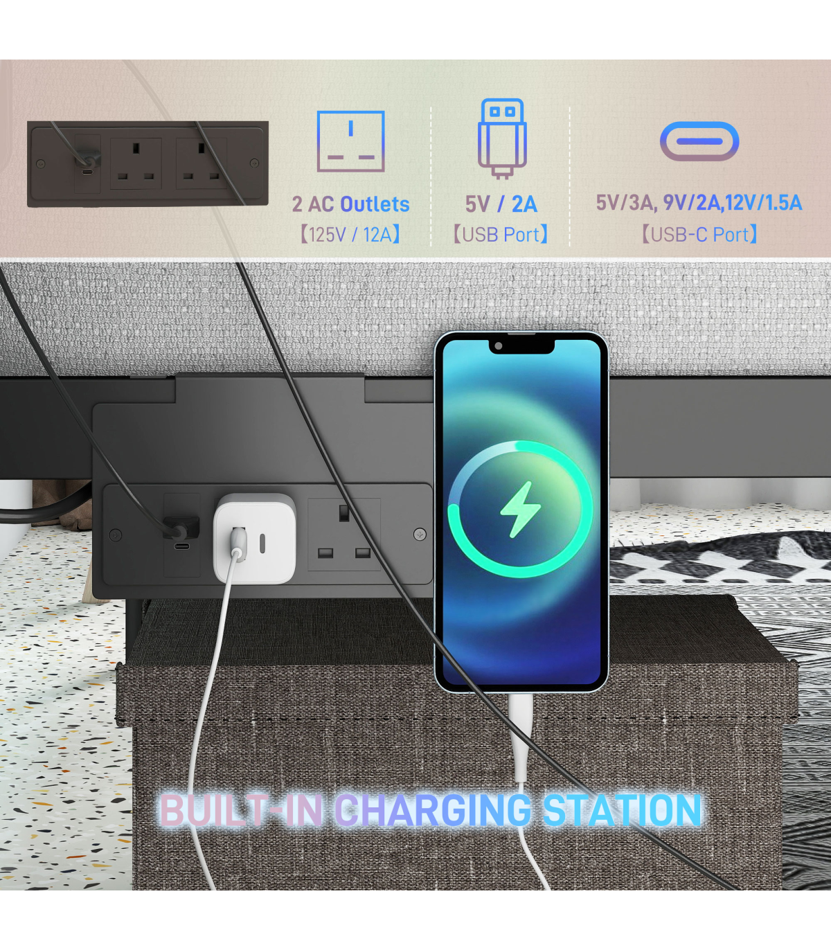 ● Built-in two AC outlets, a USB port and a USB-C socket