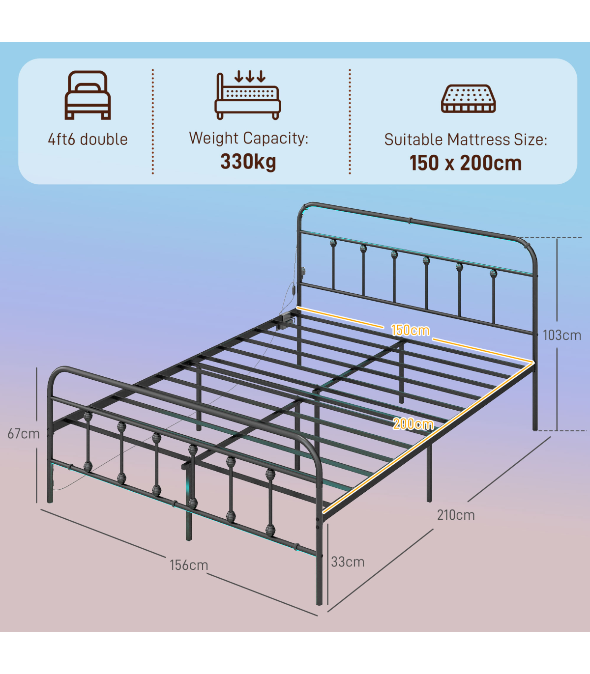 ● Powder-coated steel frame, 12 slats and six legs support up to 330 kg