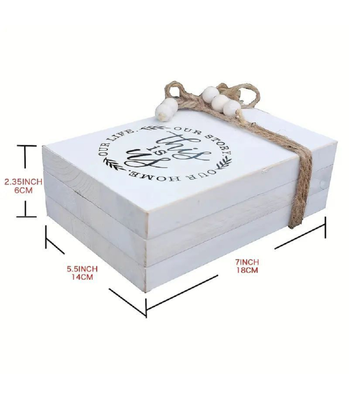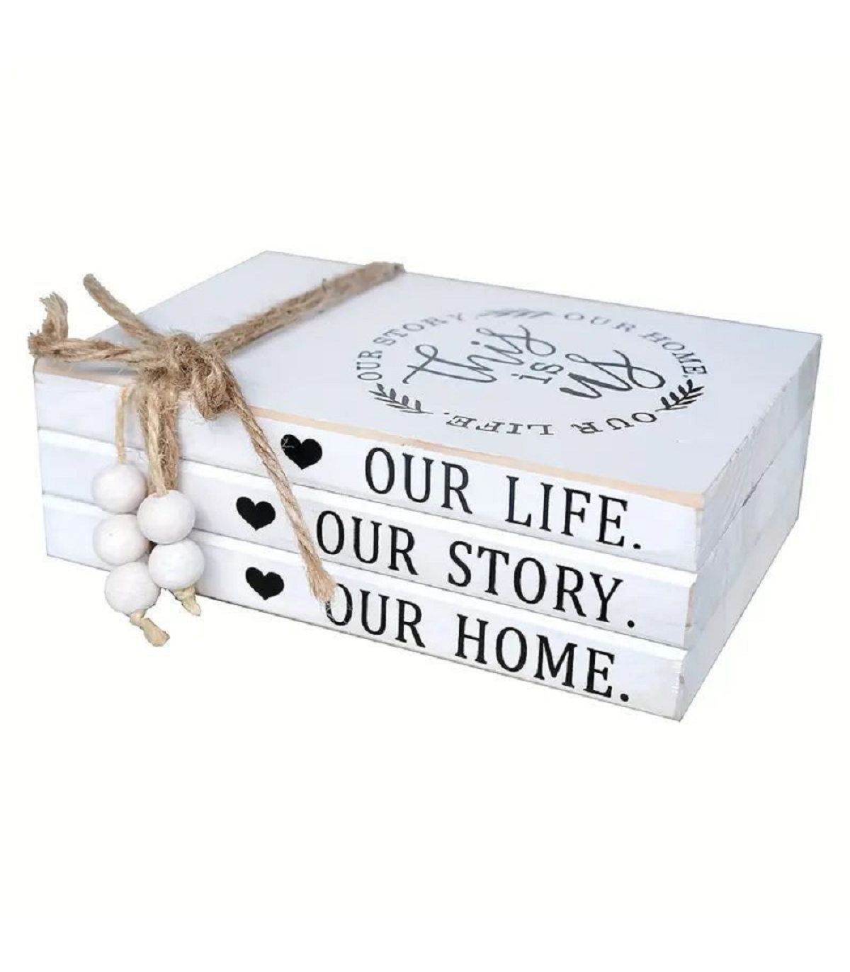 This farmhouse stacked books decor consists of 3 books made of solid cedarwood. White painted with slight distressing finish.
