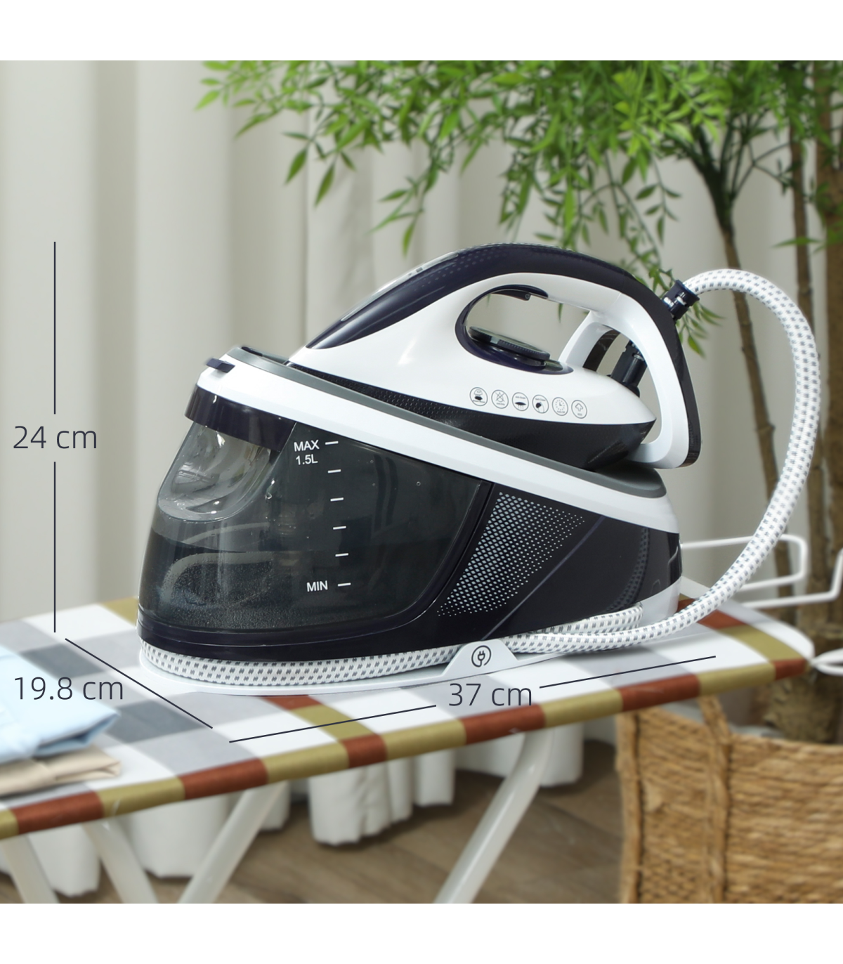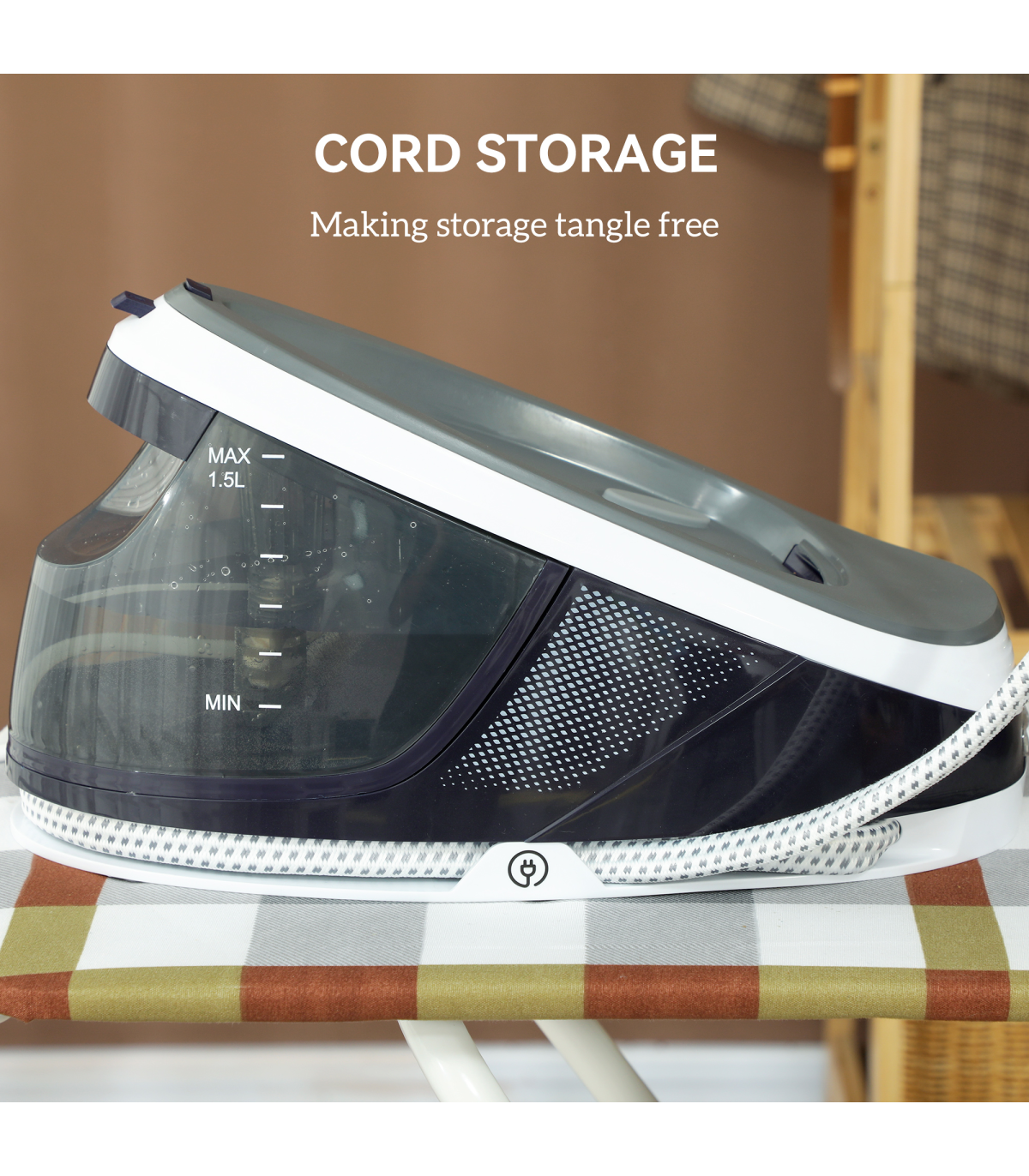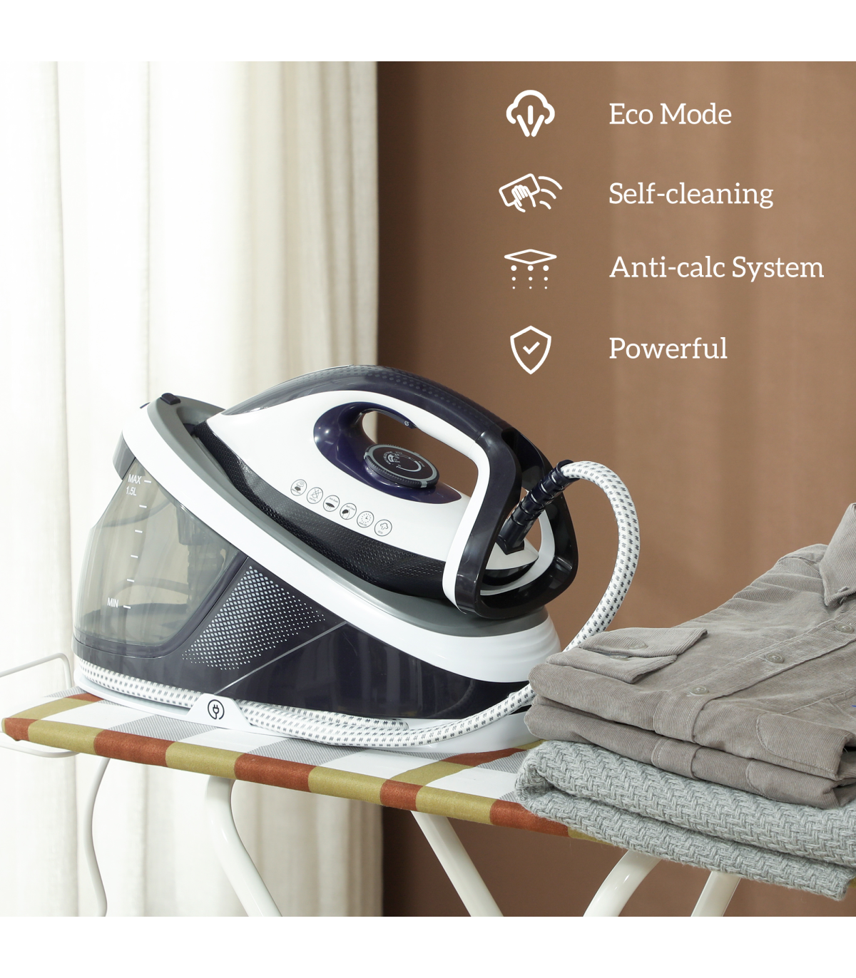 ● 100g/min burst (15-20s) and 45g/min continuous steam to remove stubborn wrinkles effortlessly