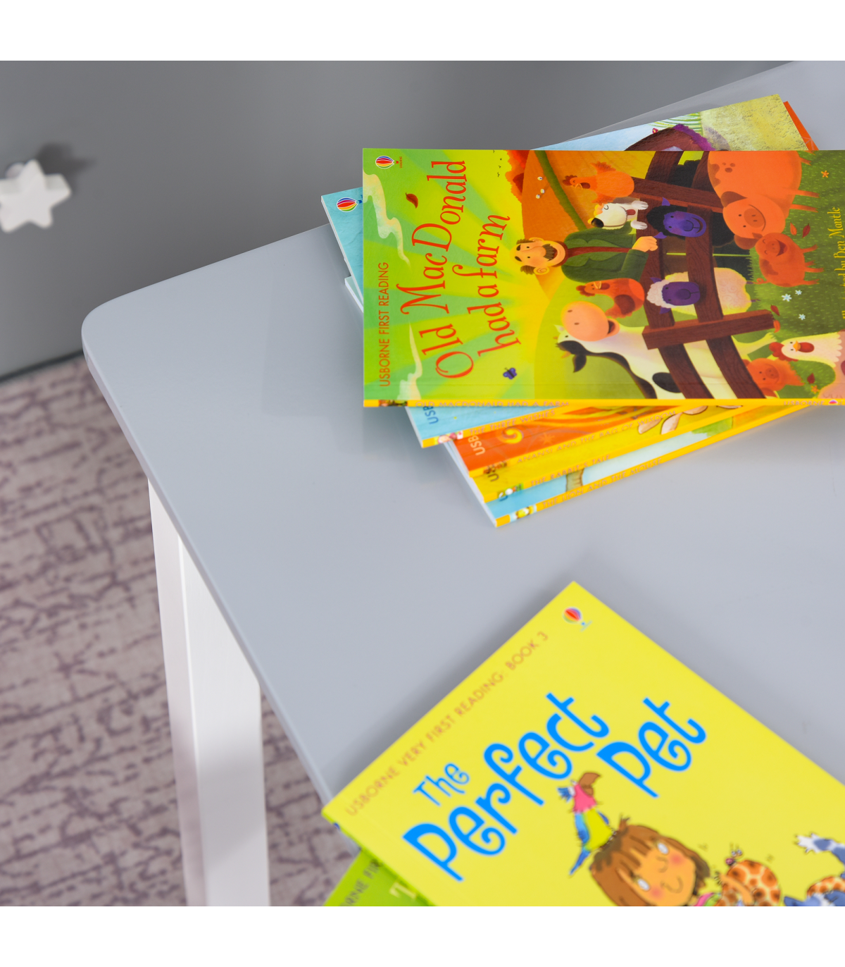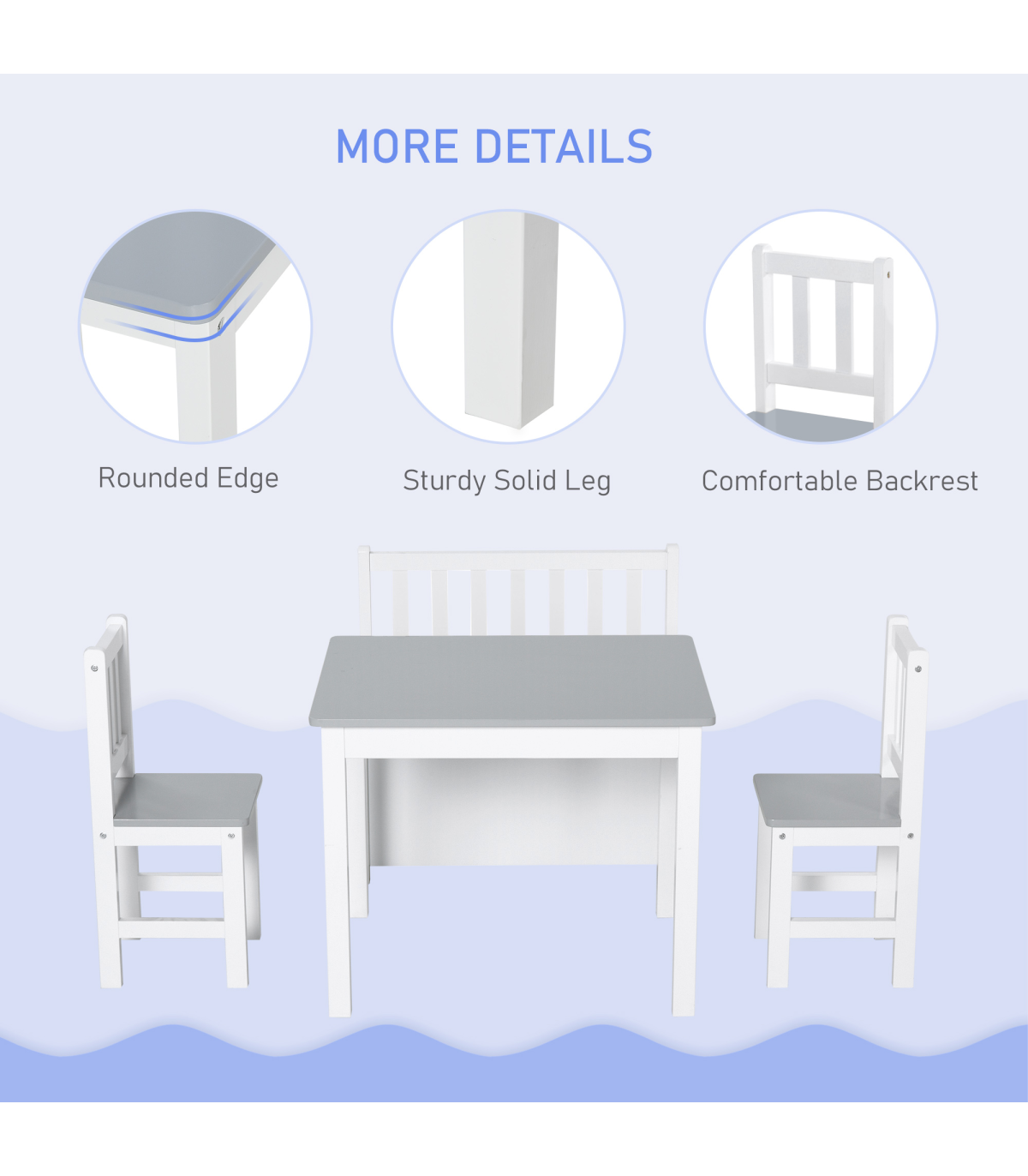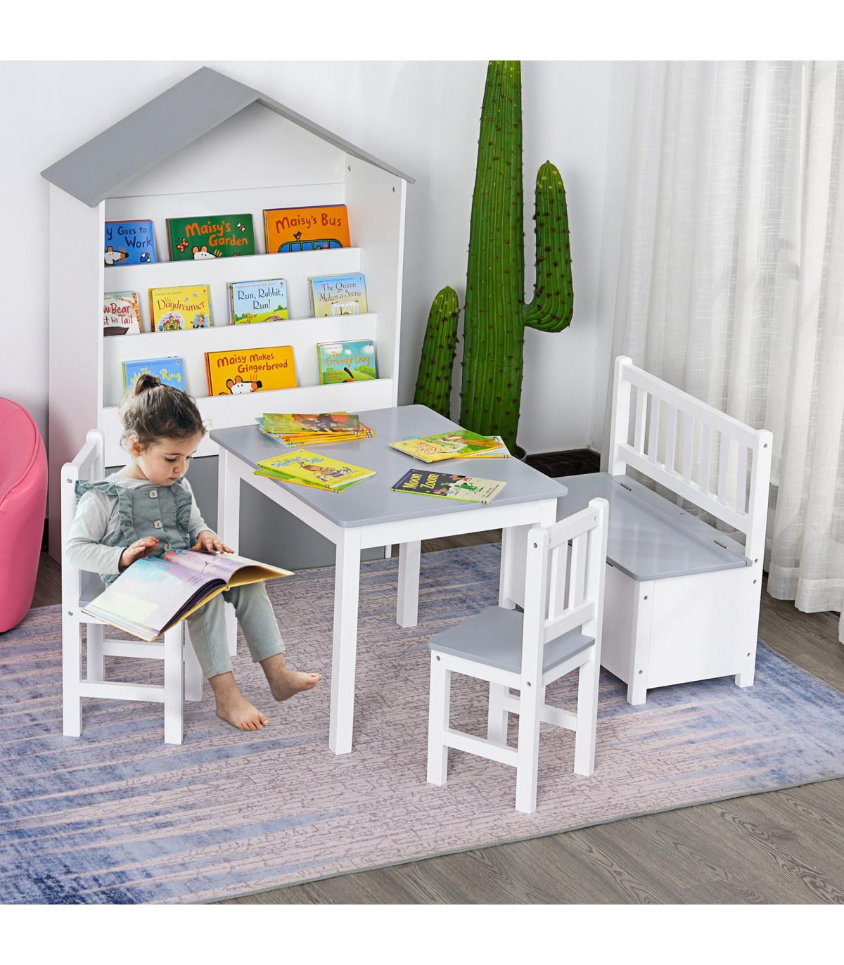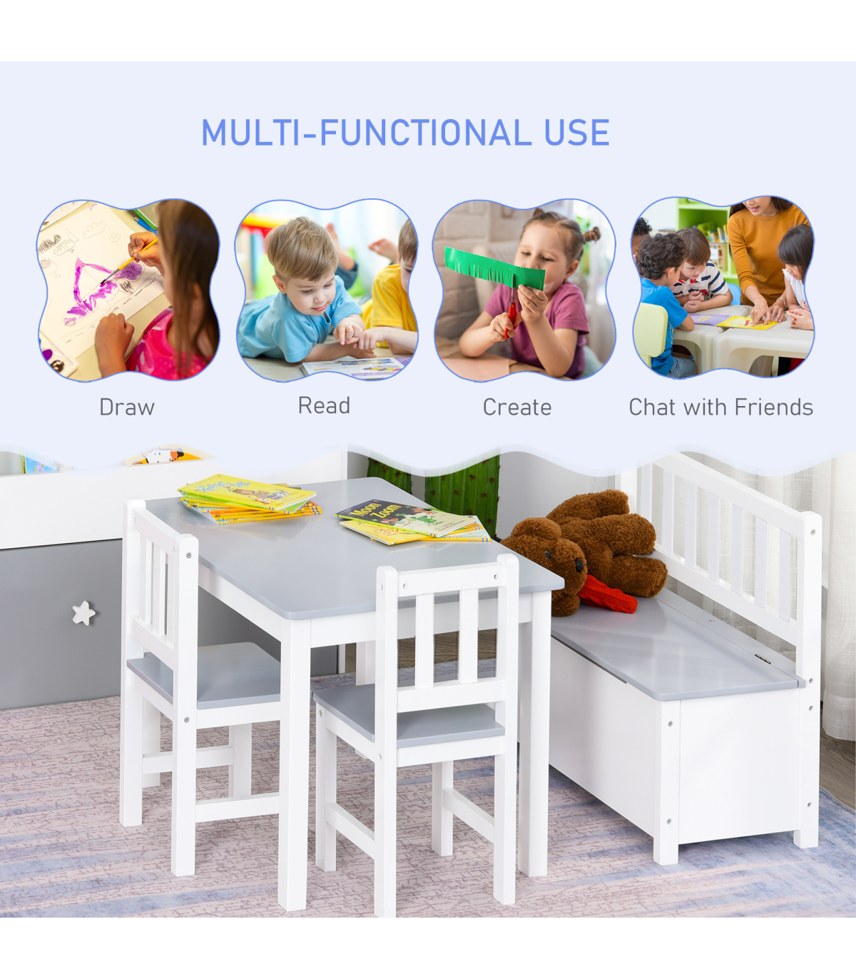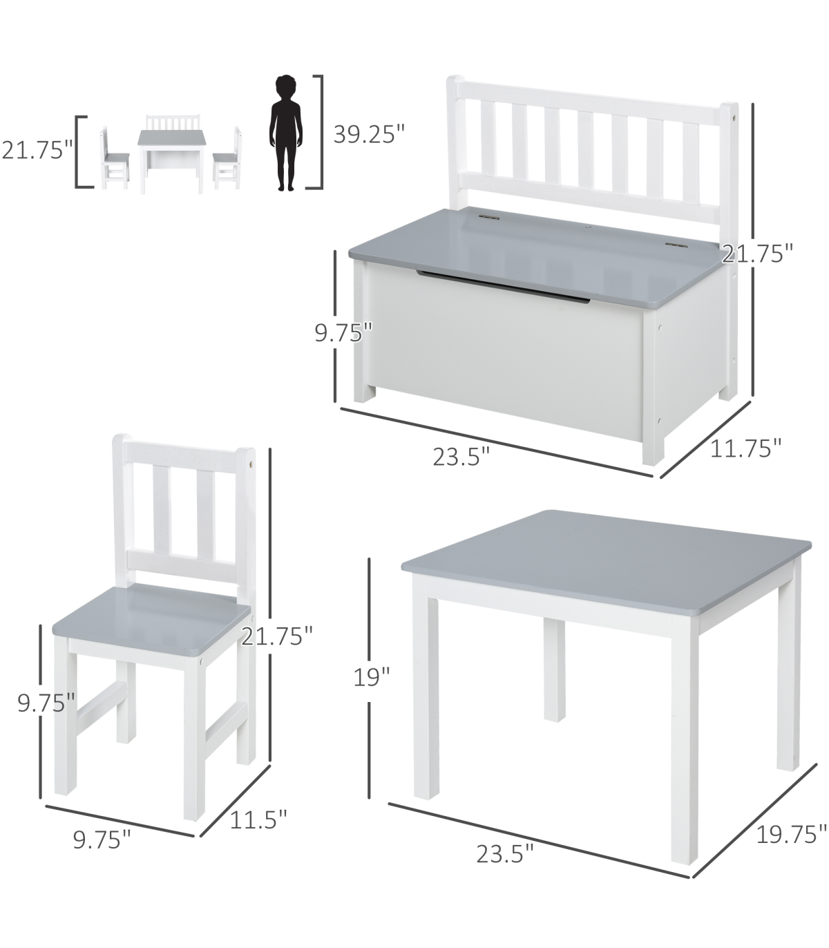 - - Kids work activity set includes a table, 2 chairs and a storage bench