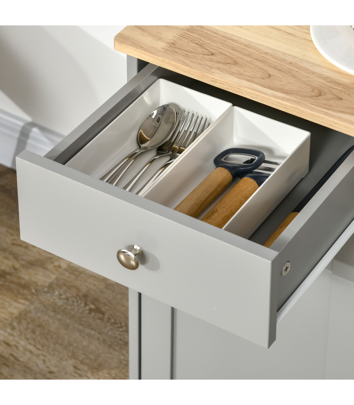 - - Three large drawers offer storage for utensils