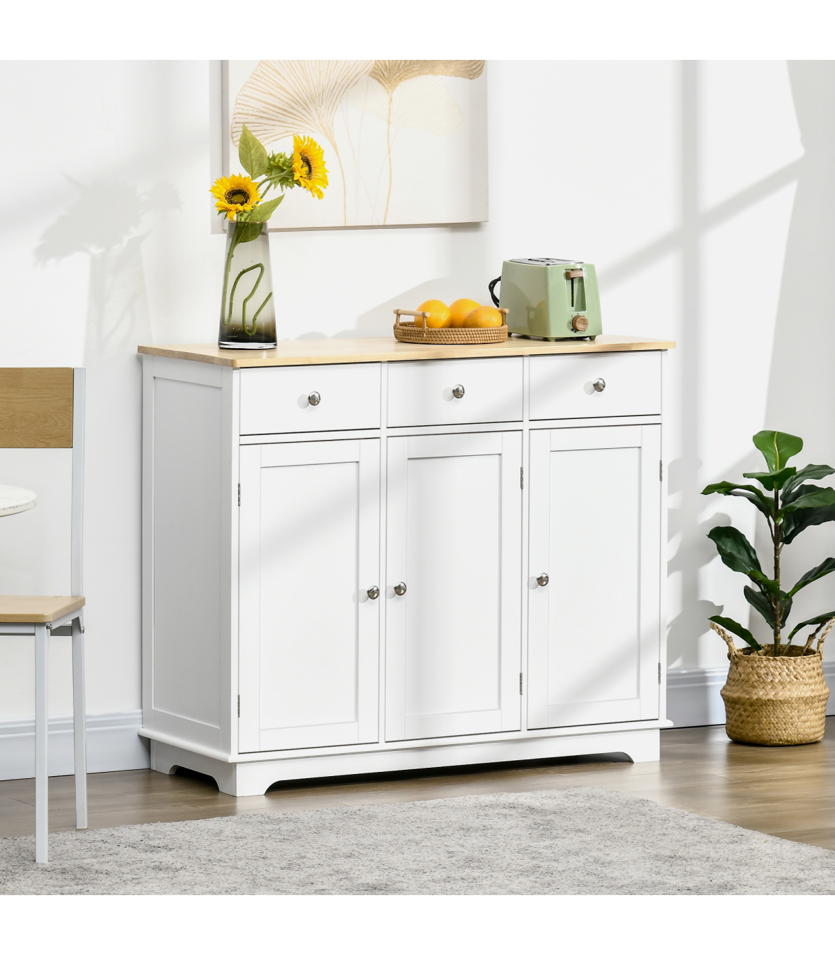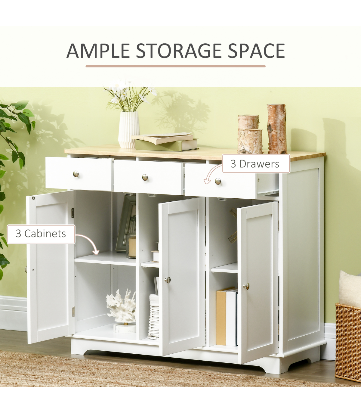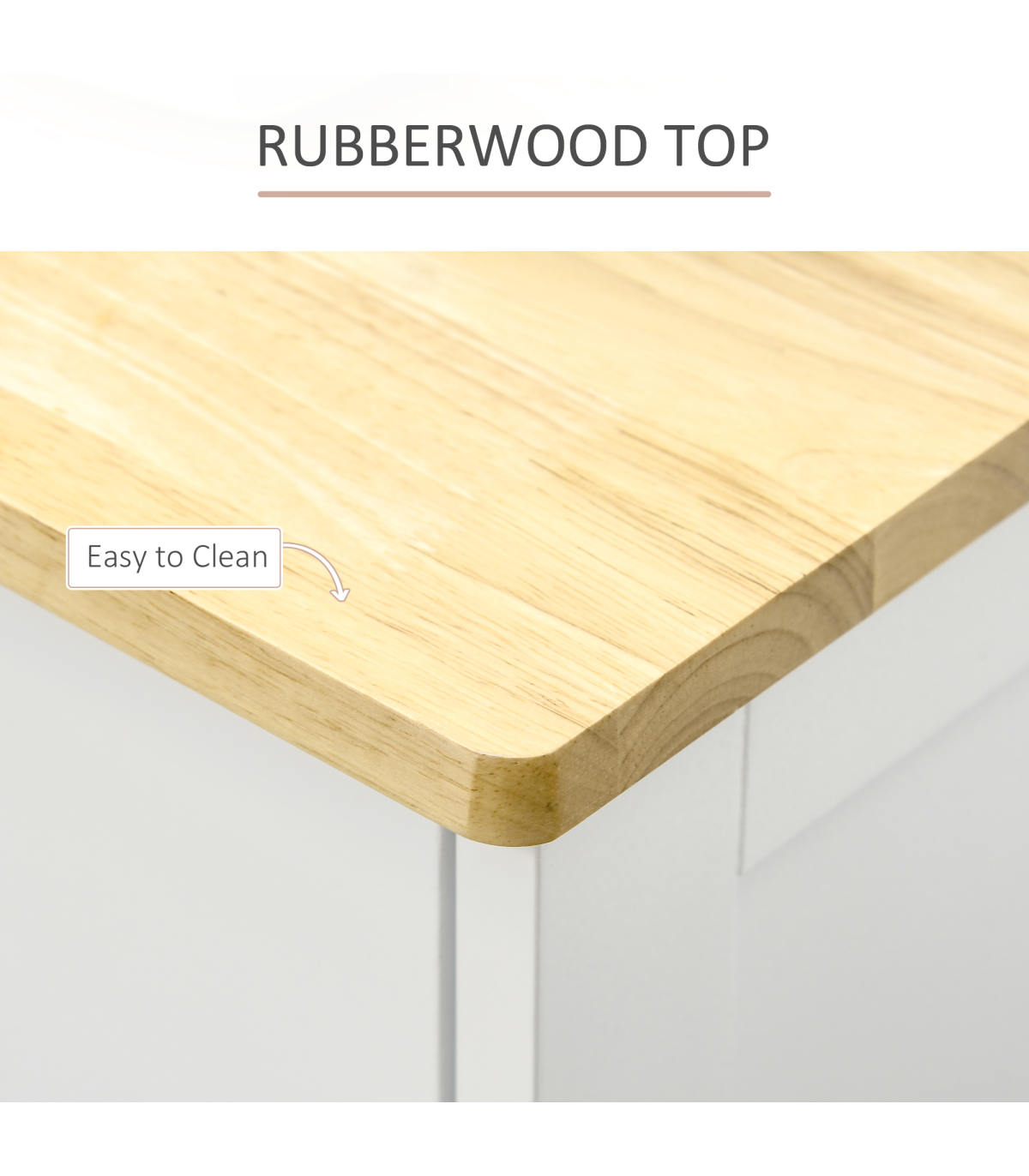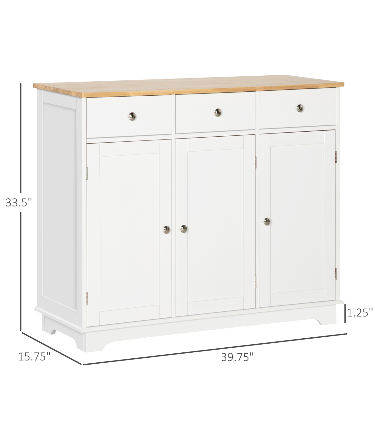 - Large storage space with three storage cabinets and three drawers for holding daily supplies