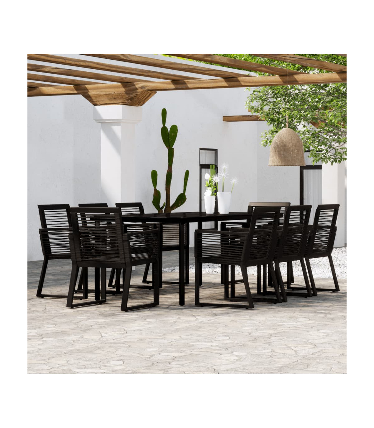 Create a compelling and cohesive aesthetic in your outdoor space with this garden dining set! This dinner table is made of a powder-coated steel frame, sturdy and stable for daily outdoor use. The smooth glass tabletop is easy to clean with a damp cloth and perfect for placing meals, drinks and other decorative items. The garden chairs are made of PVC rattan, woven over a fine lacquered steel frame, making them stable and resistant to poor weather and UV rays. Note: In order to extend the life of your outdoor furniture, we recommend you to clean it regularly and do not leave it outdoors without protection unnecessarily. Clean: Use a mild soap solution. Storing: If possible, store in a cool, dry place indoors. If the product is stored outdoors, protect it with a waterproof cover. Wipe and dry the excess water or snow from flat surfaces after a rain or snowfall. Allow sufficient air circulation to avoid moisture-related damage.
