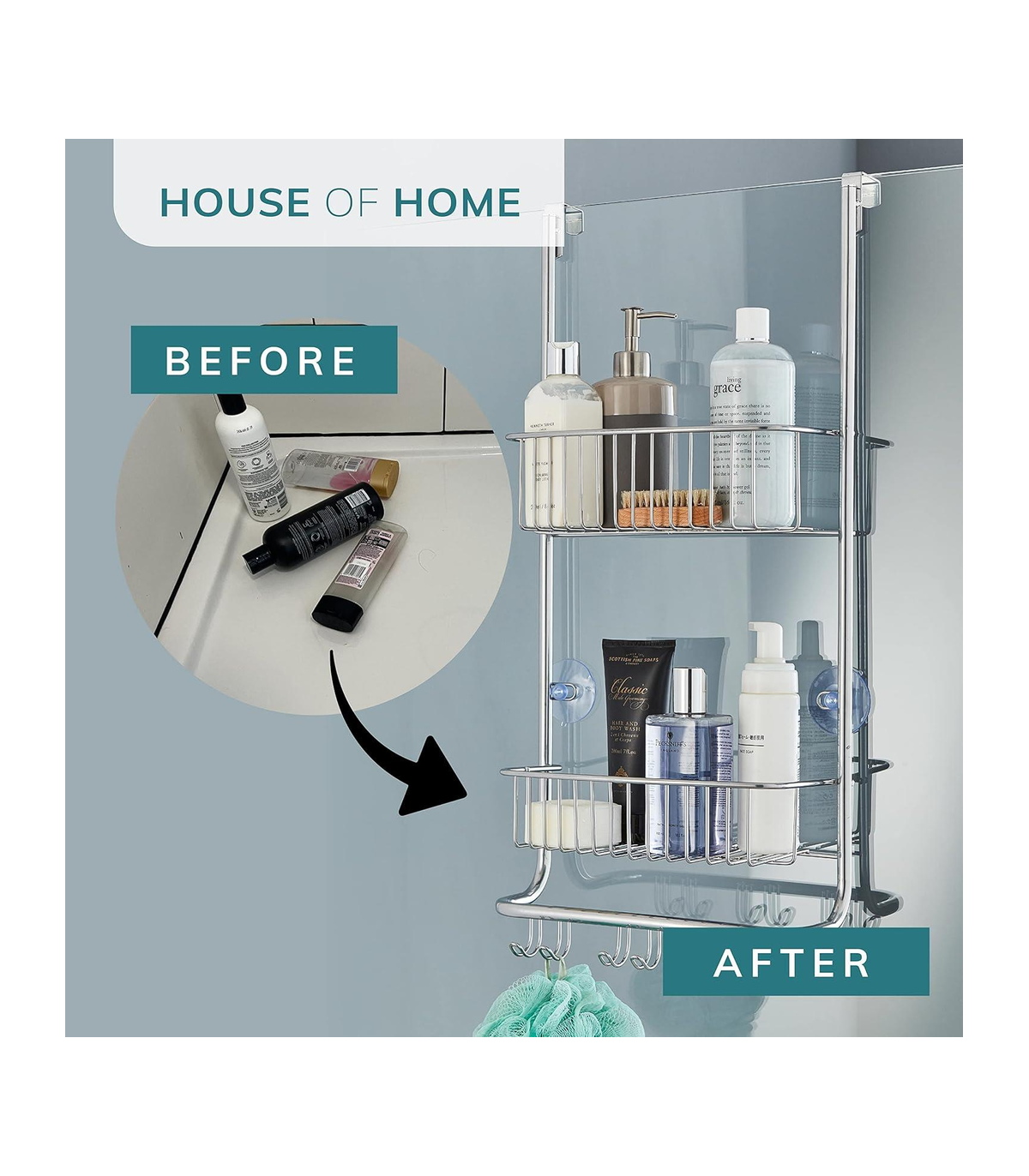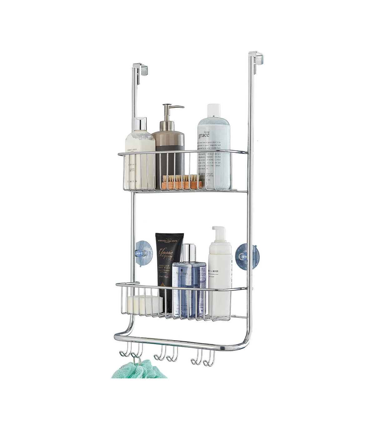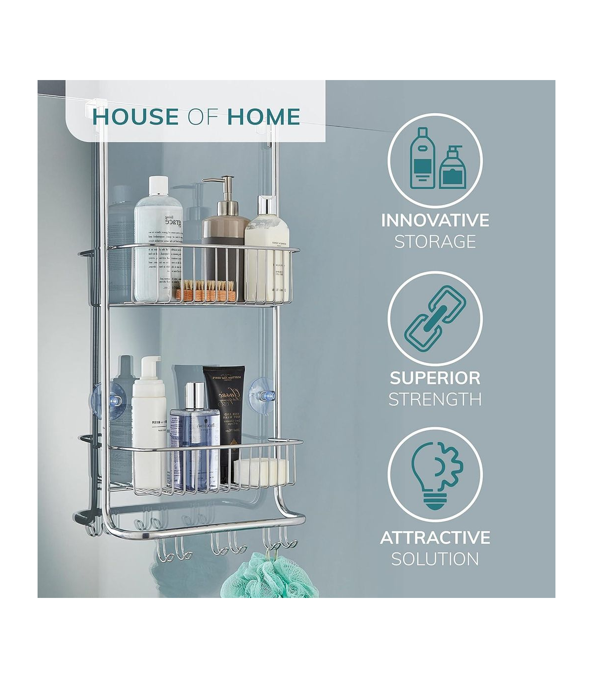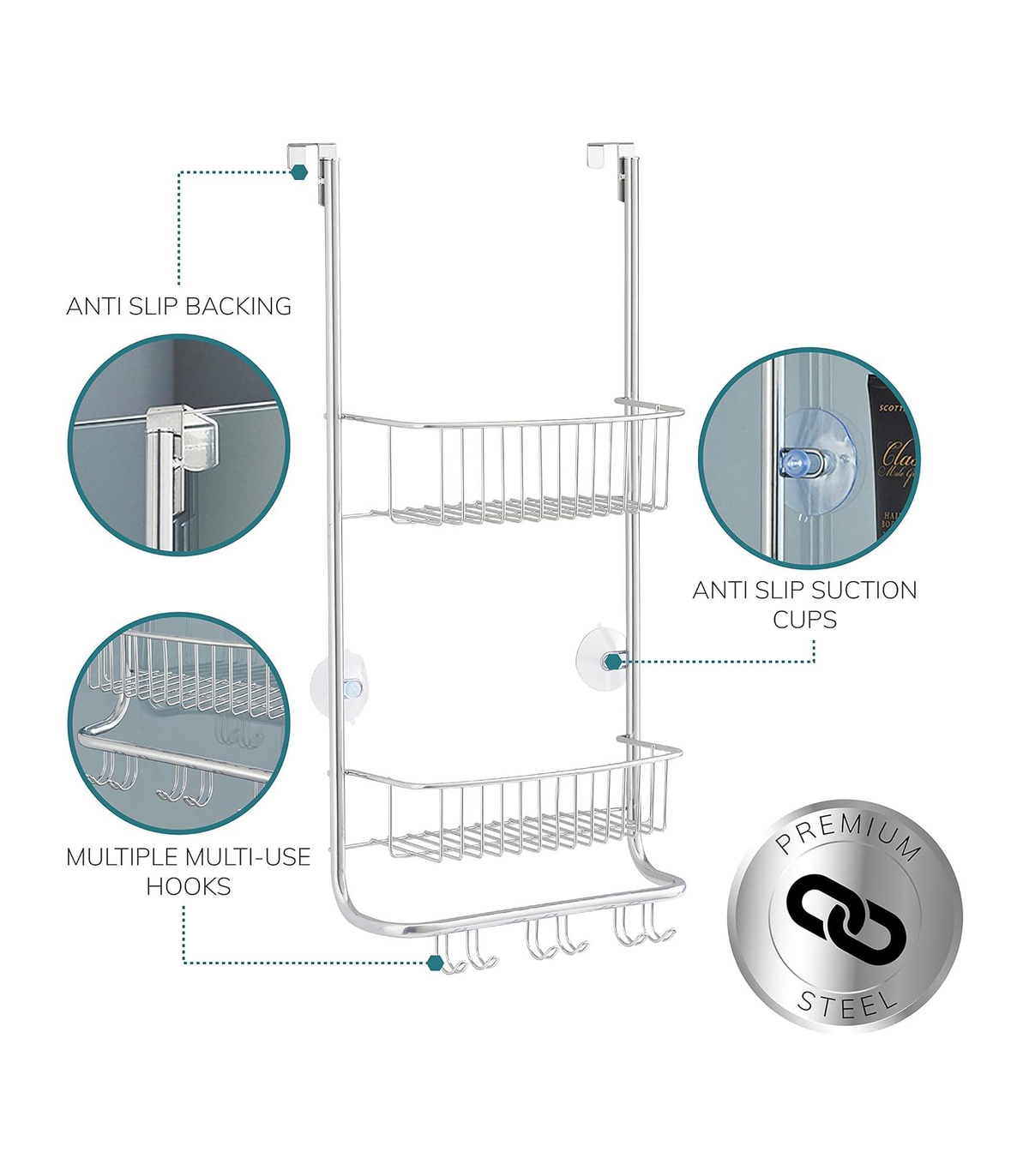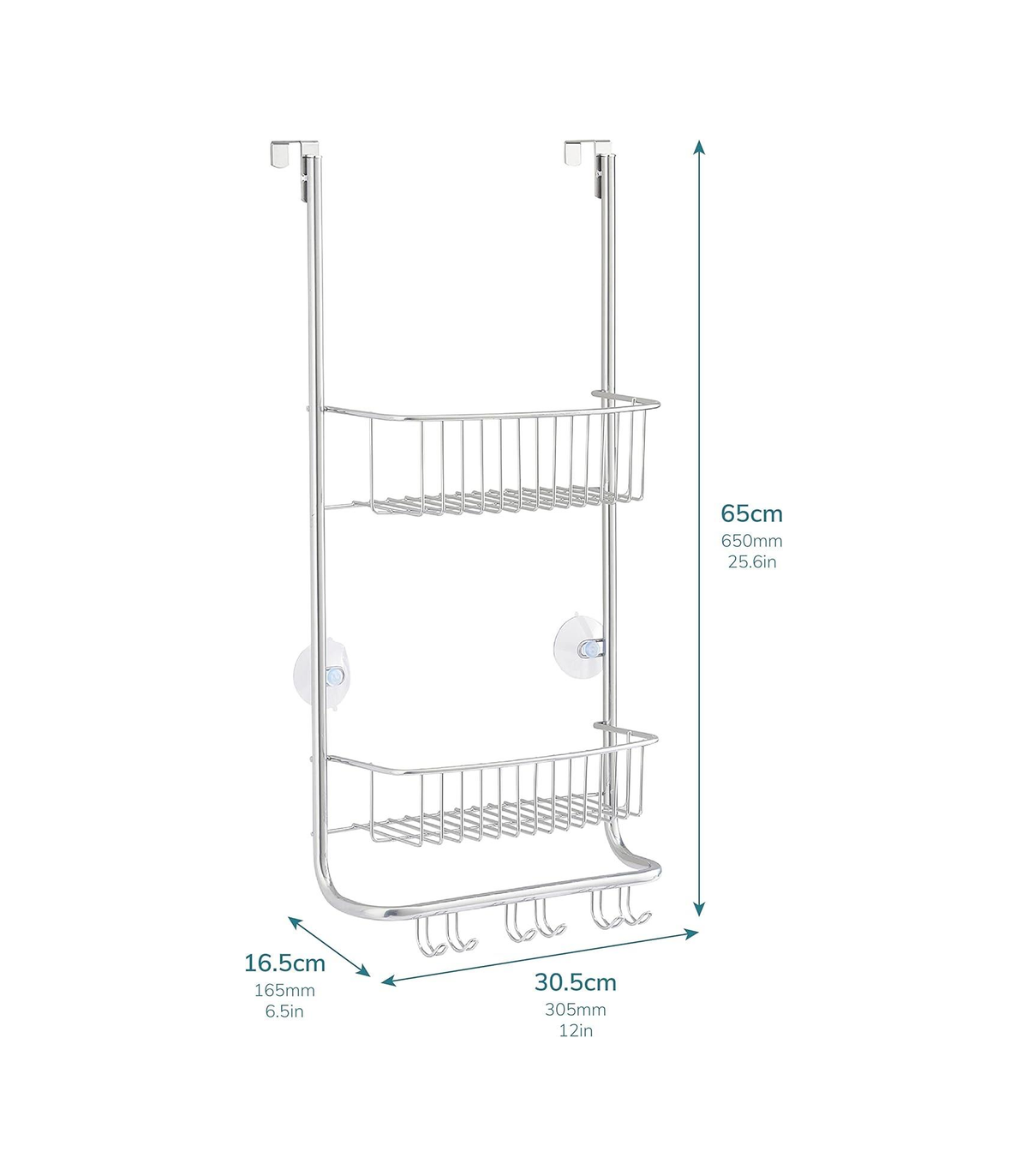 HANGING SHOWER CADDY - This stylish high quality 2 tier hanging shower caddy is both useful for storing all your bath and body products and looks superb hanging in any shower room. Measuring 65 H x 30.5 W x 16.5 D (cm), and easy to install. Simply hang over your door up to 4cm thick. The two additional suction cups ensure a secure caddy when in use.