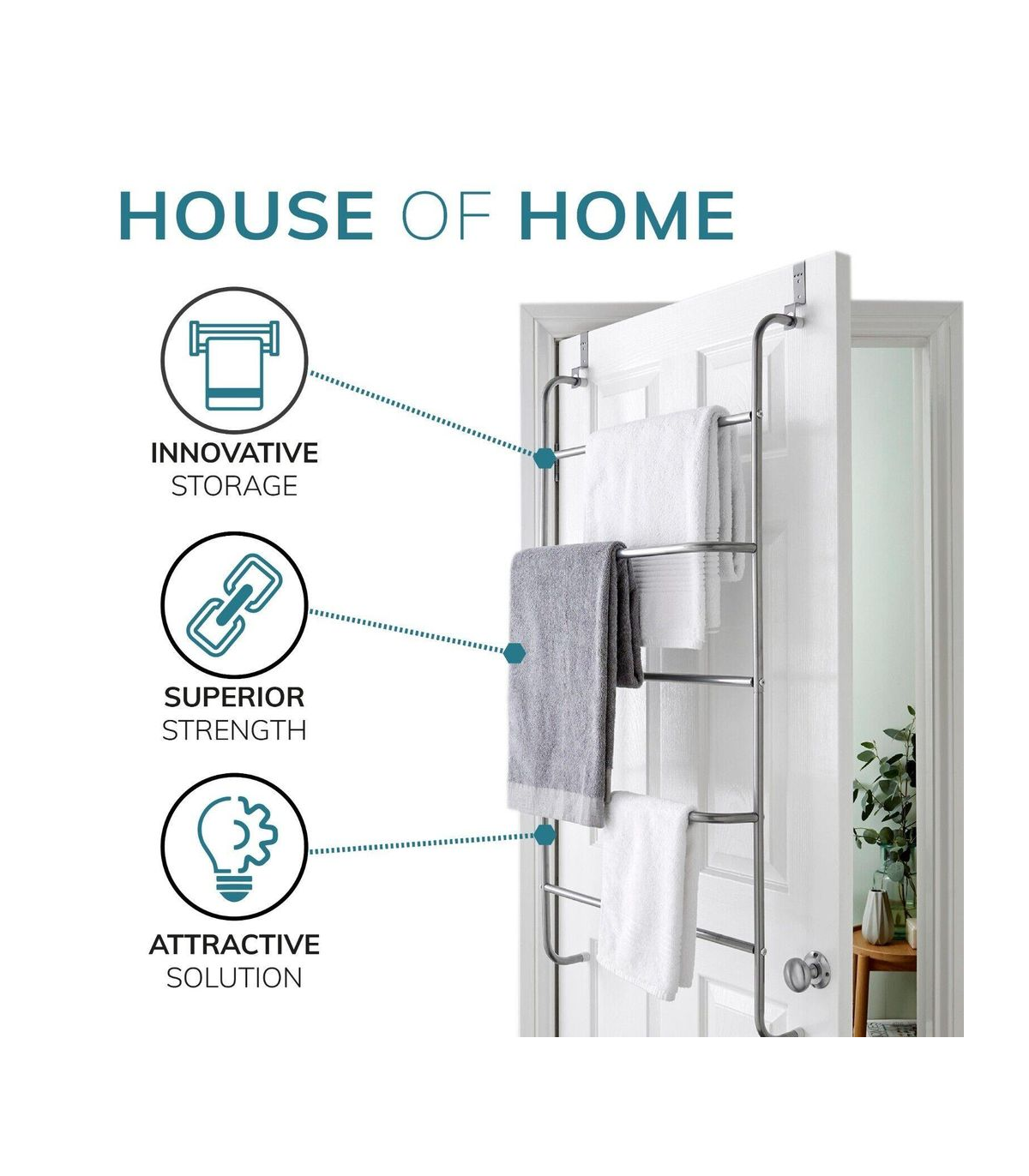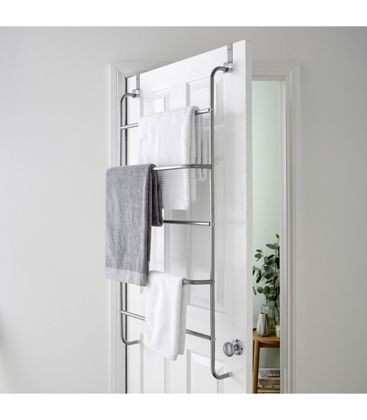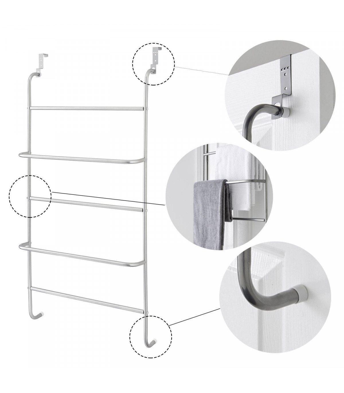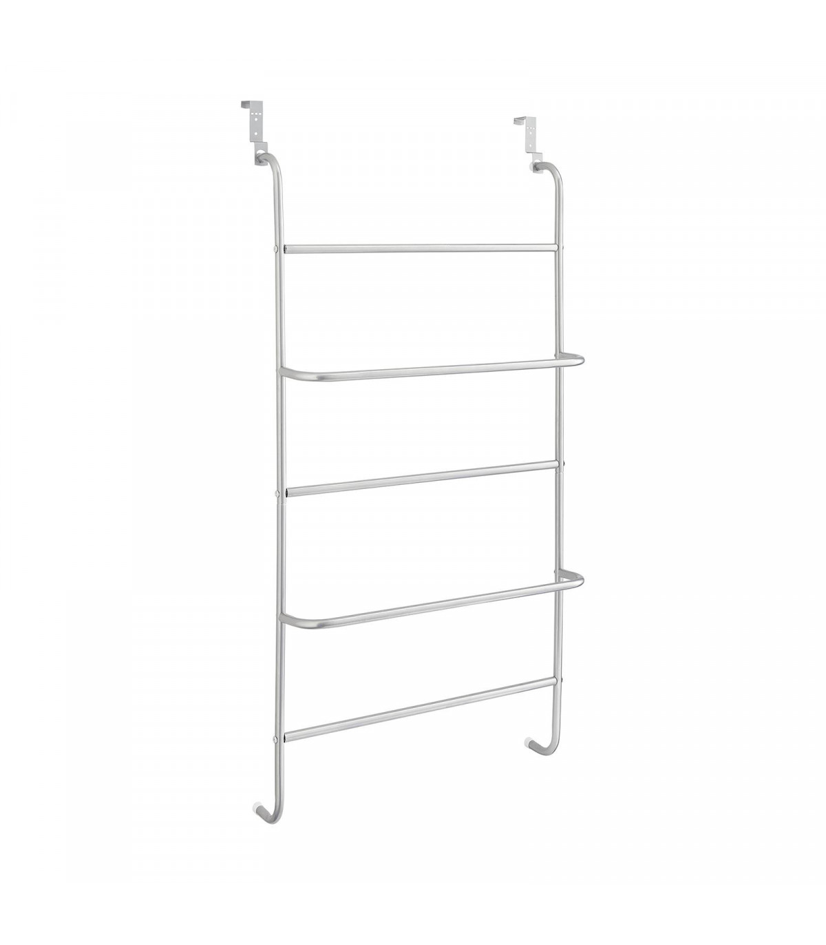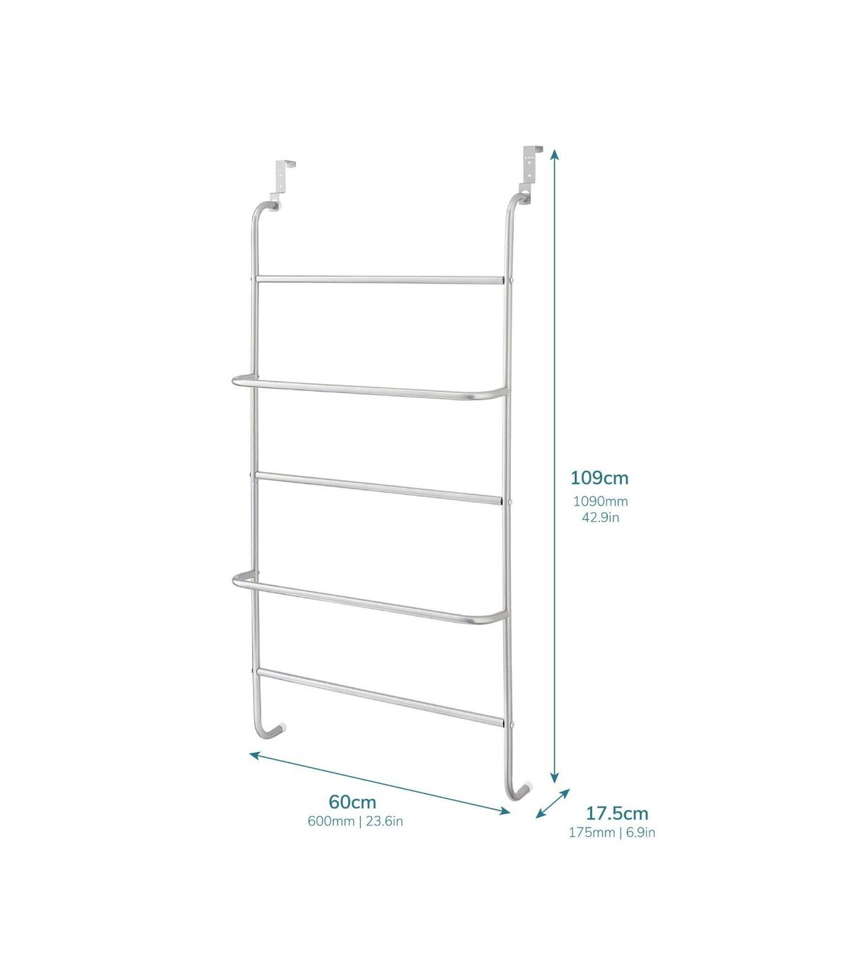 This metal clothes rack creates a practical storage space on your bathroom or bedroom door. Perfect for bath towels, hand towels or clothing. Simple to assemble, the over the door towel rail is simply hung up by the hooks above each door with thickness up to 4 cm. This allows you to flexibly use them throughout the household. Rubber non slip feet protect your door from and scuffs and scratches whilst keeping a firm grip when in use. This high quality towel rack is made of strong steel and powder coated to stand the test of time. Measuring 60 cm x 17.5 cm x 109 cm and with 5 clothes rails, the clothing bars offer generous space for your clothes and towels. Additional fixings included to further secure over door hooks.