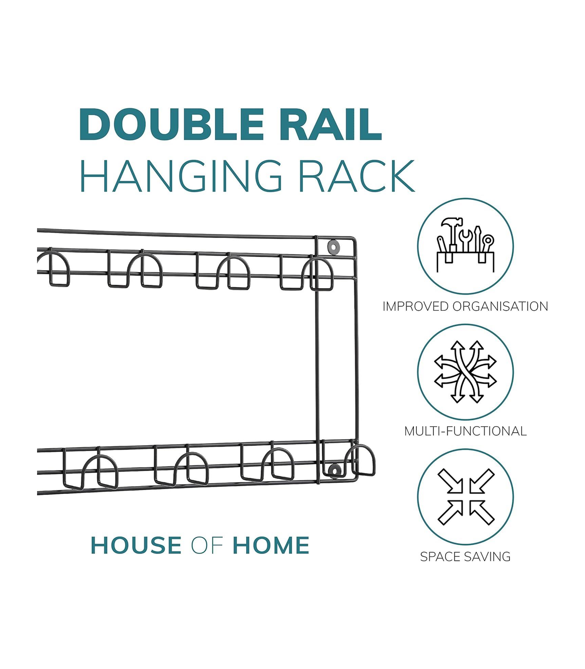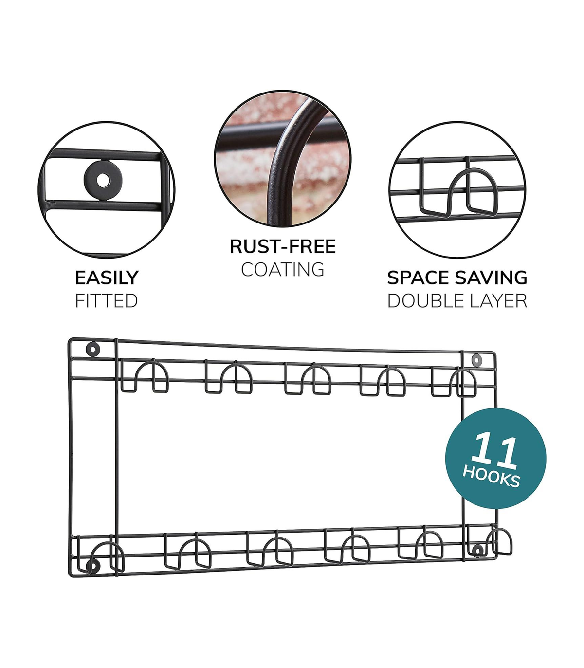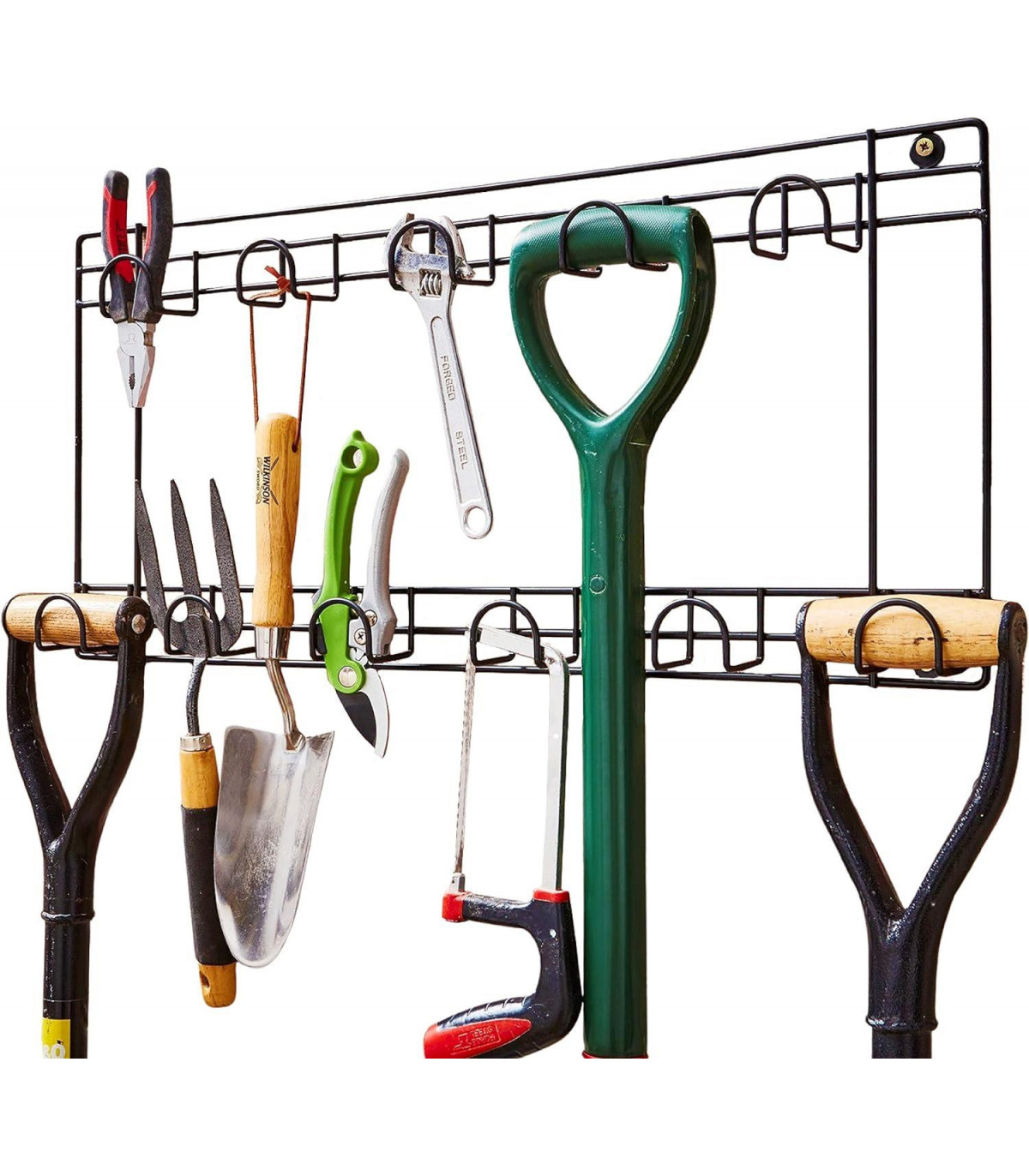 Take the stress out of organising the shed with our 11 hook, two tier tool rack. A tool storage solution designed to make the best use of your garage and shed work space and keep your tools close to hand. Plenty of storage space for garden spades, forks, rakes etc and can be mounted to the wall with just 4 screws with all fixings Included. Sturdy metal material with Black powder coated finish. Size - 66.5cm length x 30.5cm height x 5.5cm depth