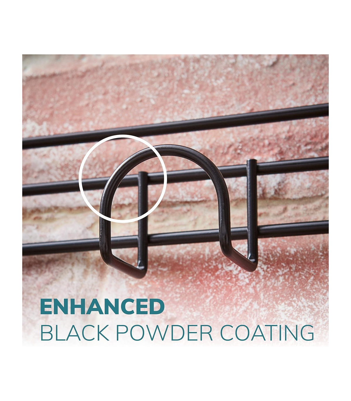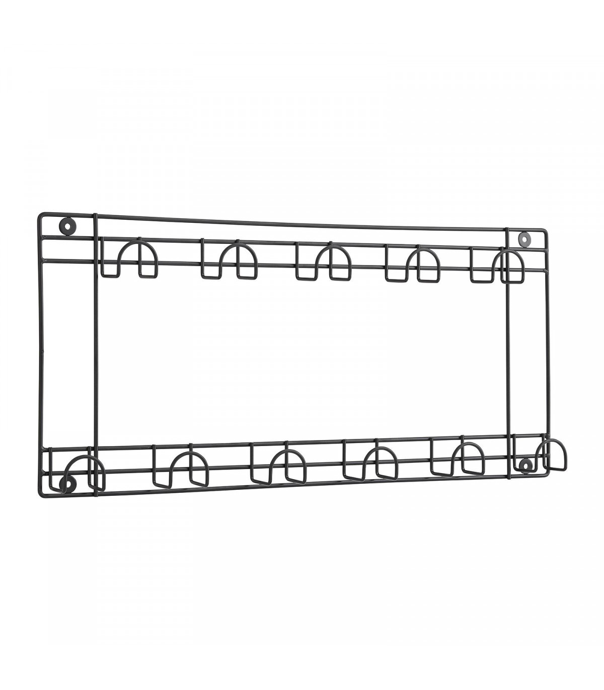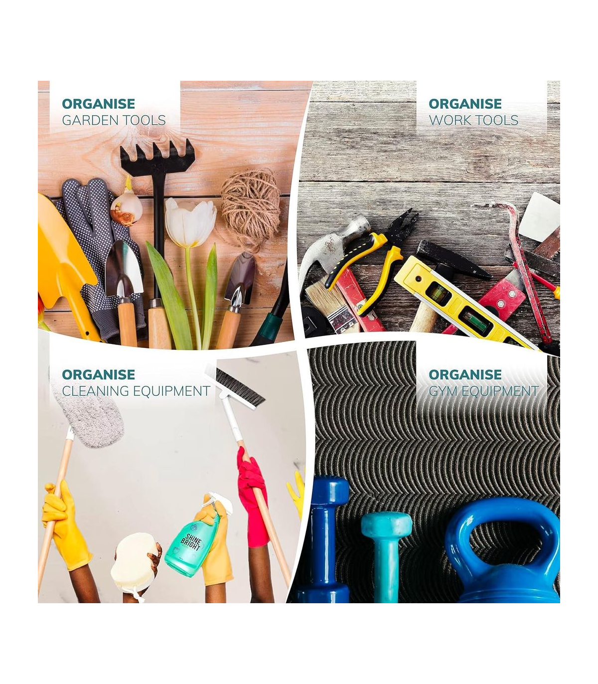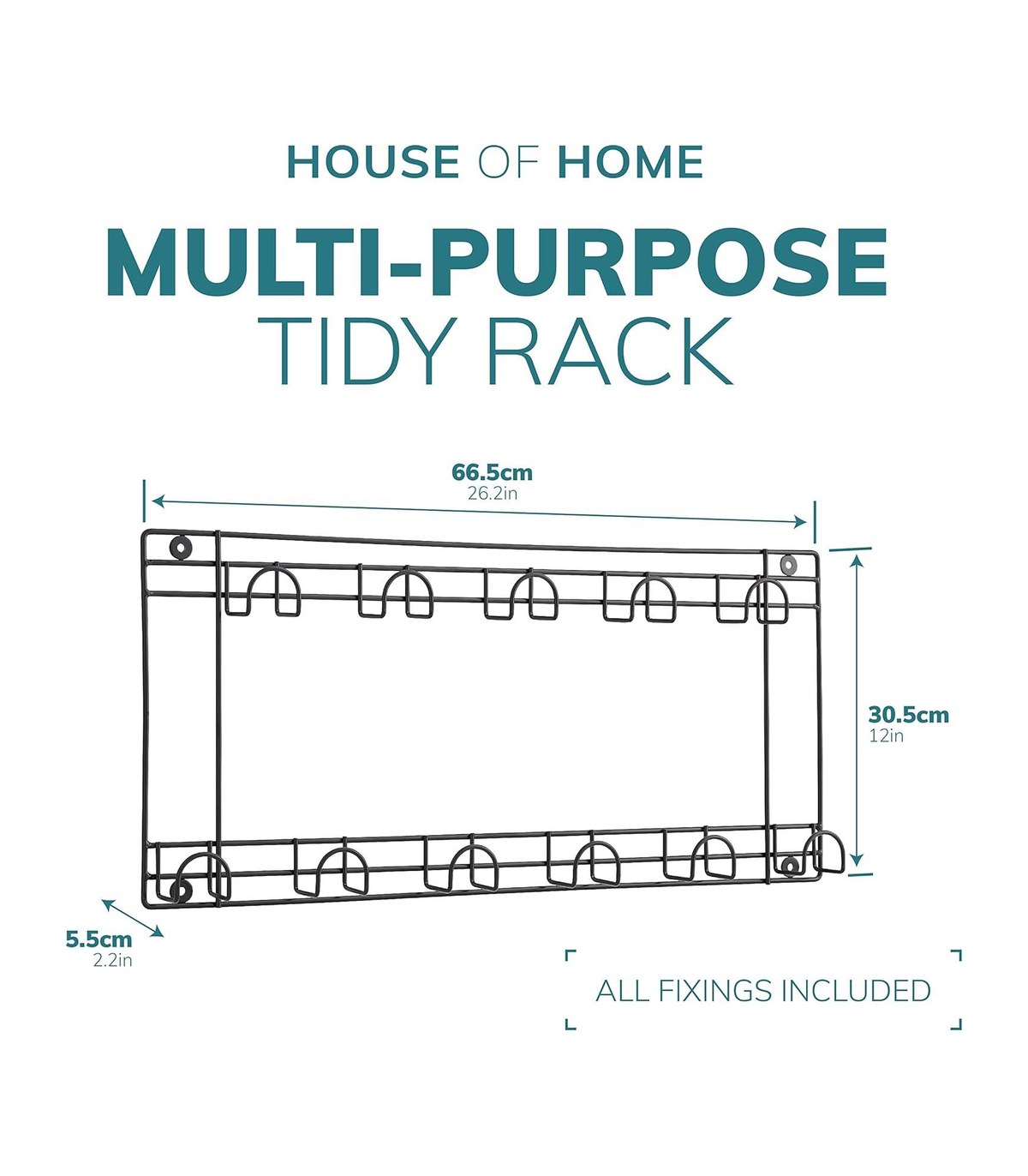 Take the stress out of organising the shed with our 11 hook, two tier tool rack. A tool storage solution designed to make the best use of your garage and shed work space and keep your tools close to hand. Plenty of storage space for garden spades, forks, rakes etc and can be mounted to the wall with just 4 screws with all fixings Included. Sturdy metal material with Black powder coated finish. Size - 66.5cm length x 30.5cm height x 5.5cm depth