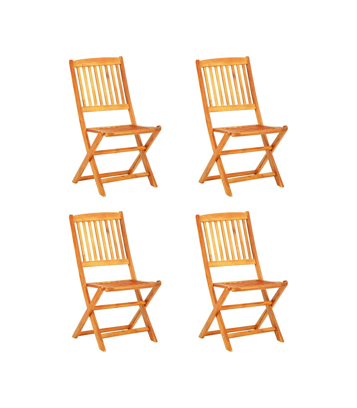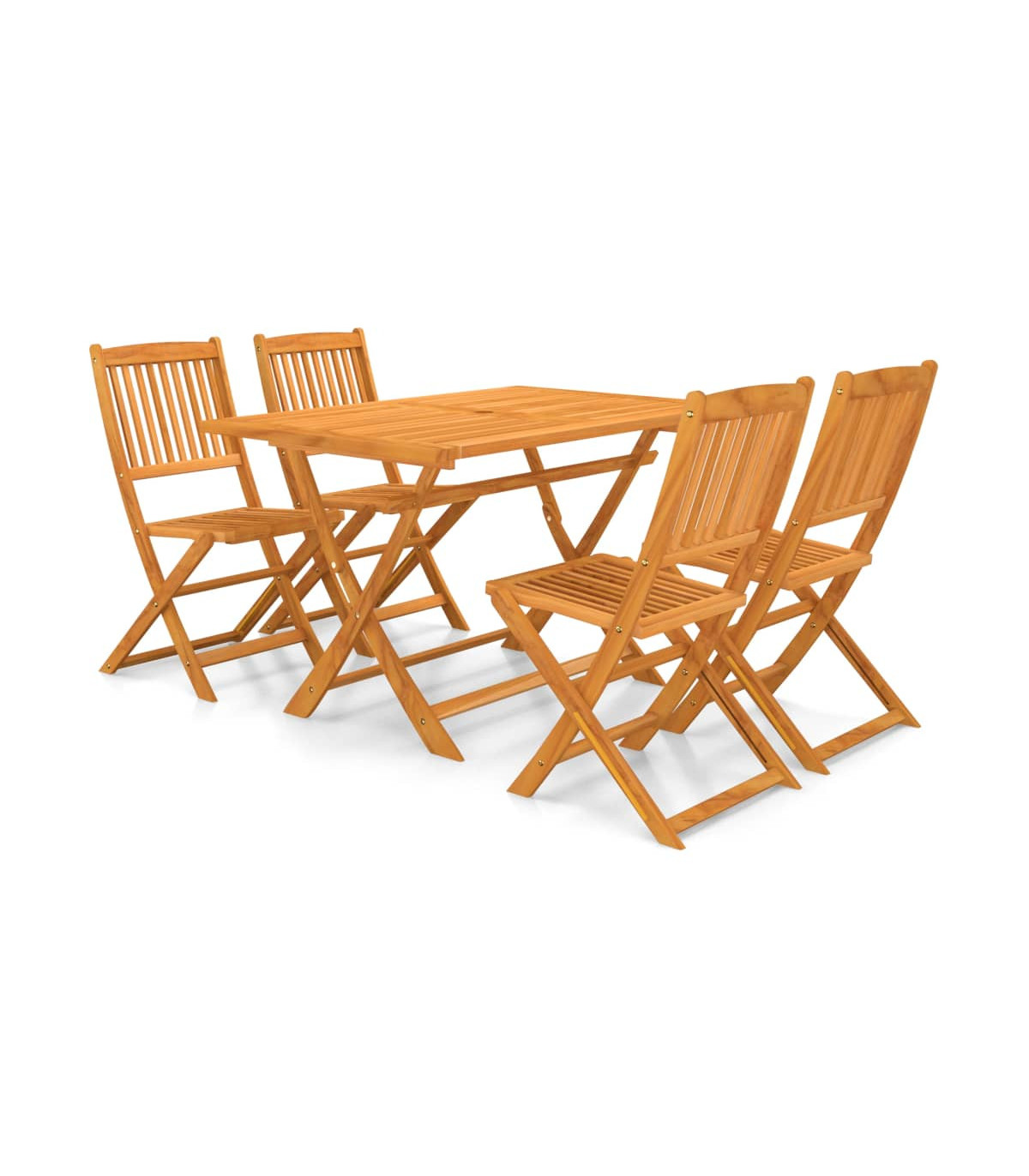 This folding outdoor dining set will be a great choice for al fresco dining in the garden or on the patio. The unique wooden structure is inviting and exudes a natural charm. The dining set is made of high-quality acacia wood, a tropical hardwood, which is weather-resistant and highly durable. The oil-finished surface is easy to clean with a damp cloth. This tabletop has a hole in its centre for holding a parasol. The table and the chairs can be folded to save space while not in use. This garden set is easy to assemble. Delivery includes 1 folding table and 4 folding chairs.