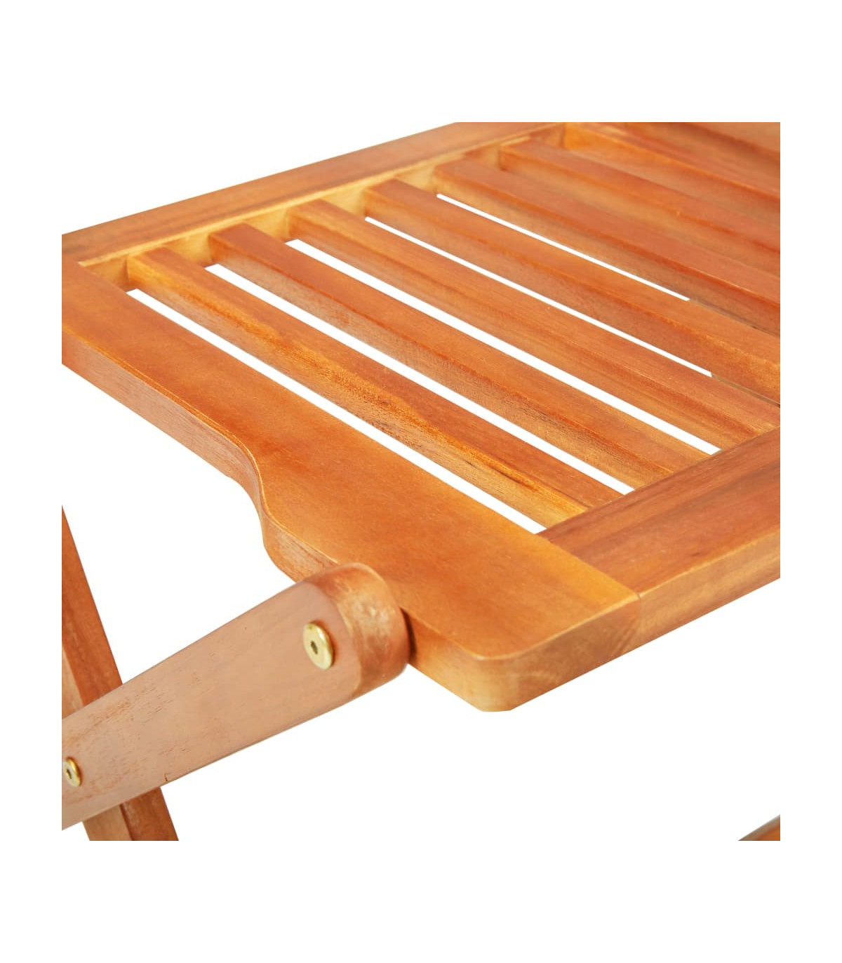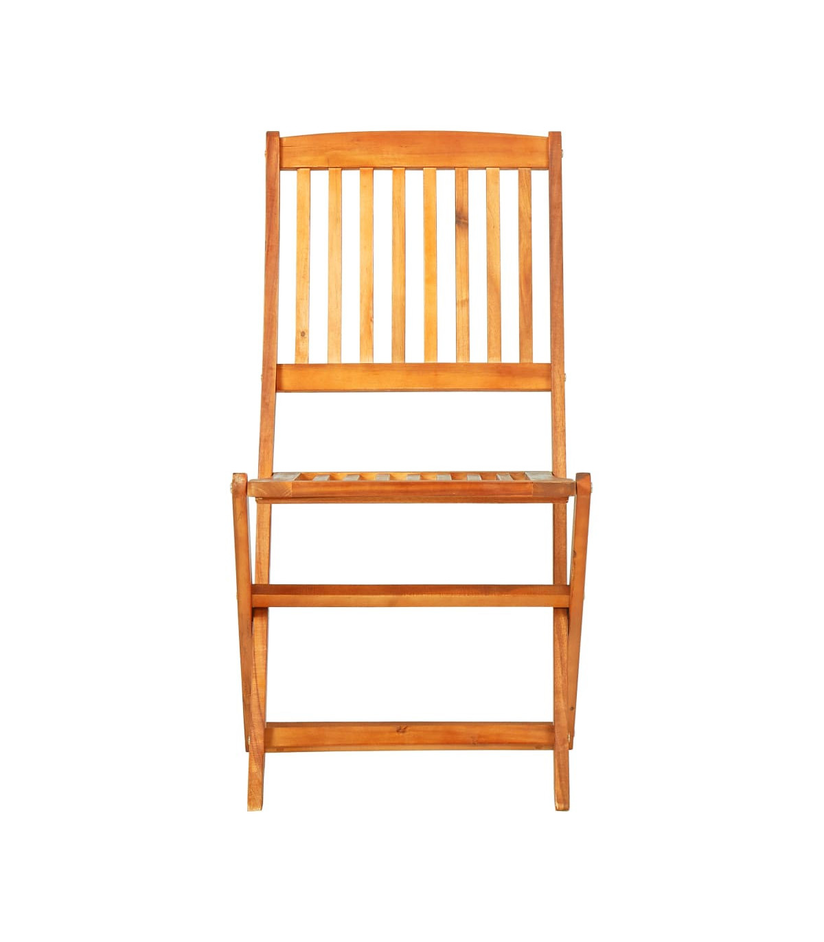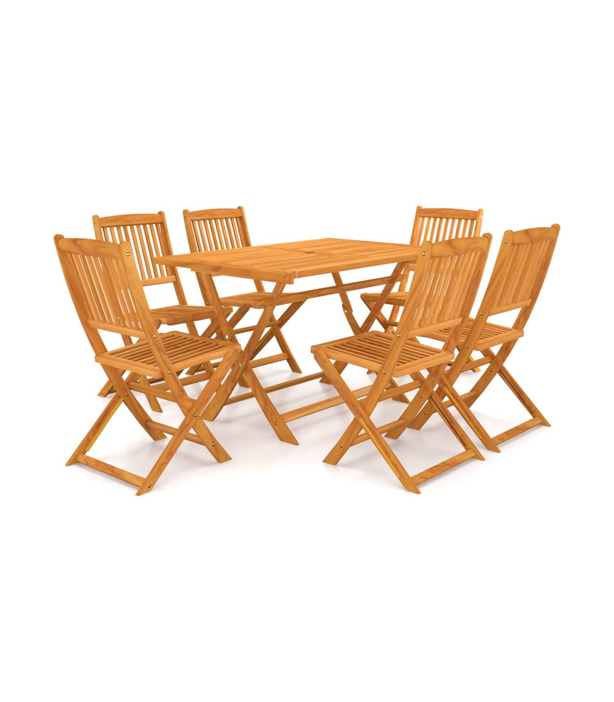 This folding outdoor dining set will be a great choice for al fresco dining in the garden or on the patio. The unique wooden structure is inviting and exudes a natural charm. The dining set is made of high-quality acacia wood, a tropical hardwood, which is weather-resistant and highly durable. The oil-finished surface is easy to clean with a damp cloth. This tabletop has a hole in its centre for holding a parasol. The table and the chairs can be folded to save space while not in use. This garden set is easy to assemble. Delivery includes 1 folding table and 4 folding chairs.