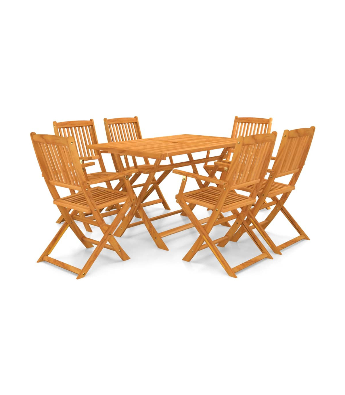 This folding outdoor dining set will be a great choice for al fresco dining in the garden or on the patio. The unique wooden structure is inviting and exudes a natural charm. The dining set is made of high-quality acacia wood, a tropical hardwood, which is weather-resistant and highly durable. The oil-finished surface is easy to clean with a damp cloth. This tabletop has a hole in its centre for holding a parasol. The table and the chairs can be folded to save space while not in use. This garden set is easy to assemble. Delivery includes 1 folding table and 4 folding chairs.