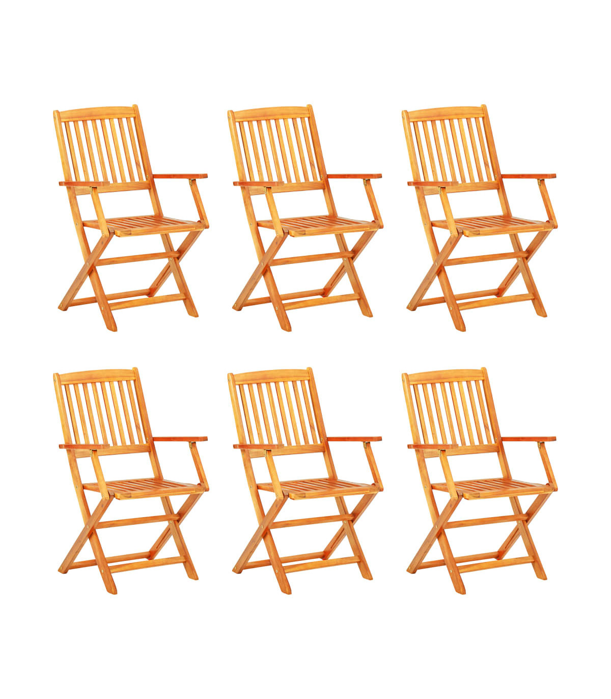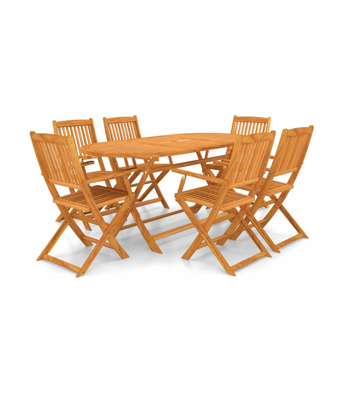 This folding outdoor dining set will be a great choice for al fresco dining in the garden or on the patio. The unique wooden structure is inviting and exudes a natural charm. The dining set is made of high-quality acacia wood, a tropical hardwood, which is weather-resistant and highly durable. The oil-finished surface is easy to clean with a damp cloth. This tabletop has a hole in its centre for holding a parasol. The table and the chairs can be folded to save space while not in use. This garden set is easy to assemble. Delivery includes 1 folding table and 6 folding chairs.