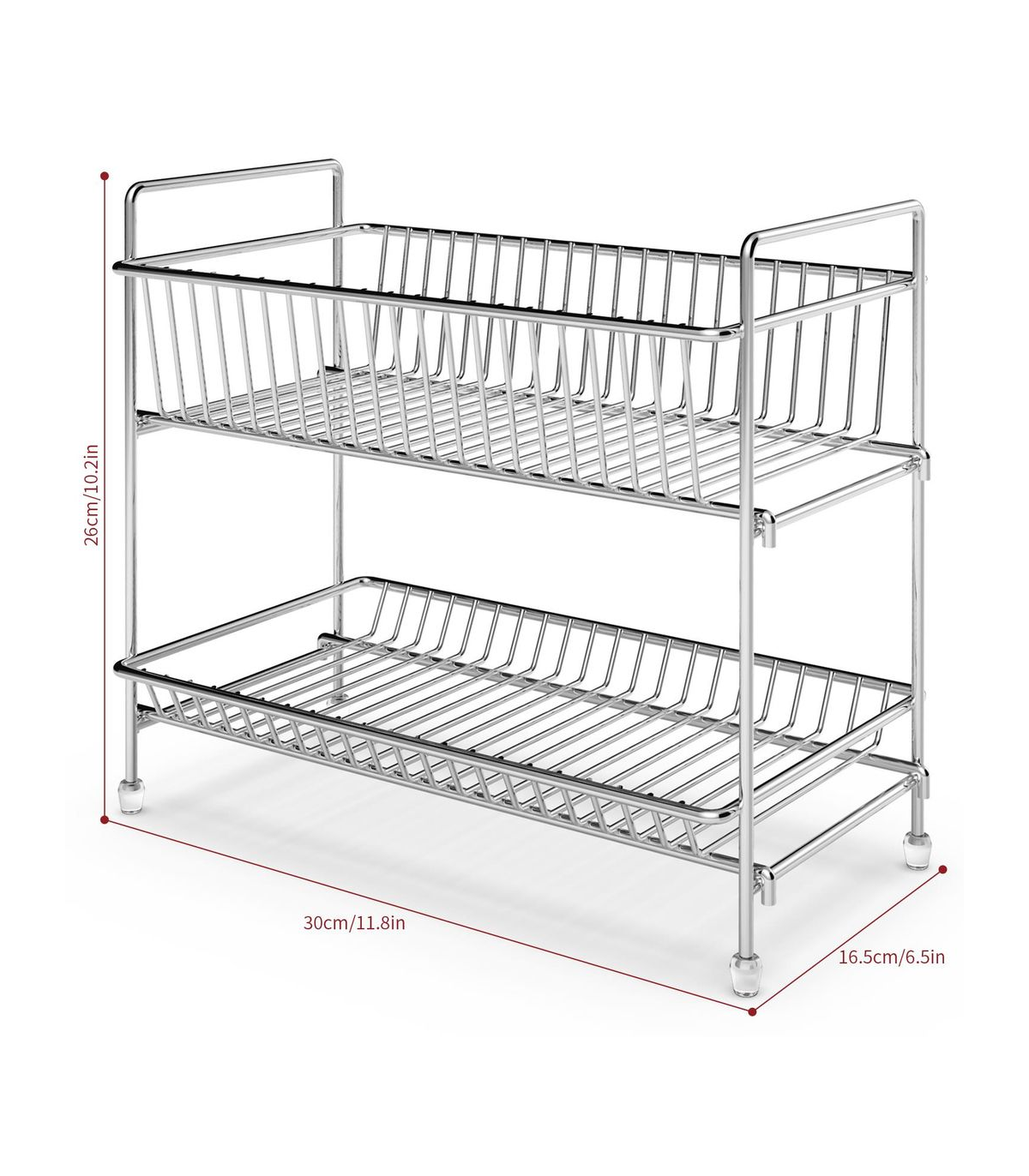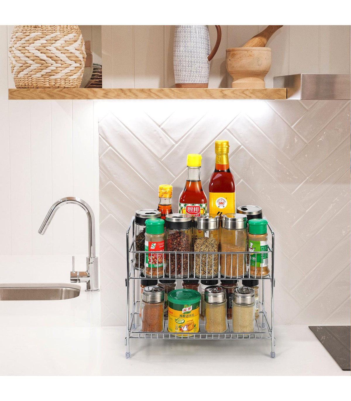 SPACE SAVER: Our 2-tier free-standing spice rack organiser measures 26 x 30 x 16.5 cm approx. (10.2 x 11.8 x 6.5 in) makes it an ideal choice as your organiser solution as it creates more space and makes your house orderly and tidy. Perfect for organizing anywhere in your kitchen, bathroom, cabinets, countertops, pantries, cupboard, fridge.