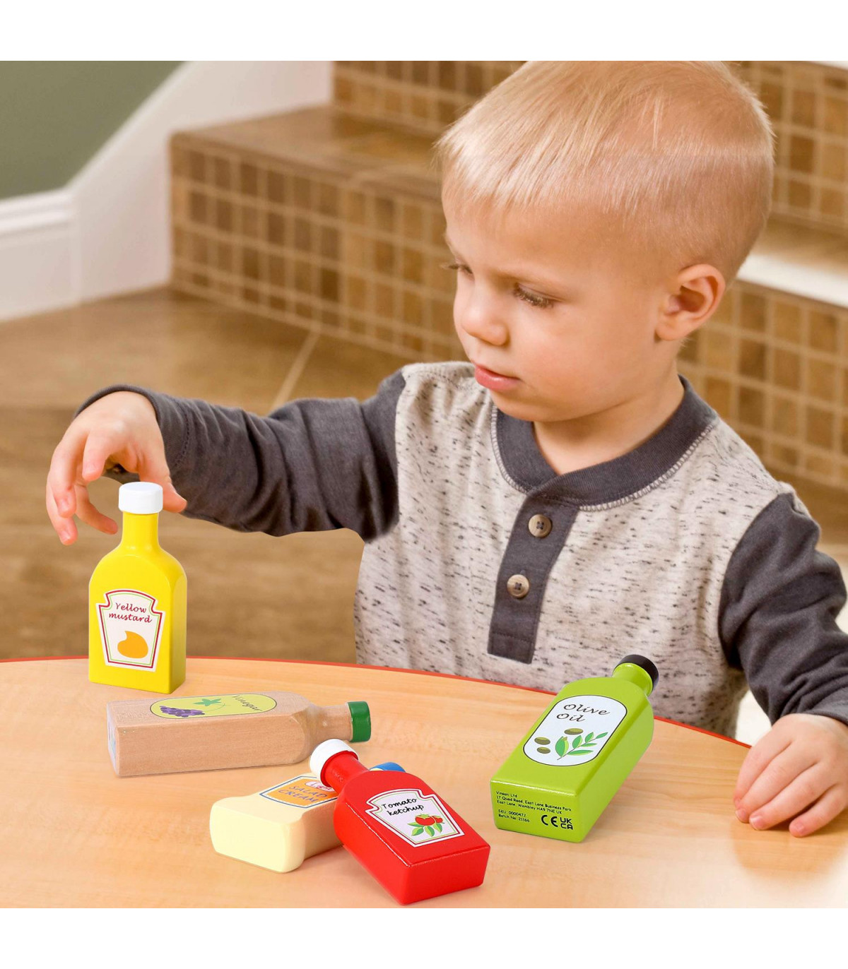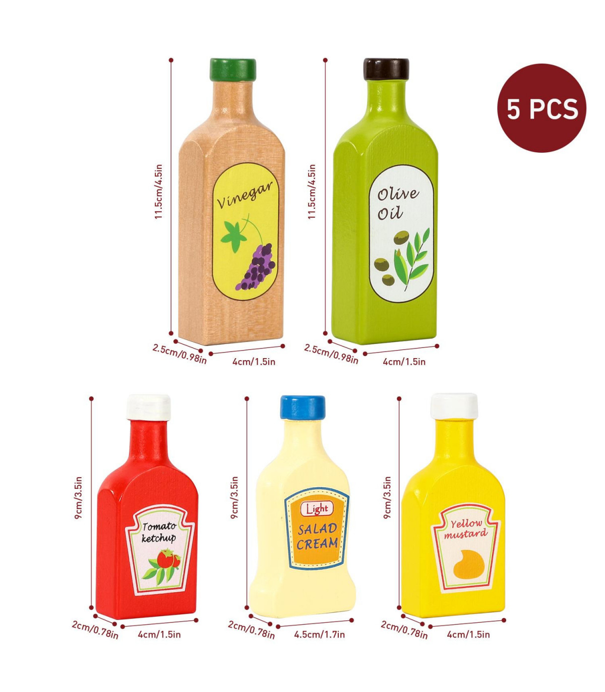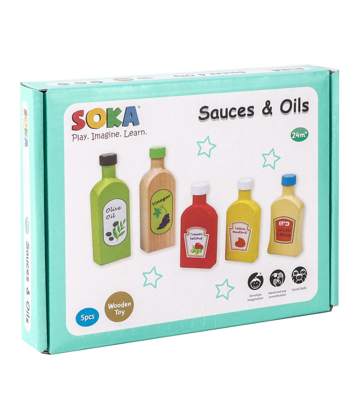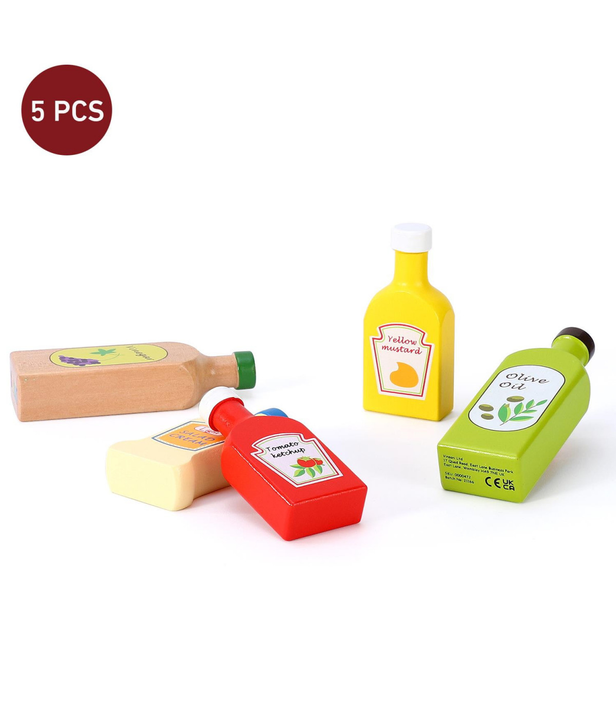 COLOURFUL VARIETY: This Lovely Wooden Sauces & Oils bottle set consists of 5 brightly coloured wooden bottles; 1 x Ketchup, 1 x yellow mustard, 1 x salad cream, 1 x olive oil, 1 x vinegar. EDUCATIONAL TOY: Encourage creativity in your child with SOKA Sau