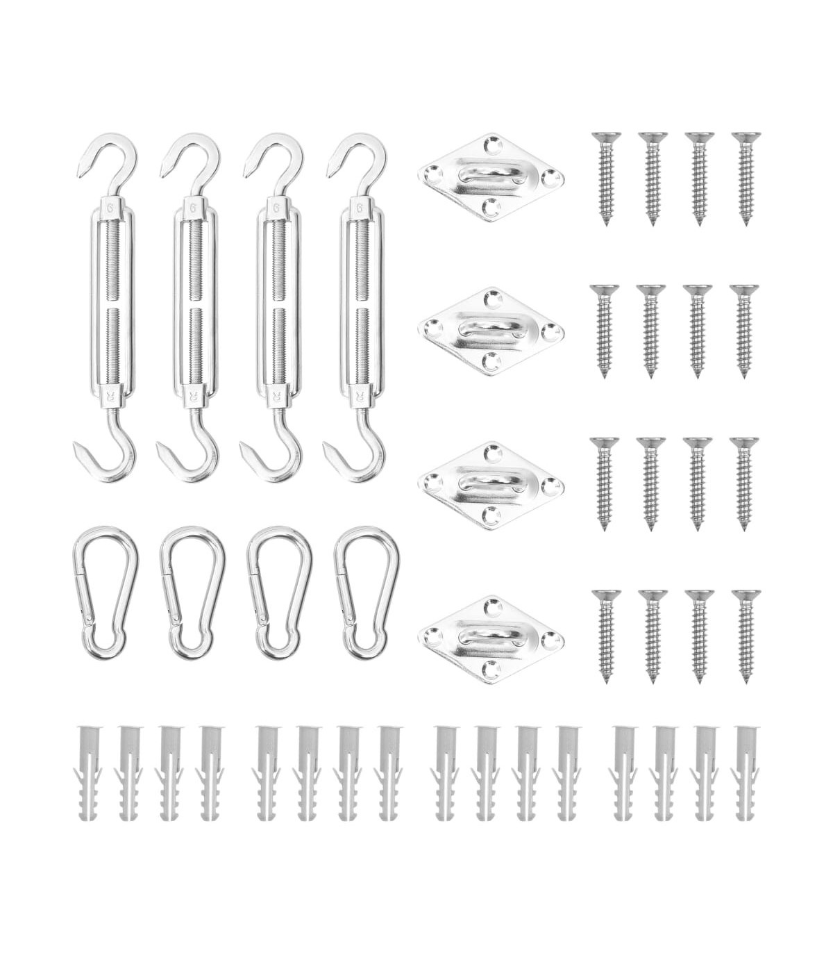 Create your favorite relaxation spot with this sunshade sail accessory set. The stainless steel fitting set is easy to use and perfect for most kinds of shade sails. Once the pad eyes are attached to a stable wall, the sunshade sail can be clipped on with the carabiners. They are also very easy to remove. Additionally, the turnbuckle is adjustable, which makes it easy to tighten or loosen the sun shade.