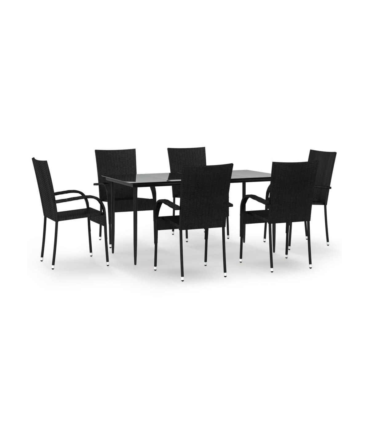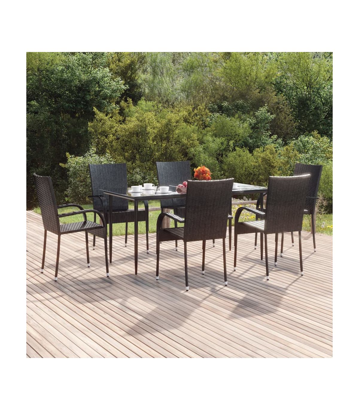 This garden dining set is a great choice for dining or relaxing in the outdoor space! Durable material: PE rattan, also known as poly rattan, is weather resistant and easy to clean. It remains beautiful on the outside for a long period of time. It offers great quality, convenience and an aesthetic look.Sturdy frame: The powder-coated steel frames make the outdoor dining set sturdy and stable for daily outdoor use.Practical tabletop: The smooth tabletop of the dining table is made of tempered glass which is easy to clean with a damp cloth. Additionally, the sturdy tabletop is perfect for placing meals, drinks, and other decorative items.Flexible design: Thanks to the lightweight construction, these outdoor chairs are easy to move and can be stacked to save space when not in use. Note:In order to extend the life of your outdoor furniture, we recommend you to protect it with a waterproof cover.Each product comes with an assembly manual in the box for easy assembly.