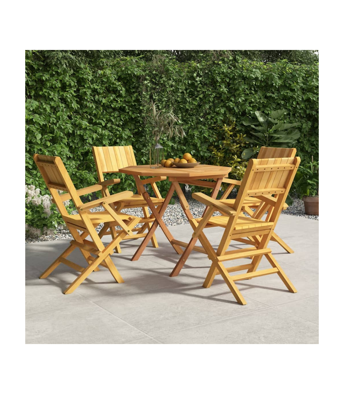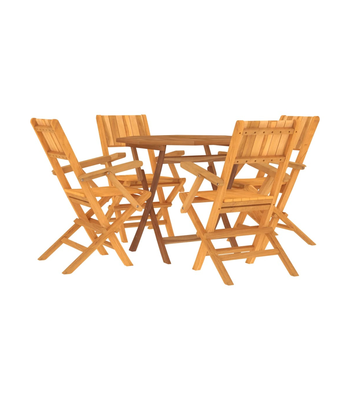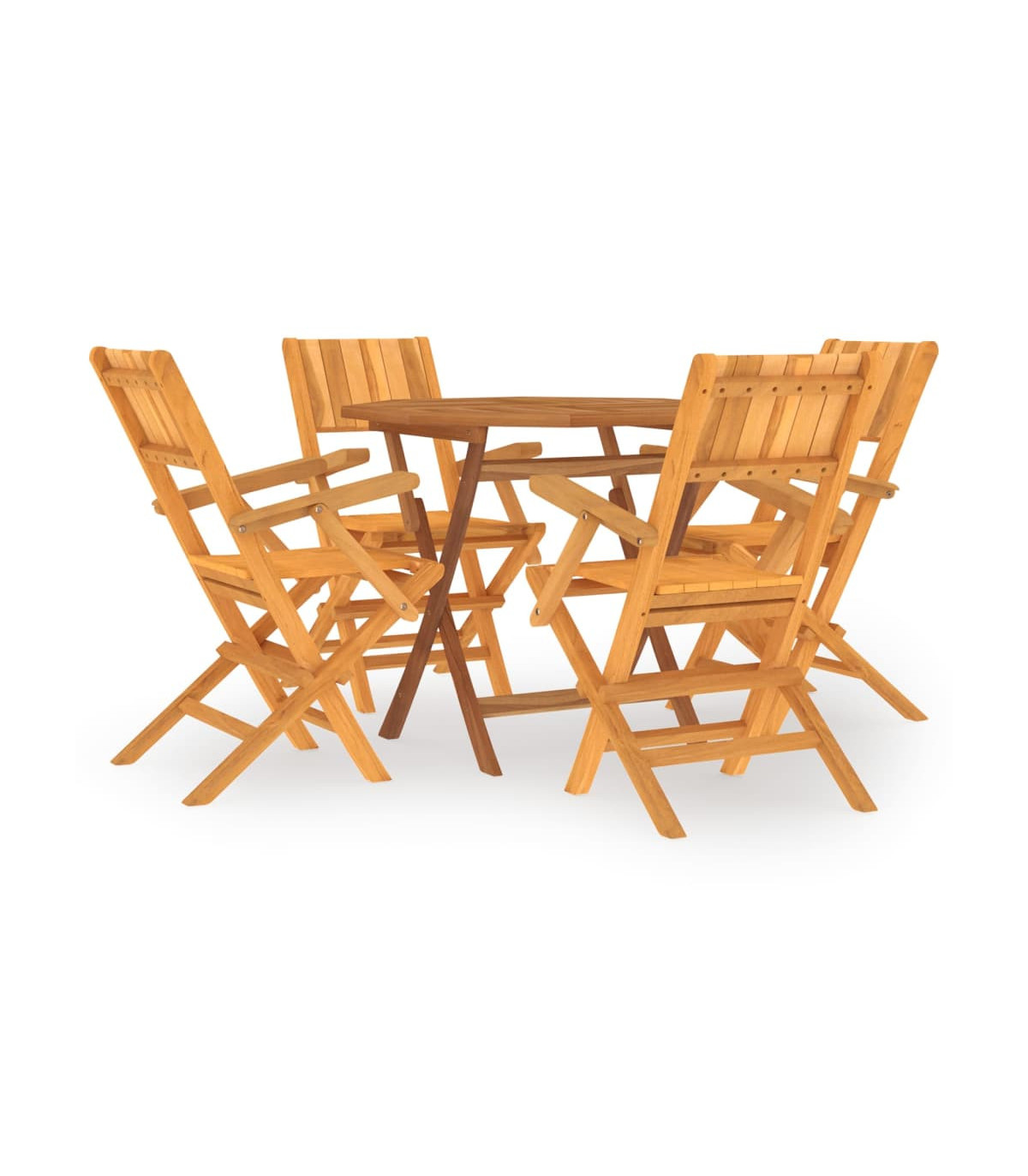 Relax and enjoy a lovely afternoon tea and meals with your family and friends with this classic wooden garden dining set! Solid teak wood: The dining set is made of solid teak wood. Solid teak wood is a beautiful natural material. It has been seasoned, kiln dried and then fine sanded to give a very smooth appearance. Teak wood is known for its exceptional strength and weather resistance.Foldable function: The outdoor dining set can be folded to save space when not in use.Comfortable experience: The backrest of the garden dining chair gives you excellent support, providing an optimal comfortable experience.Sturdy tabletop: The sturdy tabletop of the dining table is perfect for placing meals, drinks, vases, fruit bowls, or other decorative items.Parasol hole: There is a parasol hole in the tabletop so you can easily attach a parasol to create a shady spot.Slatted design: The outdoor dining chair designed with a slatted design looks simple and timeless. Note:To make sure your outdoor furniture stays beautiful, we recommend protecting it with a waterproof cover.