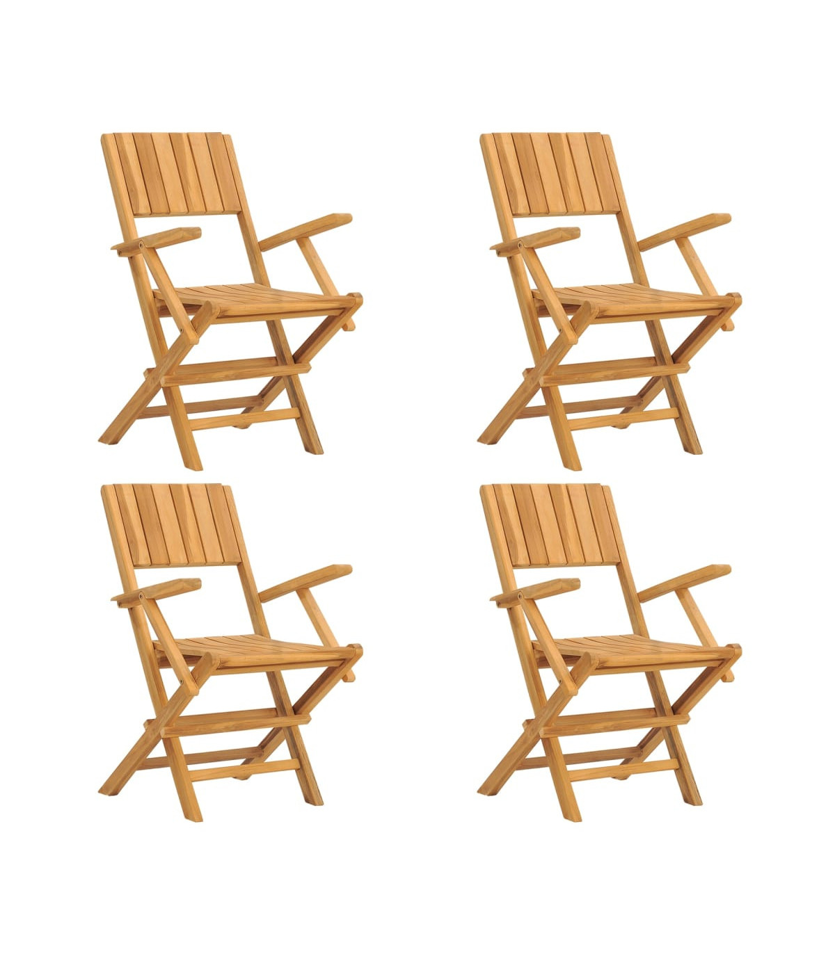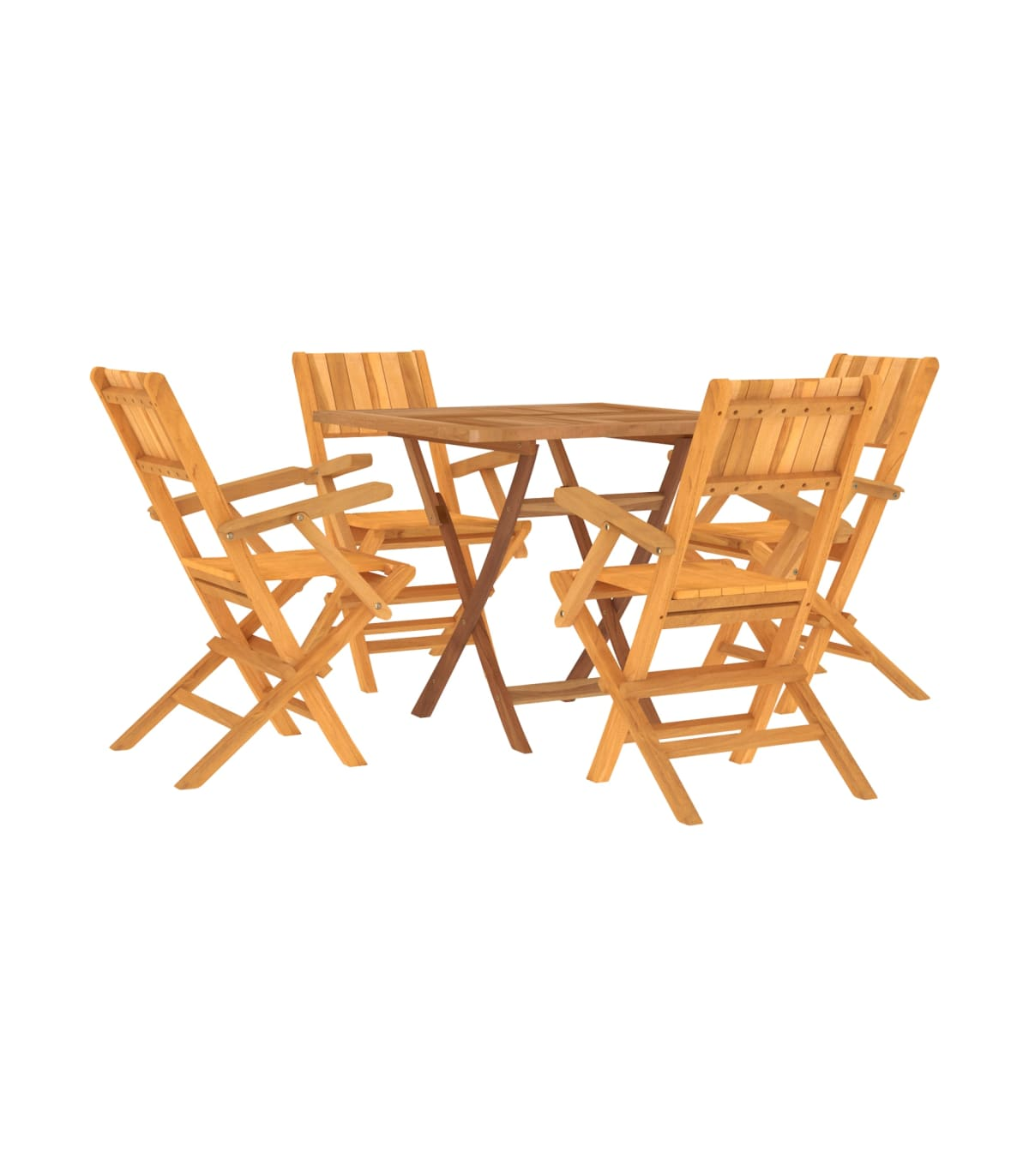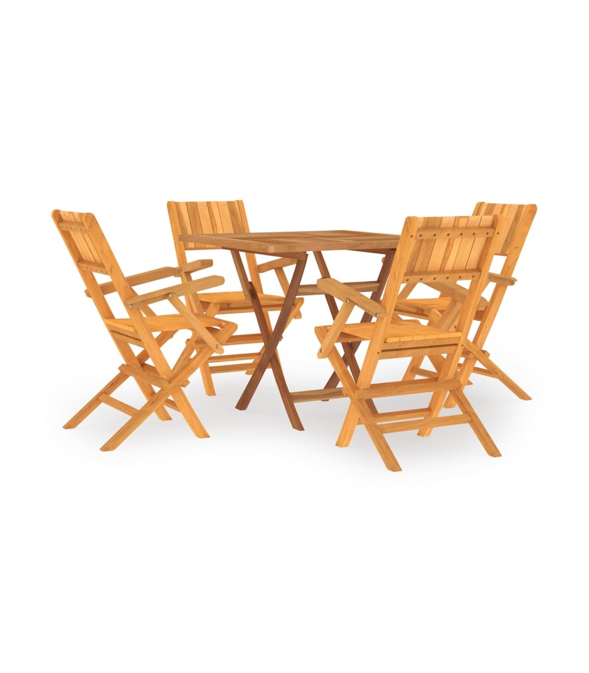 Relax and enjoy a lovely afternoon tea and meals with your family and friends with this classic wooden garden dining set! Solid teak wood: The dining set is made of solid teak wood. Solid teak wood is a beautiful natural material. It has been seasoned, kiln dried and then fine sanded to give a very smooth appearance. Teak wood is known for its exceptional strength and weather resistance.Foldable function: The outdoor dining set can be folded to save space when not in use.Comfortable experience: The backrest of the garden dining chair gives you excellent support, providing an optimal comfortable experience.Sturdy tabletop: The sturdy tabletop of the dining table is perfect for placing meals, drinks, vases, fruit bowls, or other decorative items.Parasol hole: There is a parasol hole in the tabletop so you can easily attach a parasol to create a shady spot.Slatted design: The outdoor dining chair designed with a slatted design looks simple and timeless. Note:To make sure your outdoor furniture stays beautiful, we recommend protecting it with a waterproof cover.