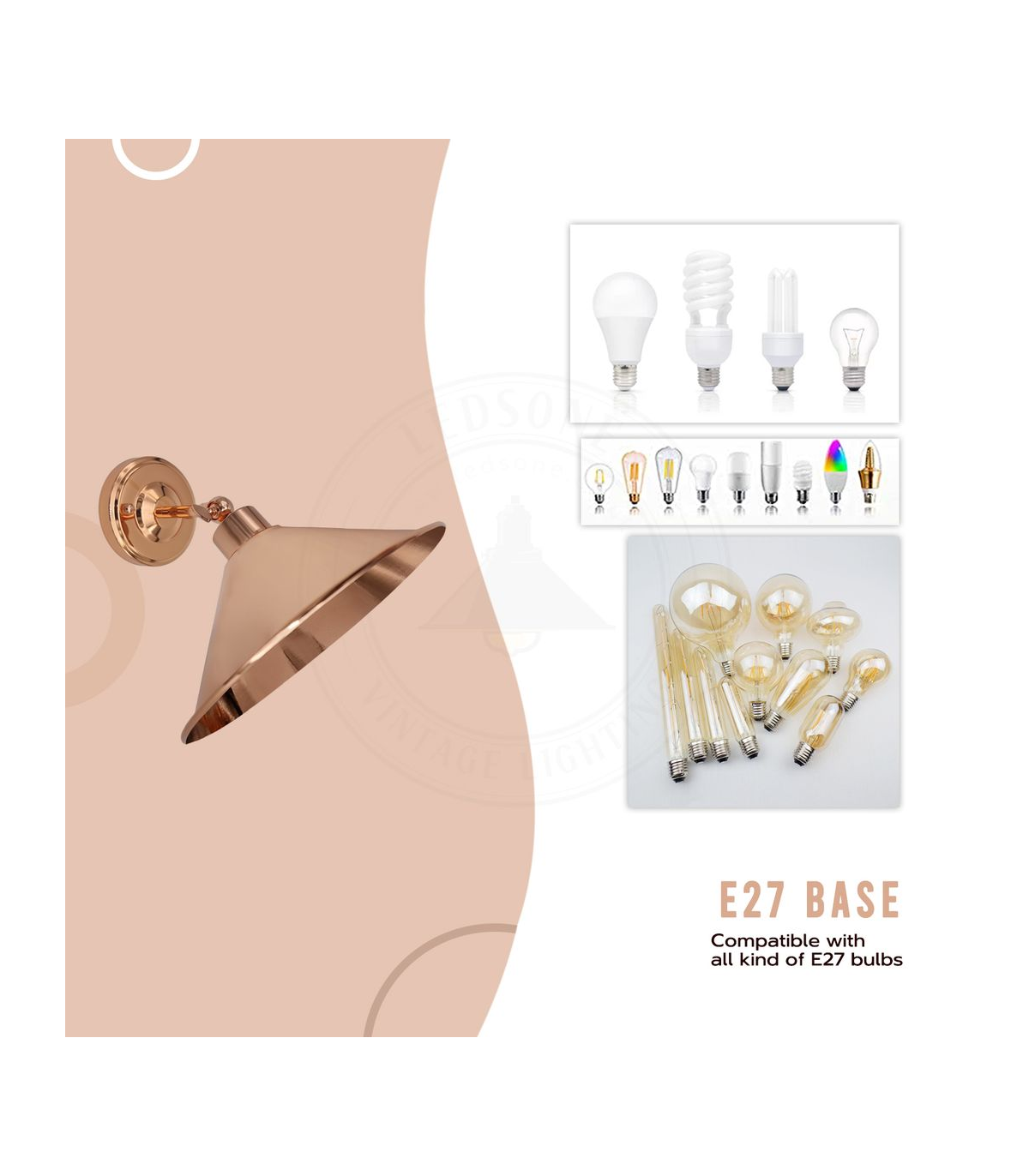 Features: This bowl shaped sturdy metal shade decorate the spaces with the vintage style with the retro elegant touch, let the home be everywhere, warm and comfortable. Not only lighting but also decorating your house, It will make your space more interesting and attractive. Comes with standard E27 Edison bulb light socket. Has 3 year manufacturer warranty. Ideal for living rooms, lounges, bedrooms, home offices, studies, studios, apartments, hotels, restaurants, cafes and more! Item Specifications / Technical Details: Item Type: Wall light Style: Vintage/Retro Voltage: AC110V-240V Lamp holder quantity: 1 Material: Sturdy metal Bulb Requirements: Requires E27 max 60W Bulb Type: Compatible with all kinds of E27 Bulbs Installation Area: Indoor Power Source: Hardwired Dimmable: Yes (required a dimmable bulb and dimmer switch) Energy consumption: A+ with LED bulb Sloped ceiling adaptable Package included: 1 x Ceiling rose and accessories. 1 x Lamp shade. 1 x Lamp holder. ​