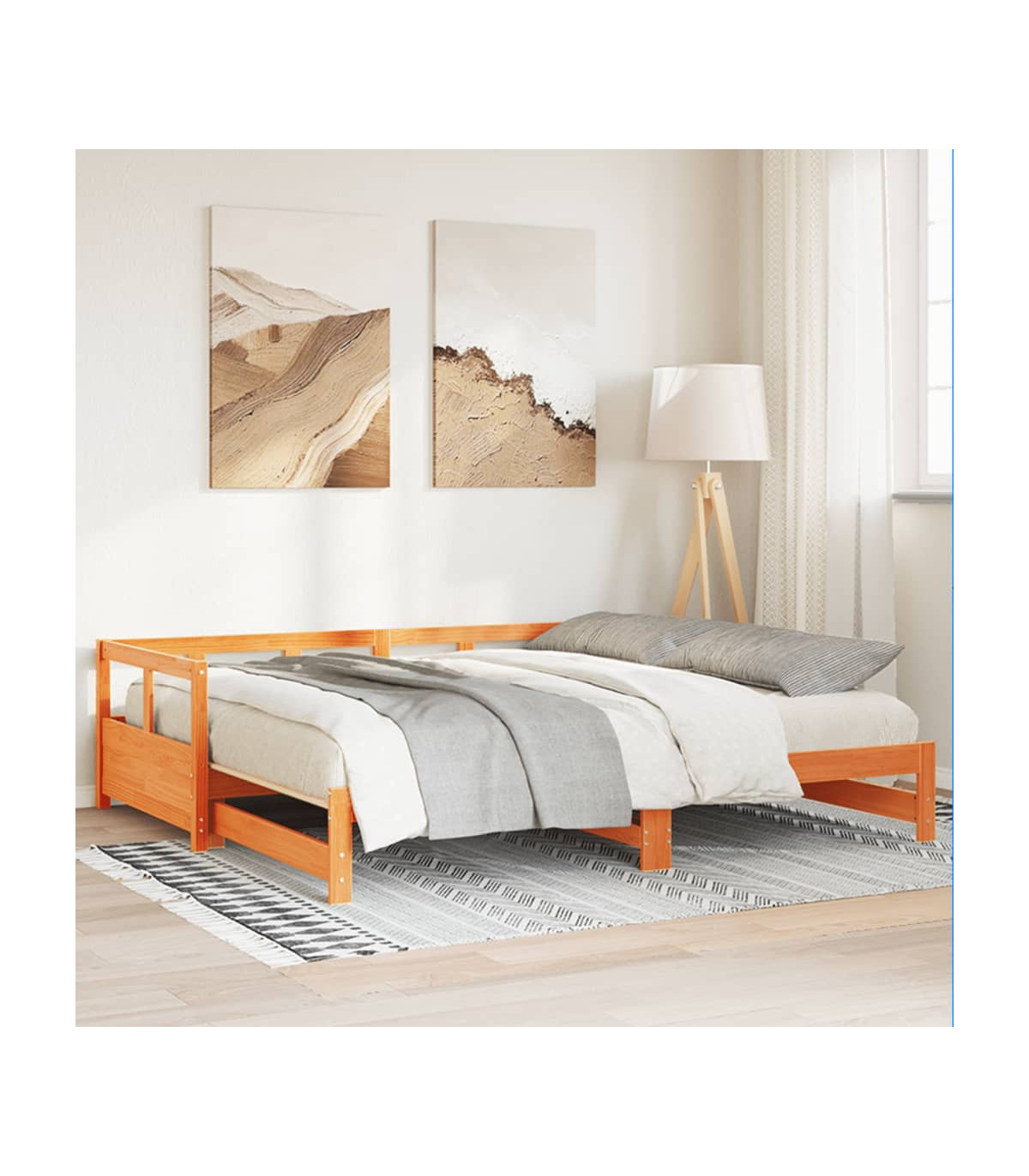 This 2-in-1 daybed with trundle, serving as both a sofa and bed, makes a practical and eye-catching addition to your living room or bedroom.Stable and long-lasting frame: Solid pinewood is known for its strength and durability. Its straight grains and distinctive knots contribute to its rustic charm.Versatile daybed: The sofa bed functions as a sofa during the day and easily converts into a double bed at night by pulling out the trundle, providing a convenient solution for hosting guests and maximising space.Slatted base for optimal support: The bed frame is equipped with a slatted base for support and breathability for your mattress.Stable and durable legs: This bed is supported by sturdy legs, ensuring stability, safety, and firmness.Good to know:The delivery includes a daybed frame only. The mattress is not included. You can check our shop for the matching mattresses.