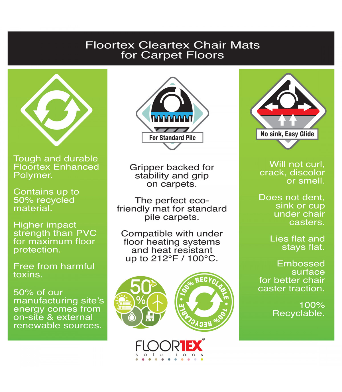 Cleartex Evolutionmat clear chair mats are manufactured from enhanced polymer for the best performing eco-friendly range available, providing excellent clarity, ergonomic performance and durability. High impact strength for excellent easy glide rolling, Evolutionmat protectors will not cup, crack, curl, discolour or smell.