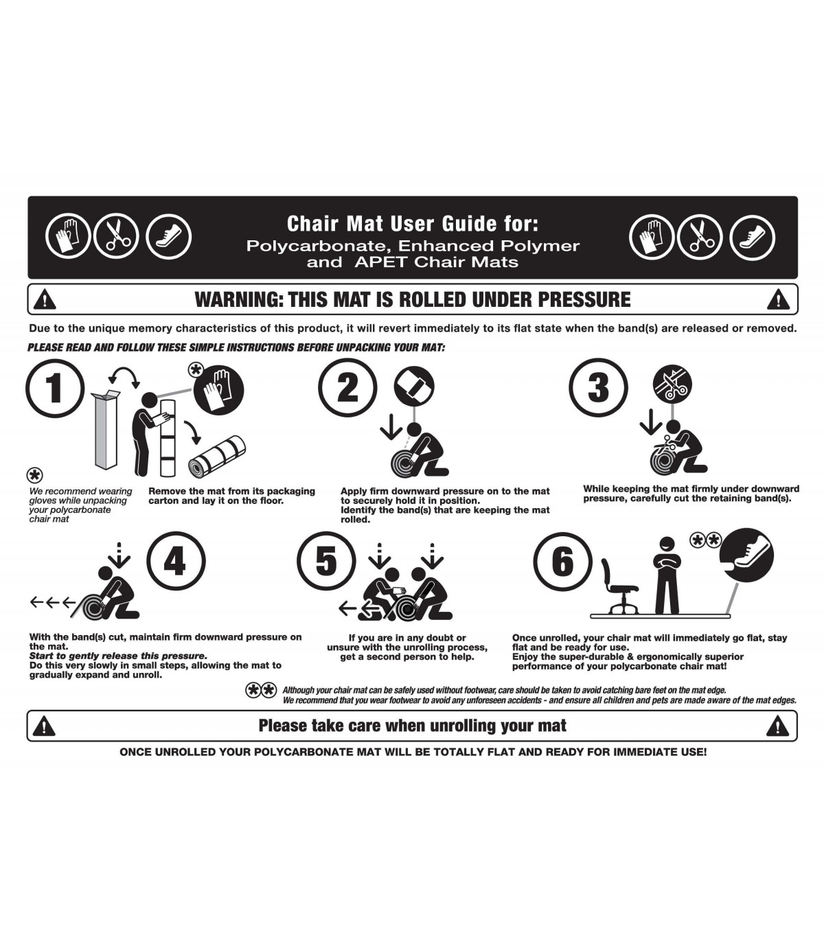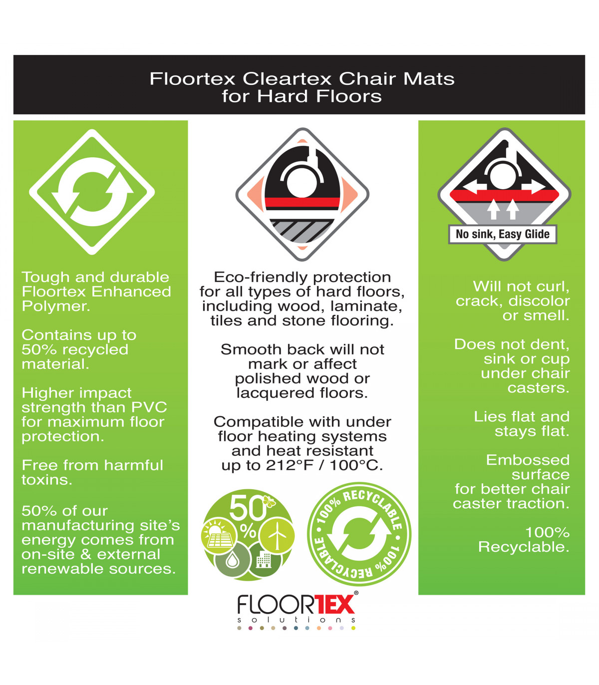 Cleartex Evolutionmat clear chair mats are manufactured from enhanced polymer for the best performing eco-friendly range available, providing excellent clarity, ergonomic performance and durability. High impact strength for excellent easy glide rolling, Evolutionmat protectors will not cup, crack, curl, discolour or smell.