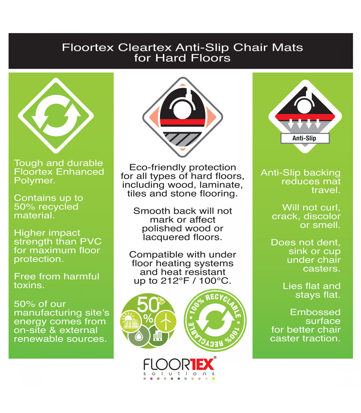 Cleartex Evolutionmat clear chair mats are manufactured from enhanced polymer for the best performing eco-friendly range available, providing excellent clarity, ergonomic performance and durability. High impact strength for excellent easy glide rolling, Evolutionmat protectors will not cup, crack, curl, discolour or smell.