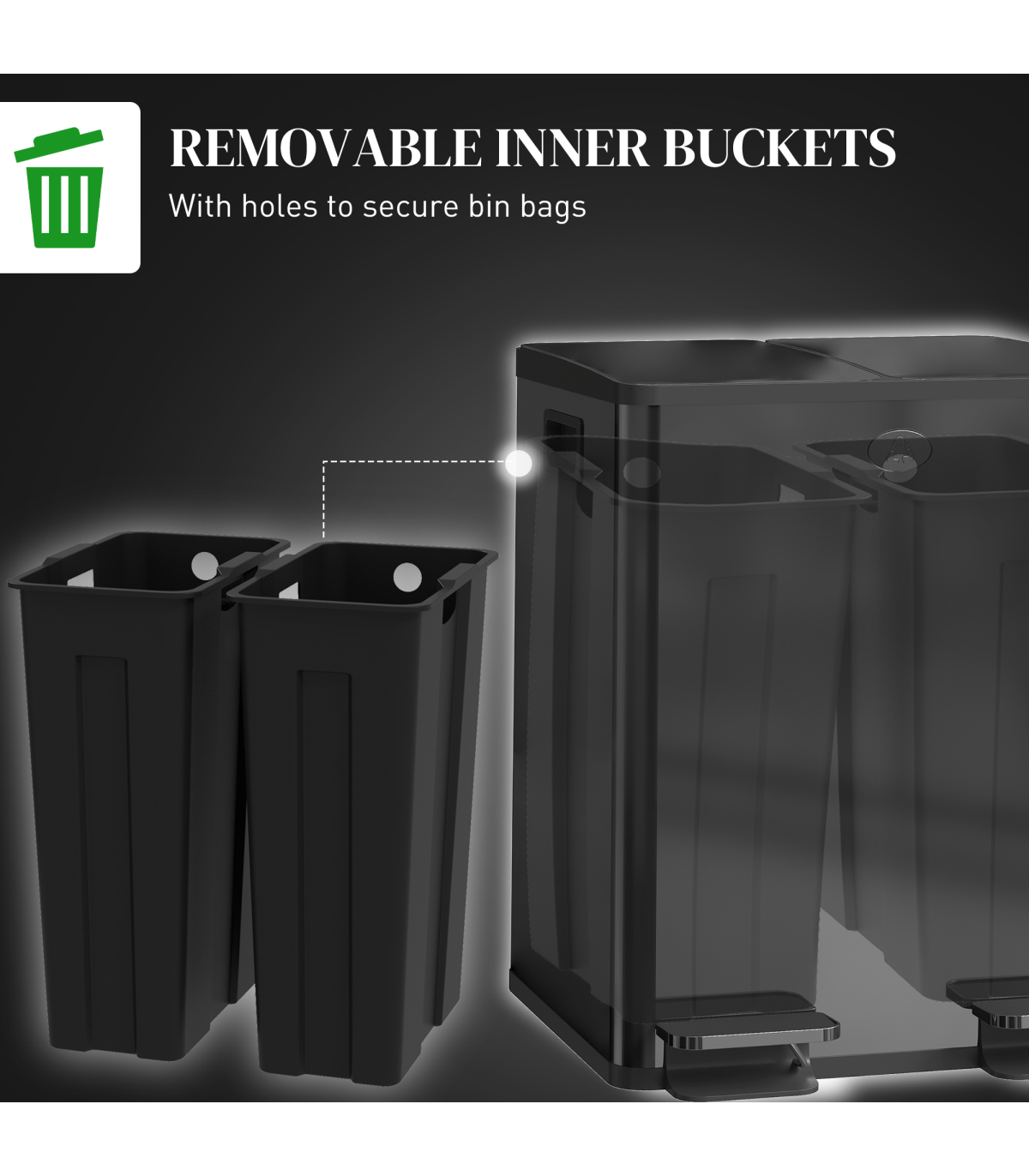 ● Removable inner buckets, with a hole to fix bin bag for easy cleaning