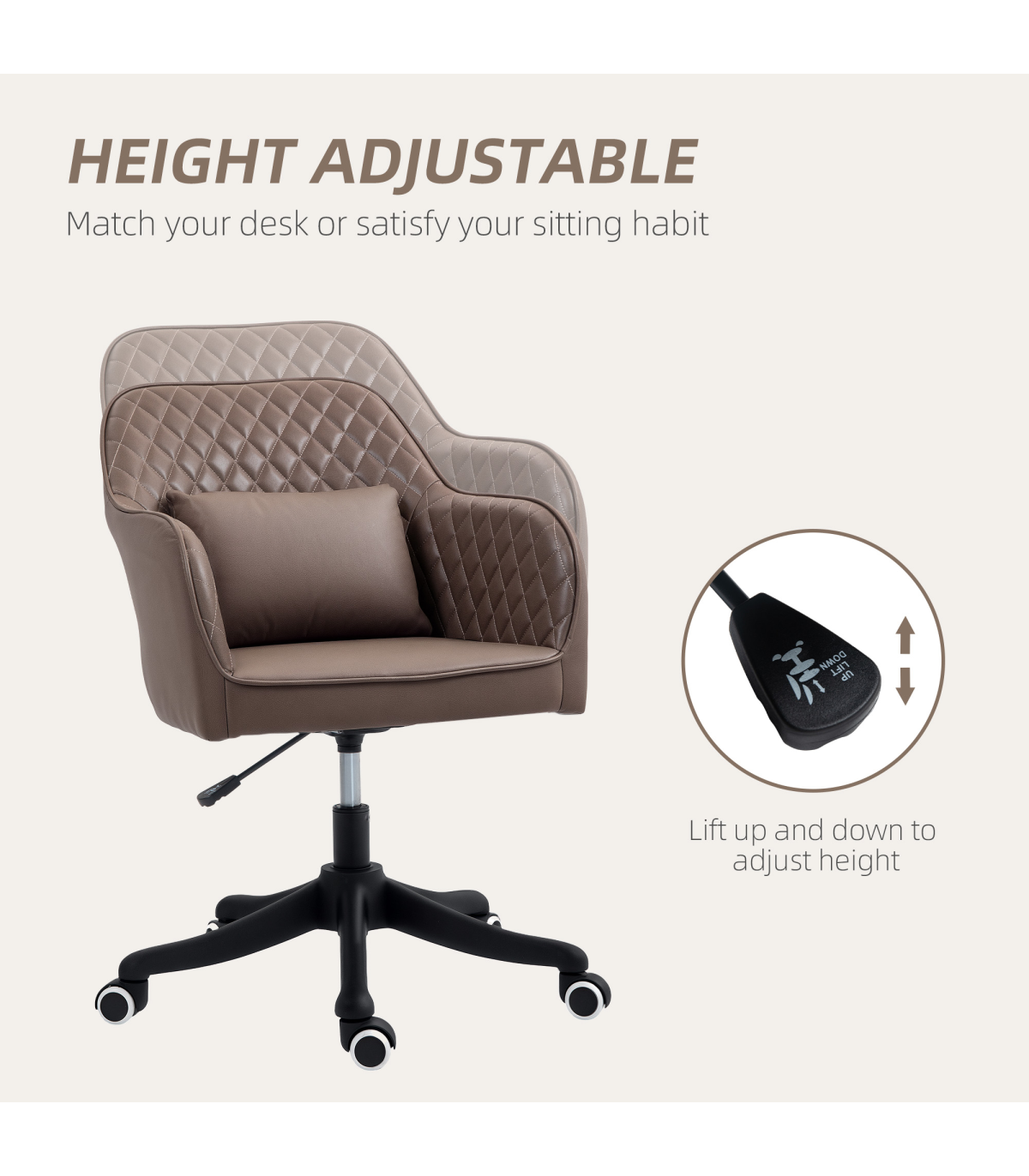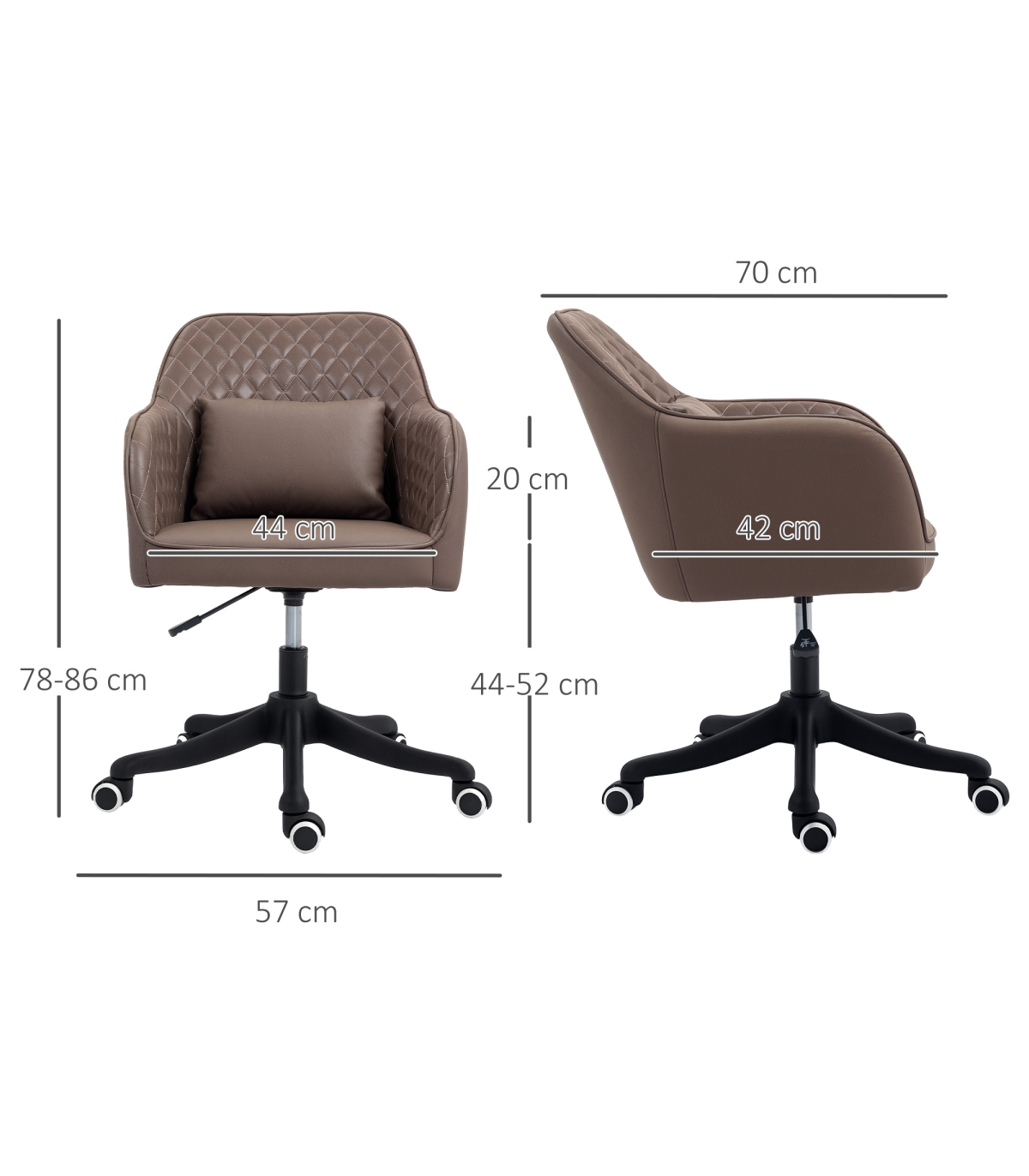 ● Dimensions: 78-86H x 57W x 70Dcm. Seat: 44-52H x 44W x 42Dcm. Back: 42Hcm. Armrest to seat: 20cm. ● Power Cord: 1.2m