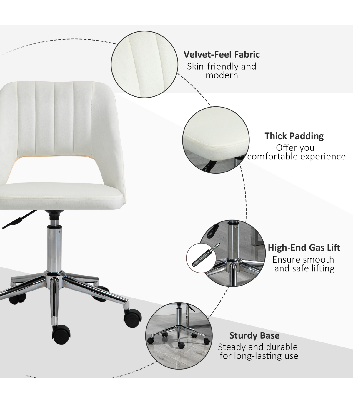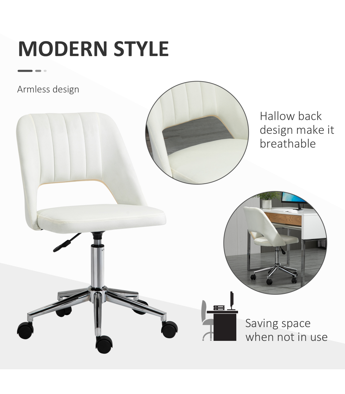 Sometimes we need to bring sophistication into the workday. And now it's easy with this Vinsetto office chair. Crafted into an armless design for a simplistic look, with plenty of sitting room, the comfy chair is wrapped in velvet-feel upholstery - a beautiful look and feel. Both the back and seat are filled with sponge for comfort, with the backrest providing support. The swivel seat moves with your body motions as you work, finished with five wheels on the base.