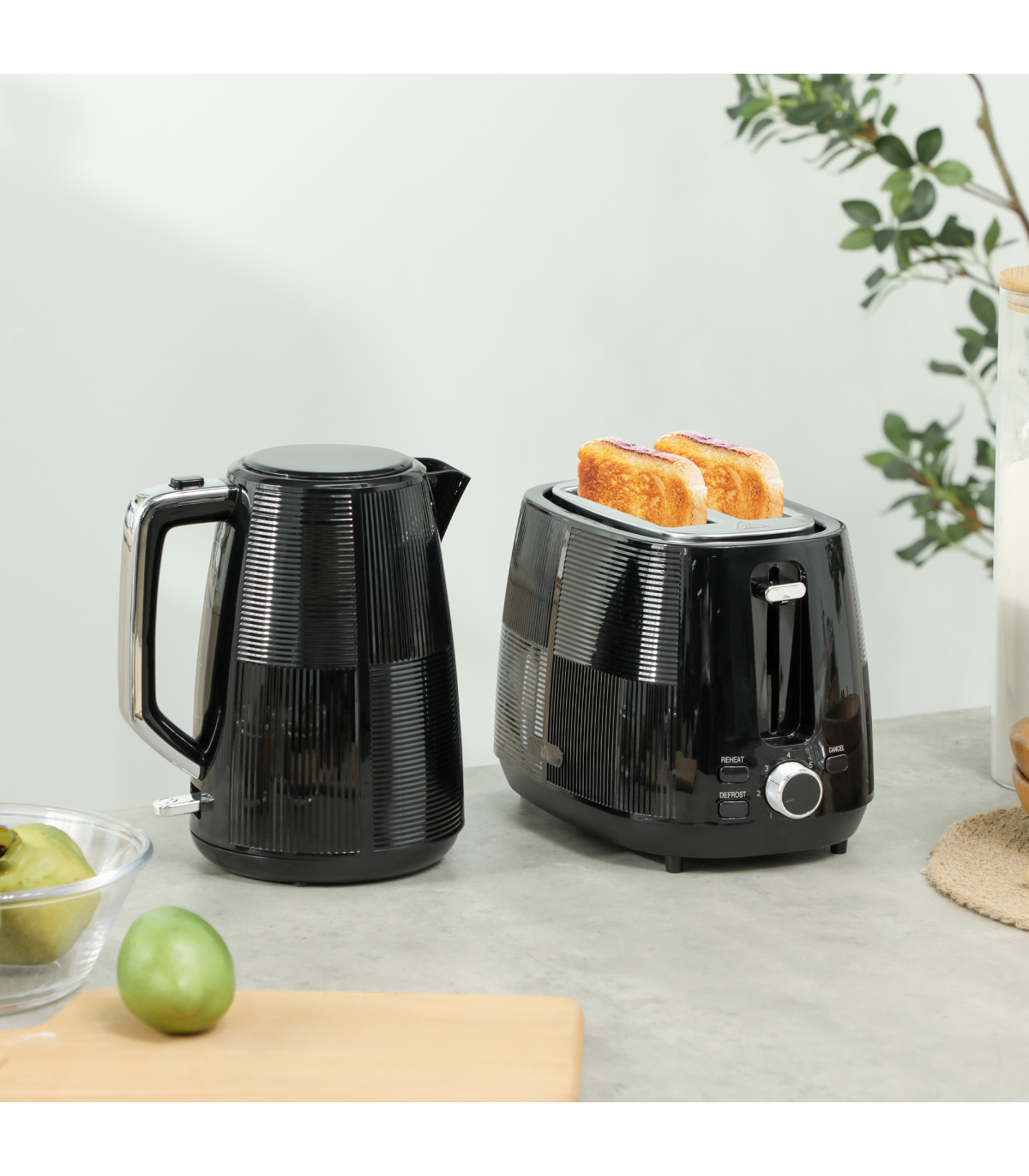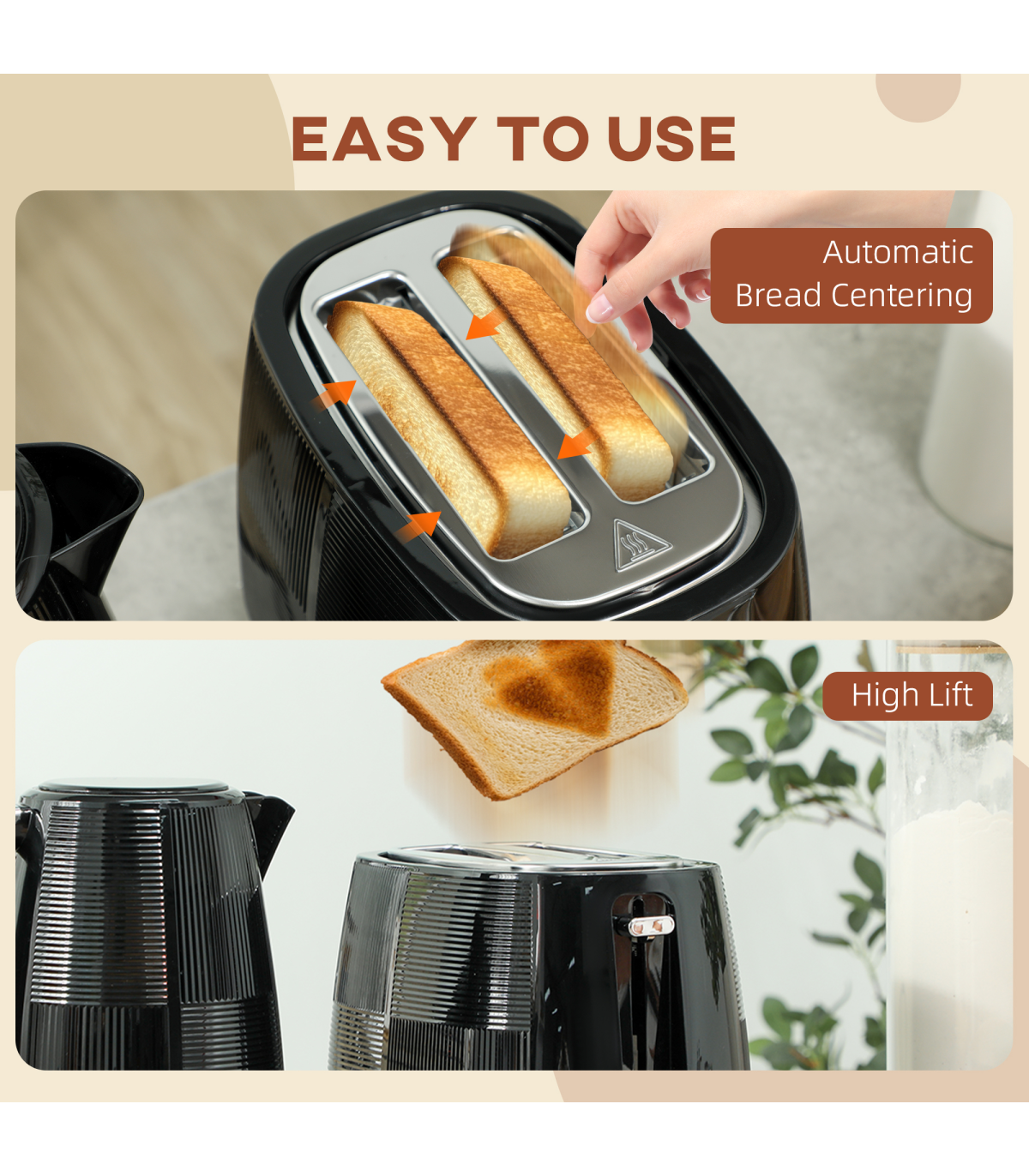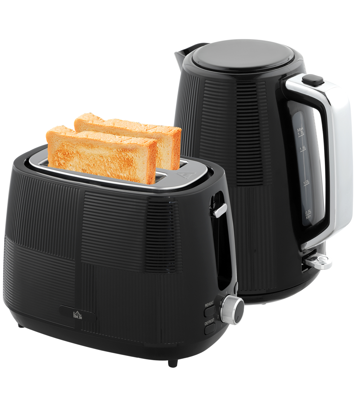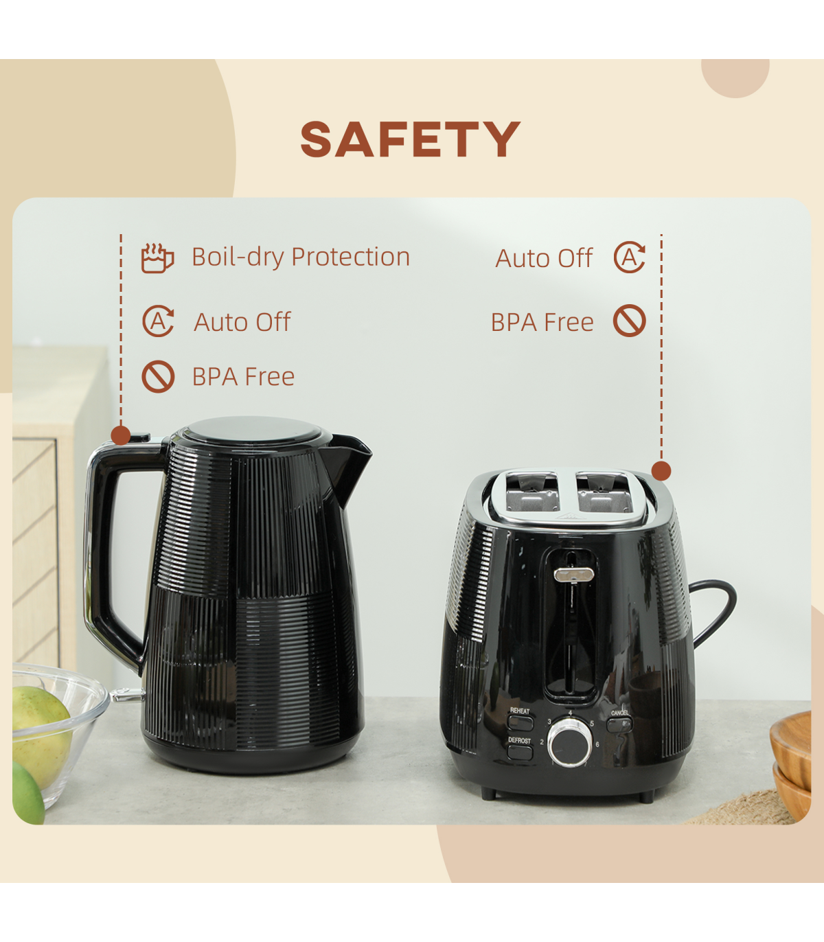 ● Kettle includes boil-dry protection and auto shut-off features. Toaster automatically centres and shuts off if jammed