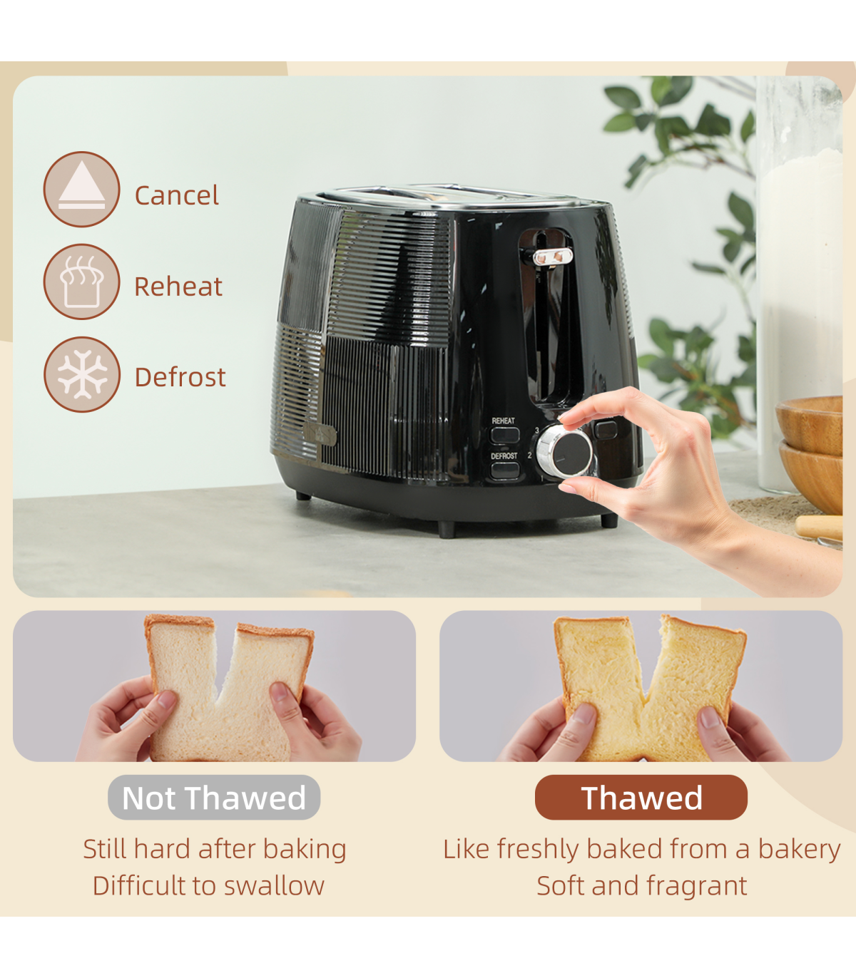 ● Toaster features reheat, defrost and cancel functions. High lift design on toaster eases small slice removal
