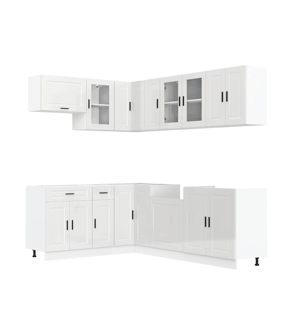 This 11-piece kitchen cabinet set, with its elegant design, optimises your kitchen space and provides ample storage space for your personal belongings! Stable and durable material: Engineered wood is a durable and stable material with a smooth surface that is resistant to moisture, warping, and splitting, making it a reliable choice for a variety of projects.Ample storage space: The kitchen cabinet set has many compartments, and offers sufficient space to store bowls, plates, pots, and other kitchen appliances.Adjustable feet: The bottom cabinets feature adjustable feet that can be adjusted in height to suit your kitchen layout.Easy to maintain: Thanks to its smooth surface, these kitchen cabinets are easy to clean with a damp cloth and require less maintenance. Warning:To prevent it from tipping over, this product must be used with the provided wall attachment device. Good to know:Screw(s) and plug(s) for inside the wall are not included. Seek and use screw(s) and plug(s) suitable for your walls. If you are uncertain, seek professional advice. Read and follow each step of the instruction carefully.The worktop, sink and faucet are not included in the delivery.