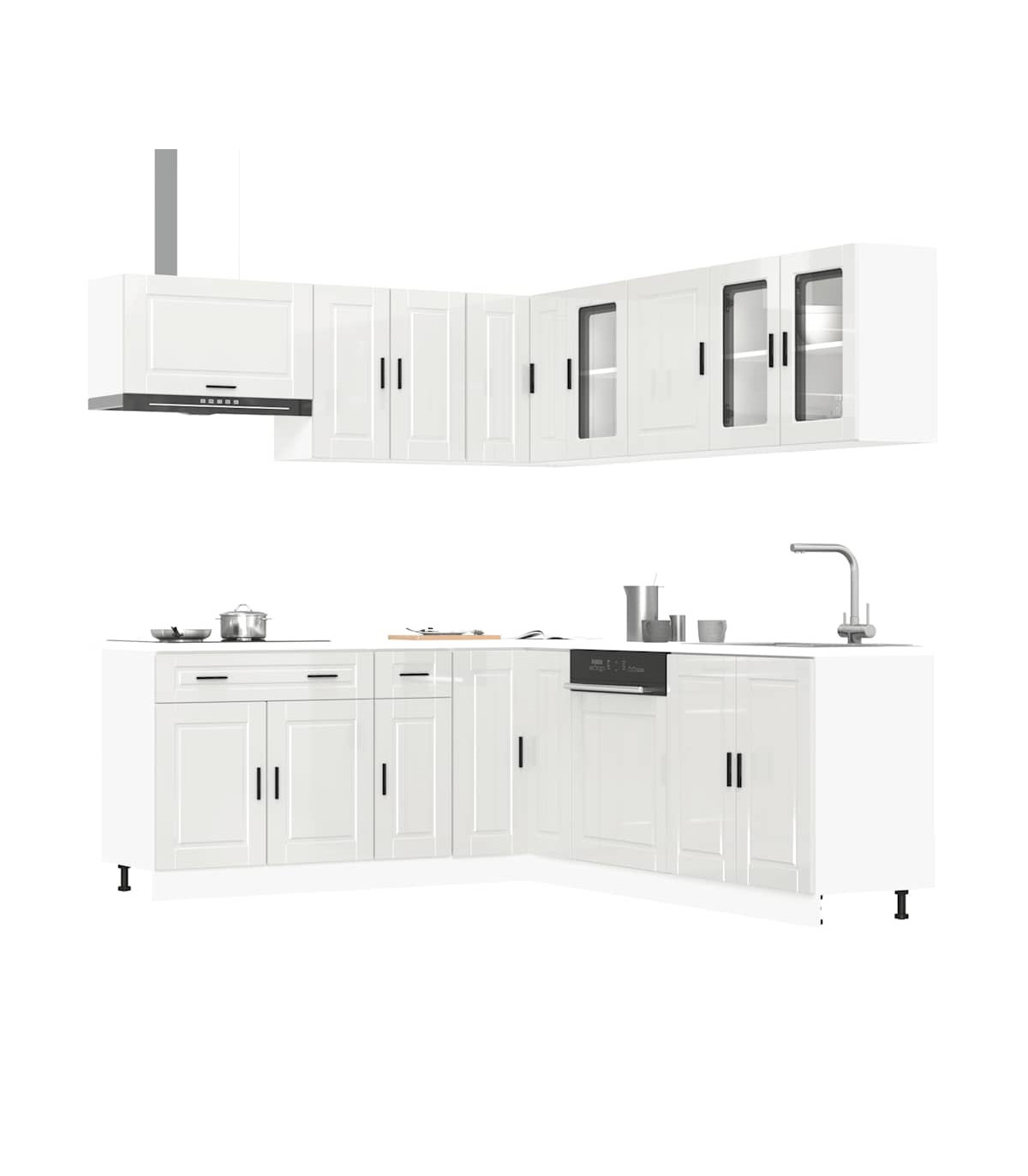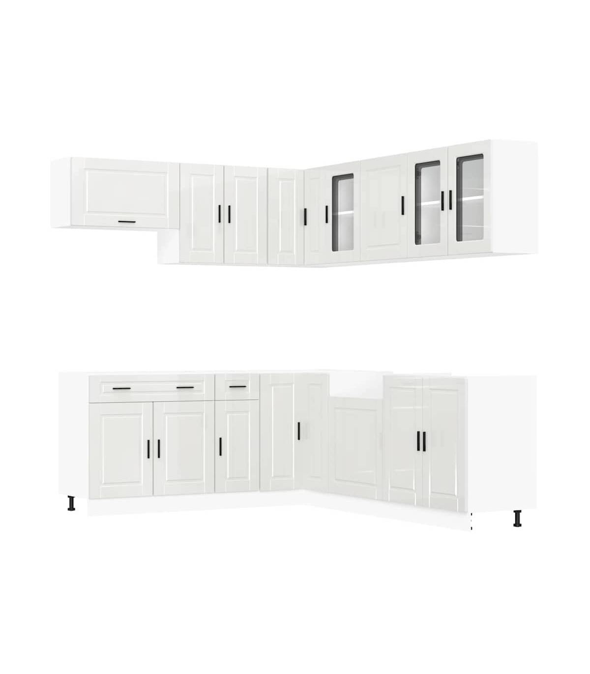 This 11-piece kitchen cabinet set, with its elegant design, optimises your kitchen space and provides ample storage space for your personal belongings! Stable and durable material: Engineered wood is a durable and stable material with a smooth surface that is resistant to moisture, warping, and splitting, making it a reliable choice for a variety of projects.Ample storage space: The kitchen cabinet set has many compartments, and offers sufficient space to store bowls, plates, pots, and other kitchen appliances.Adjustable feet: The bottom cabinets feature adjustable feet that can be adjusted in height to suit your kitchen layout.Easy to maintain: Thanks to its smooth surface, these kitchen cabinets are easy to clean with a damp cloth and require less maintenance. Warning:To prevent it from tipping over, this product must be used with the provided wall attachment device. Good to know:Screw(s) and plug(s) for inside the wall are not included. Seek and use screw(s) and plug(s) suitable for your walls. If you are uncertain, seek professional advice. Read and follow each step of the instruction carefully.The worktop, sink and faucet are not included in the delivery.