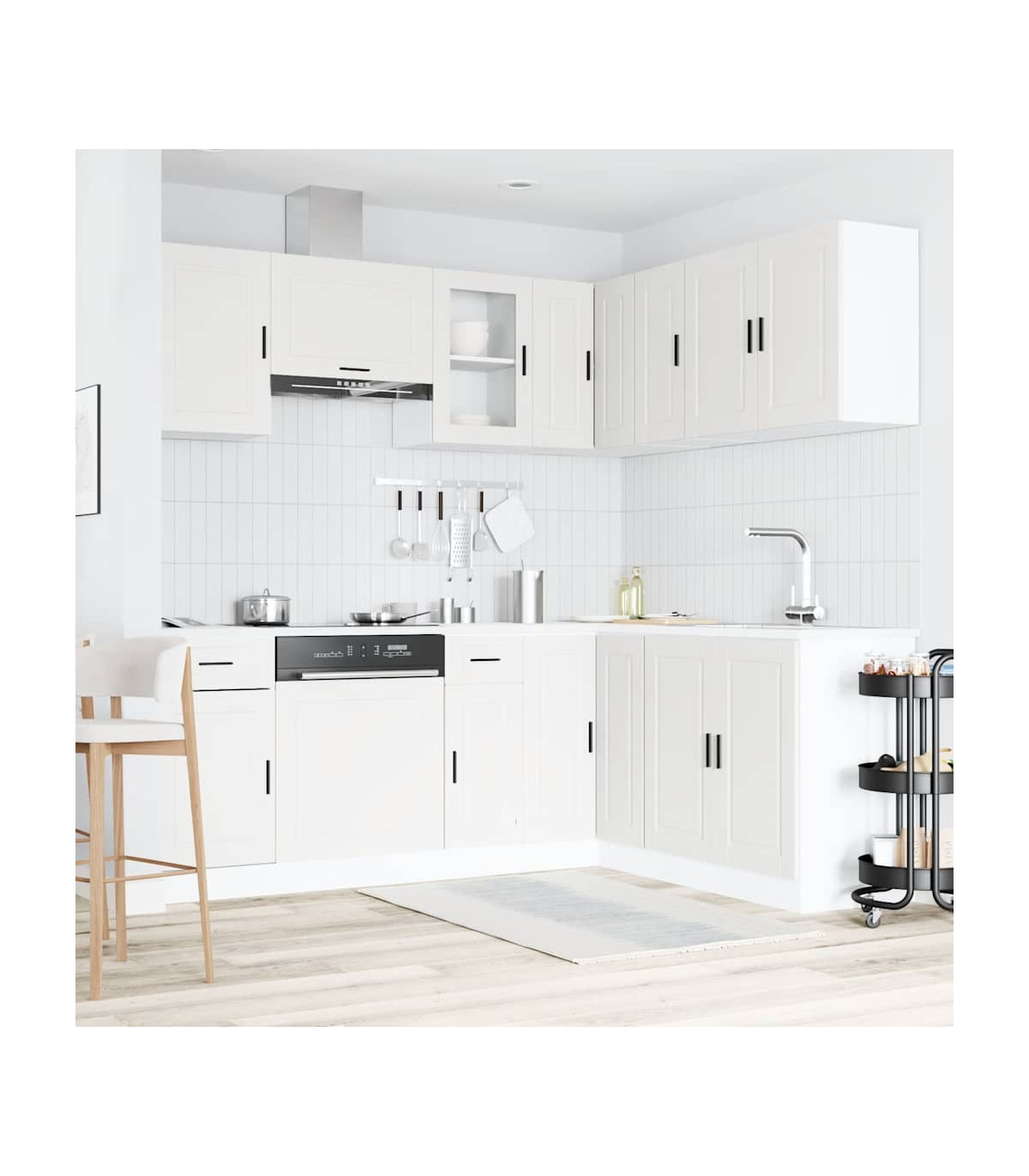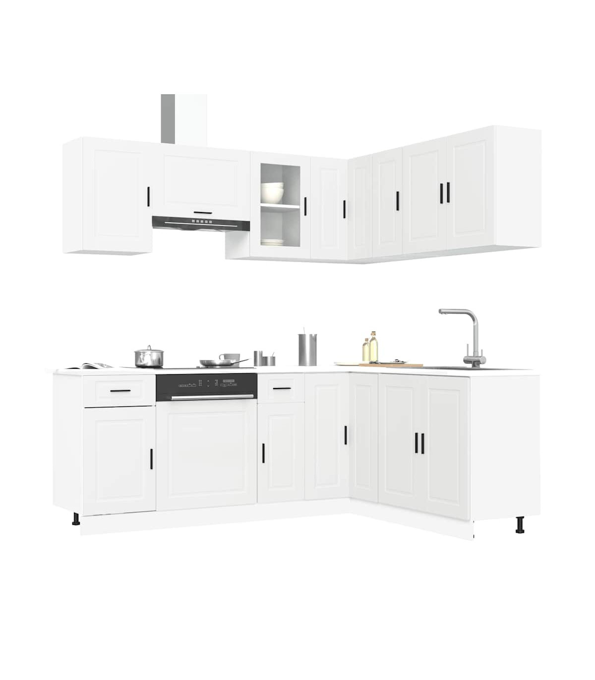 This 11-piece kitchen cabinet set, with its elegant design, optimises your kitchen space and provides ample storage space for your personal belongings! Stable and durable material: Engineered wood is a durable and stable material with a smooth surface that is resistant to moisture, warping, and splitting, making it a reliable choice for a variety of projects.Ample storage space: The kitchen cabinet set has many compartments, and offers sufficient space to store bowls, plates, pots, and other kitchen appliances.Adjustable feet: The bottom cabinets feature adjustable feet that can be adjusted in height to suit your kitchen layout.Easy to maintain: Thanks to its smooth surface, these kitchen cabinets are easy to clean with a damp cloth and require less maintenance. Warning:To prevent it from tipping over, this product must be used with the provided wall attachment device. Good to know:Screw(s) and plug(s) for inside the wall are not included. Seek and use screw(s) and plug(s) suitable for your walls. If you are uncertain, seek professional advice. Read and follow each step of the instruction carefully.The worktop, sink and faucet are not included in the delivery.