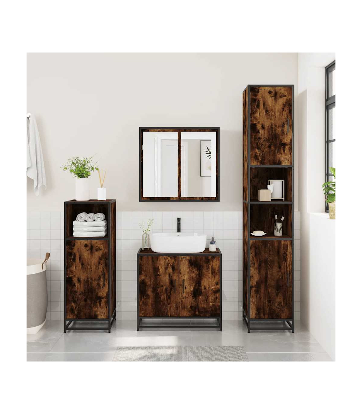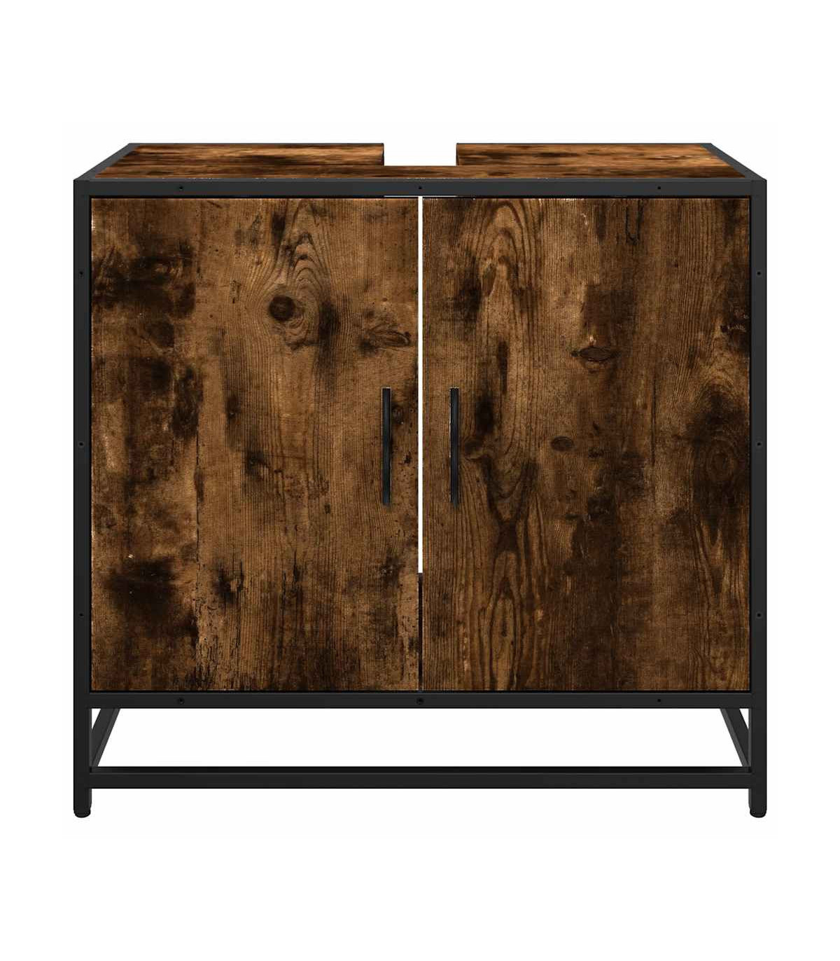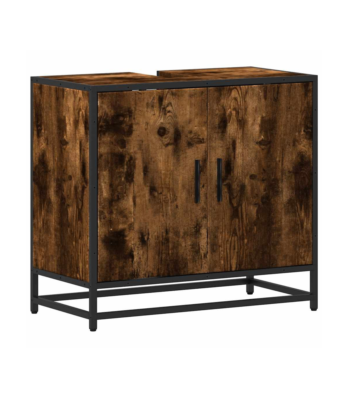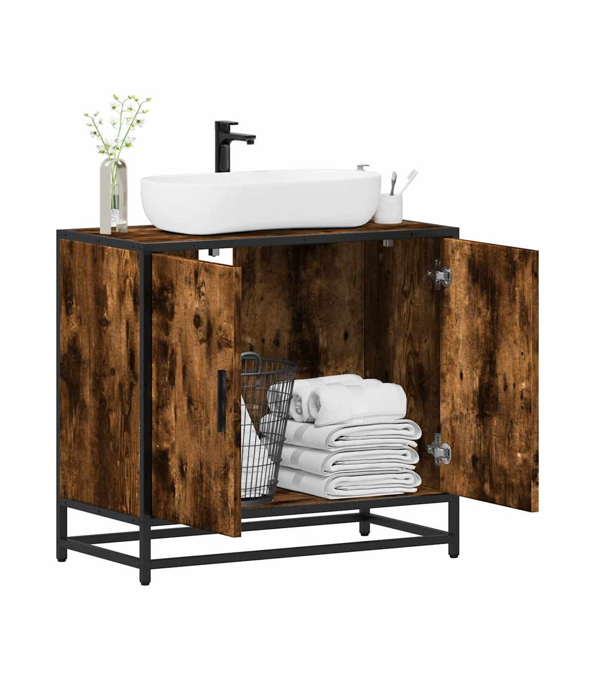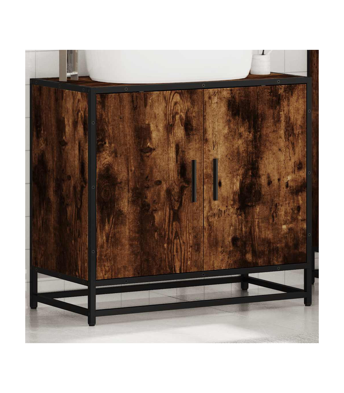This bathroom sink cabinet is meant to be a great addition to your bathroom, giving it a retro and elegant appearance! Stable and durable material: Engineered wood is a durable and stable material with a smooth surface that is resistant to moisture, warping, and splitting, making it a reliable choice for a variety of projects.Stable and long-lasting frame: The metal frame of the bathroom vanity enhances your interior with an industrial style and provides exceptional durability, stability and resistance to corrosion.Ample storage space: This bathroom furniture offers ample storage space to keep your essentials well organised and within reach.Practical cabinet top: The top of the sink cabinet has a hole, so it is ideal for placing the sink.Attractive appearance: The striking design of the bathroom cabinet enhances the overall look of your space with its smooth lines and sophisticated patterns, making it the highlight of any room. Warning:To prevent it from tipping over, this product must be used with the provided wall attachment device.