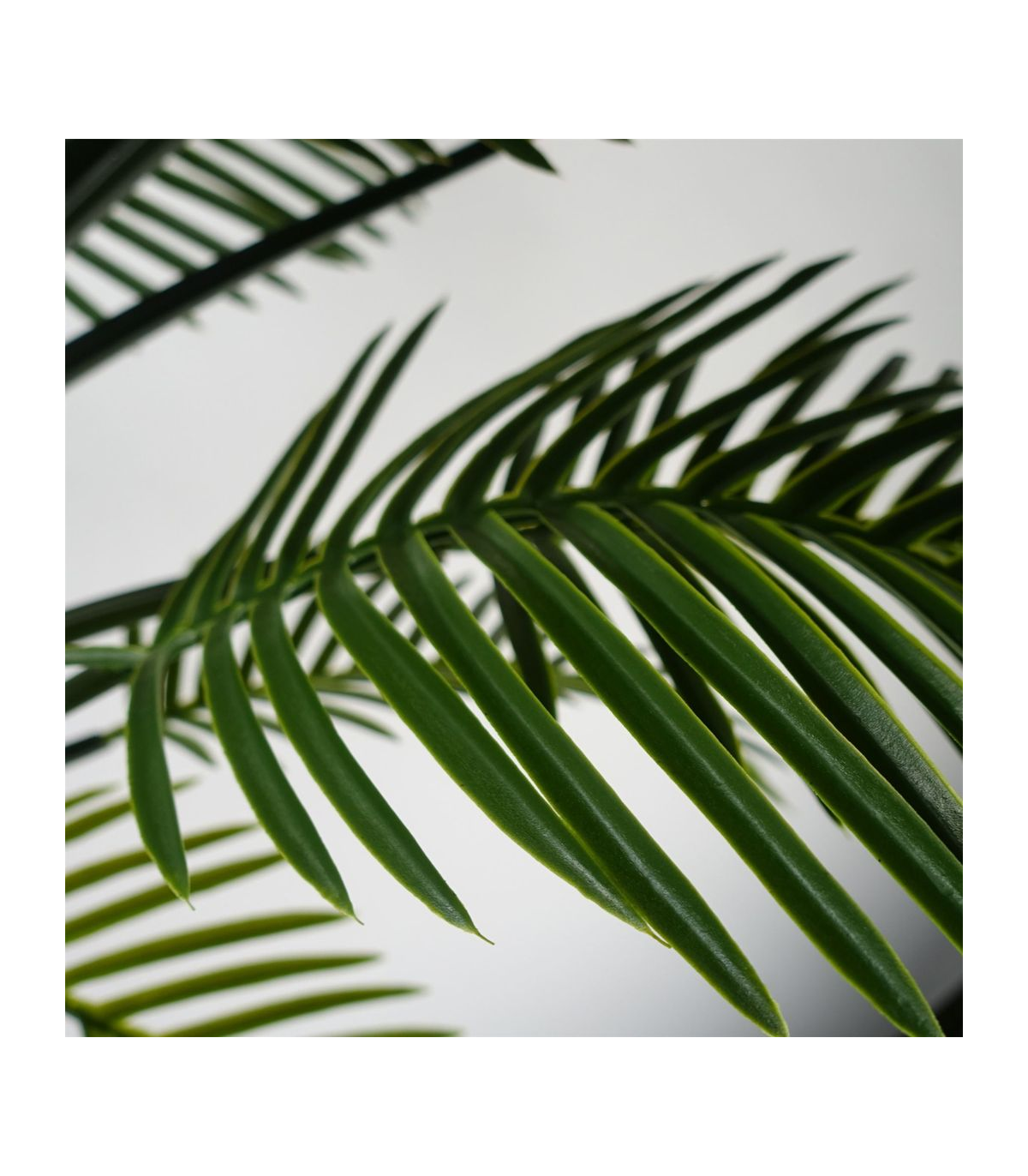 This UV resistant artificial palm tree is perfect for outdoor settings. The lifelike replica of a Raphis palm stands at 125cm tall and 90cm wide, as depicted in our images. It comes in a weighted black plastic pot, measuring approximately 17cm (w) x 15cm (h). For a more striking display, we suggest placing it inside a larger planter.