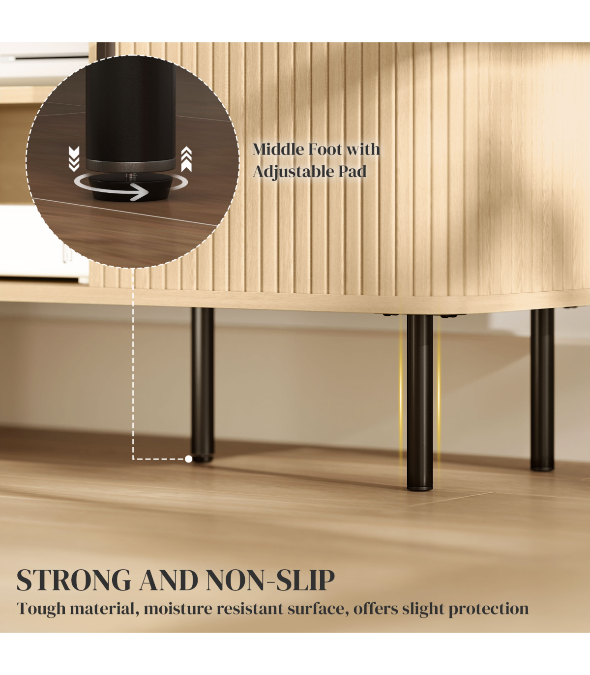● Adjustable foot pads keep the table stable on uneven grounds