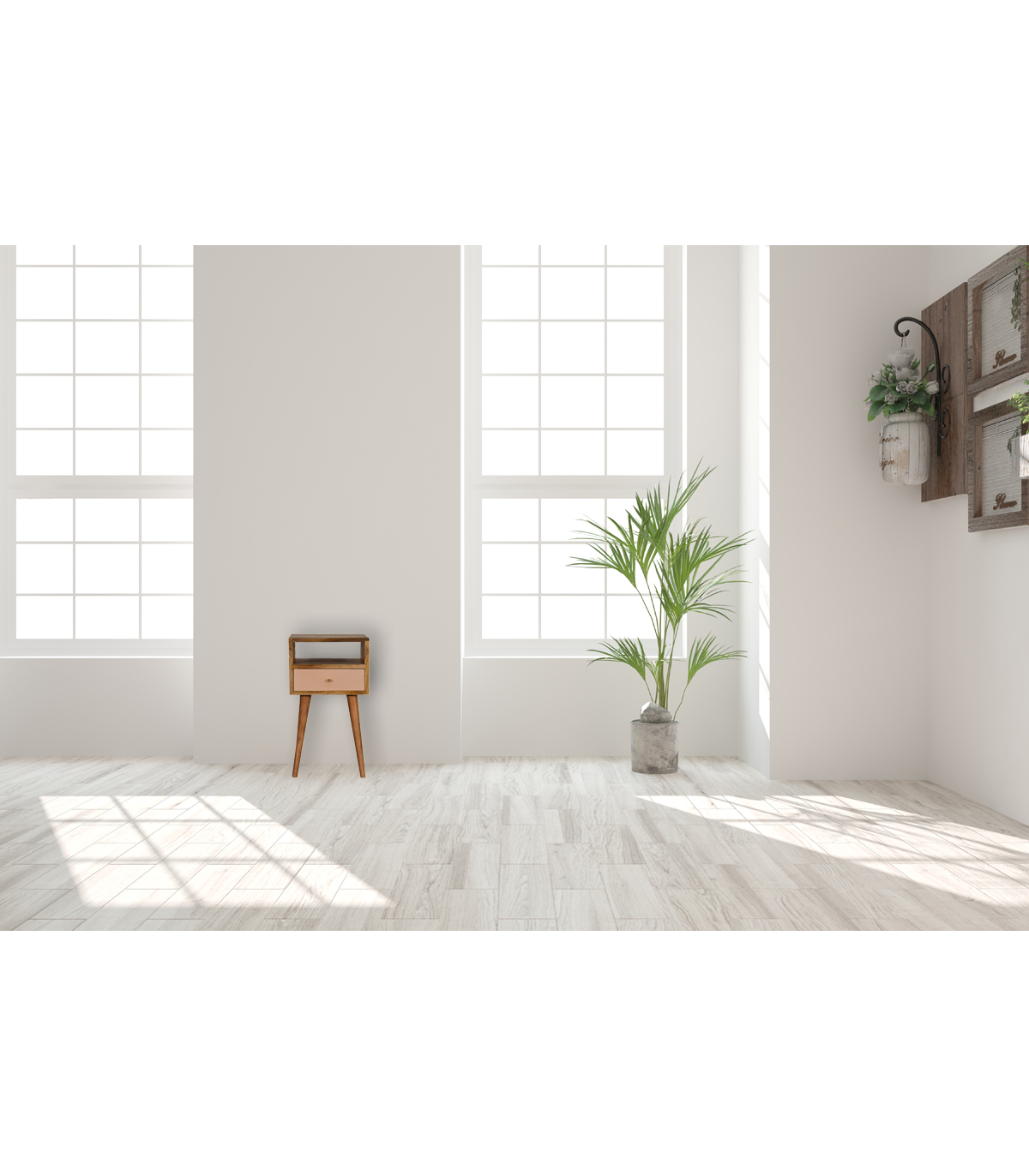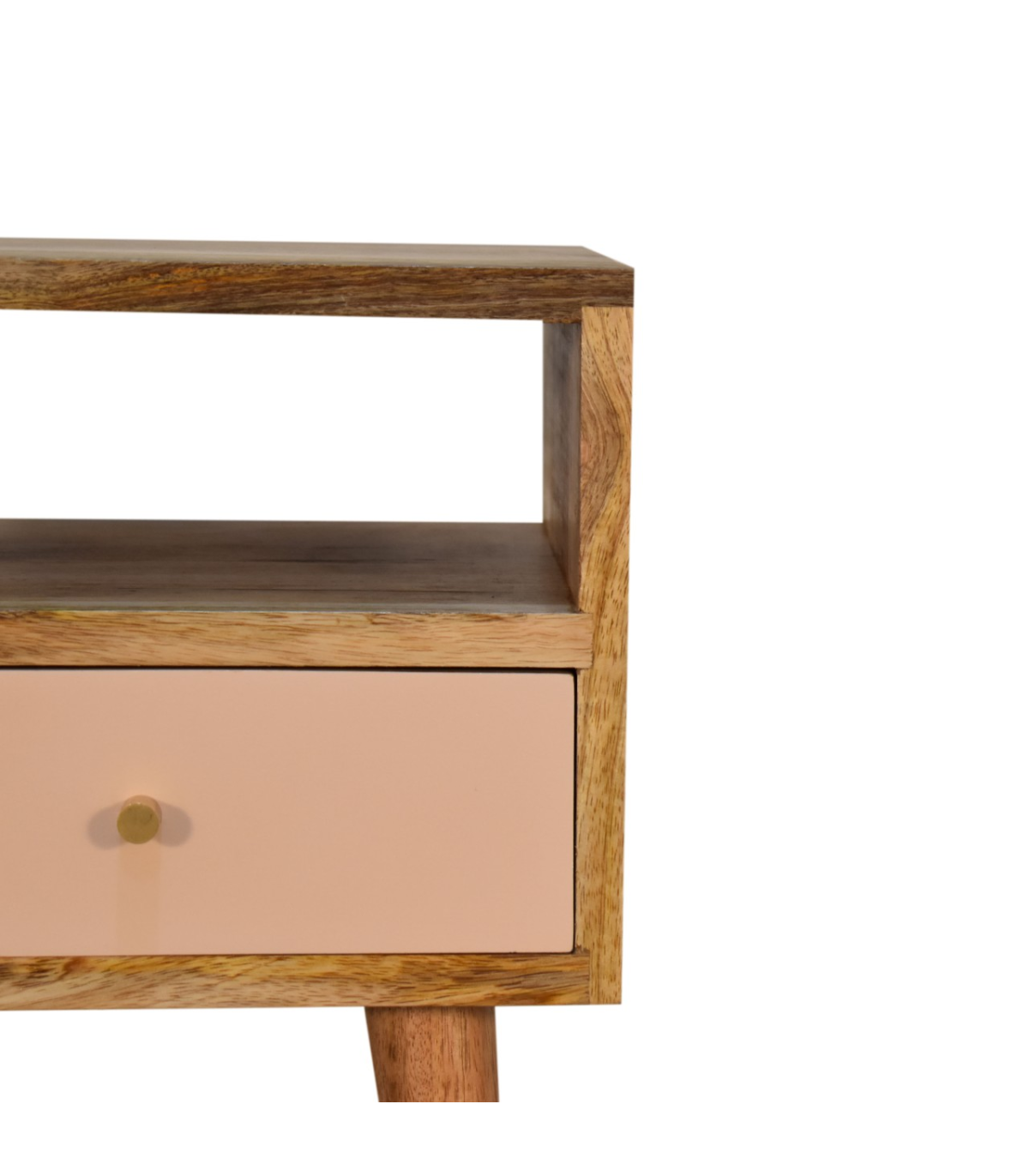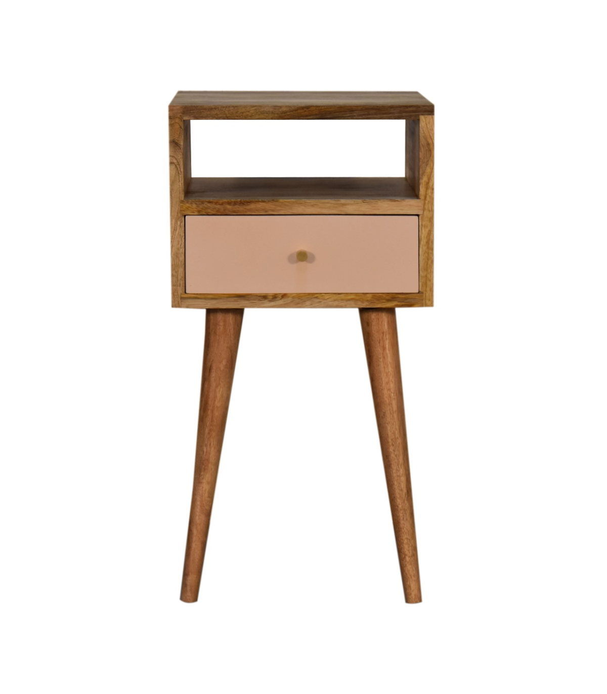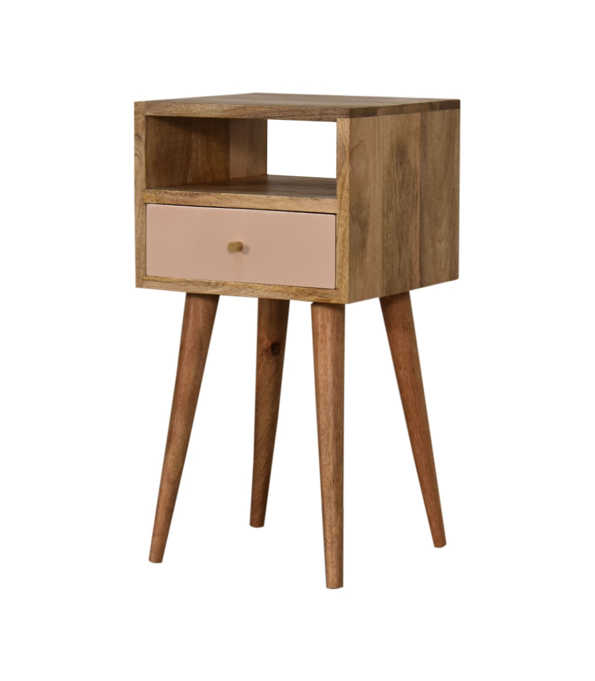 This neat bedside table is crafted from 100% solid mango wood and finished in a fine oak-ish tone. It includes one blush pink hand-painted drawer for a pop of color and style. Below, an open shelf provides practical storage for books or d?or. The spacious tabletop accommodates ornaments, lamps, or frames. Four Scandinavian-style legs offer both stability and aesthetic appeal. Compact and charming? delightful bedside accent. The blend of natural finish and pastel drawer adds personality. Perfect for modern, eclectic, or neutral interiors.