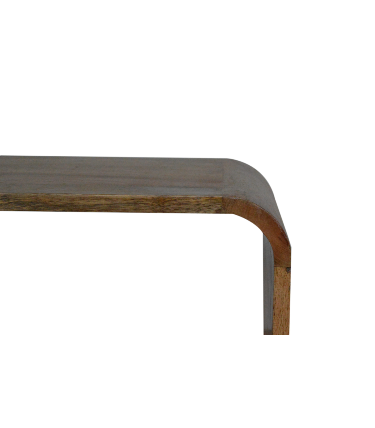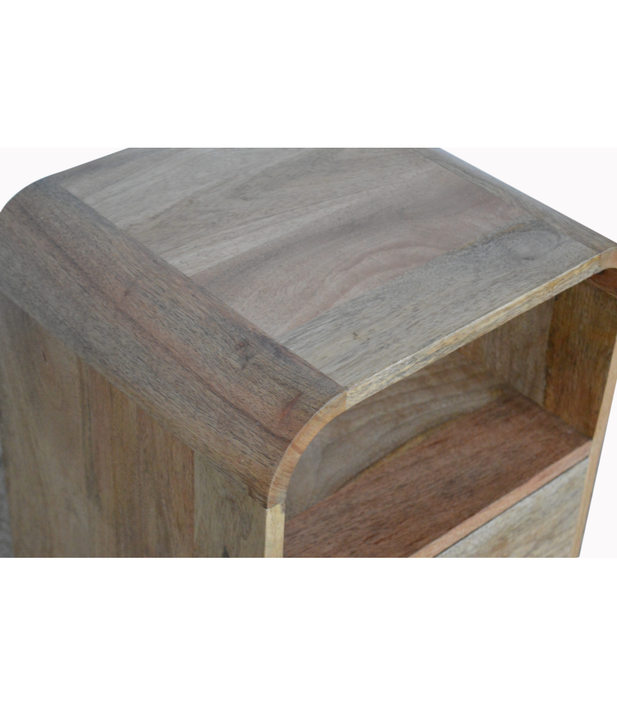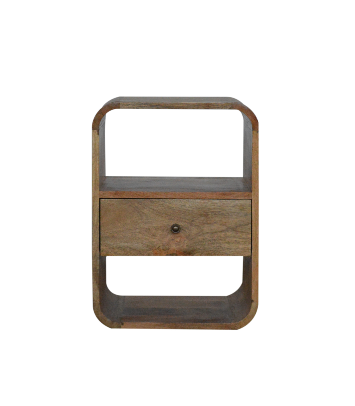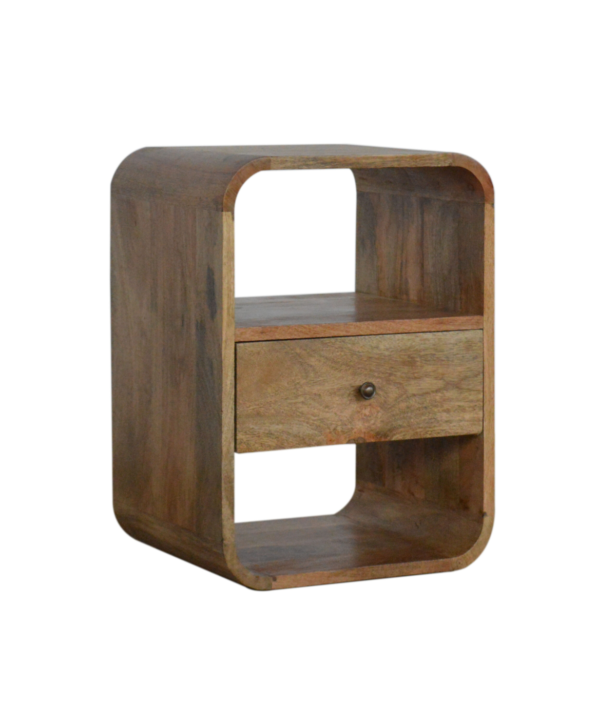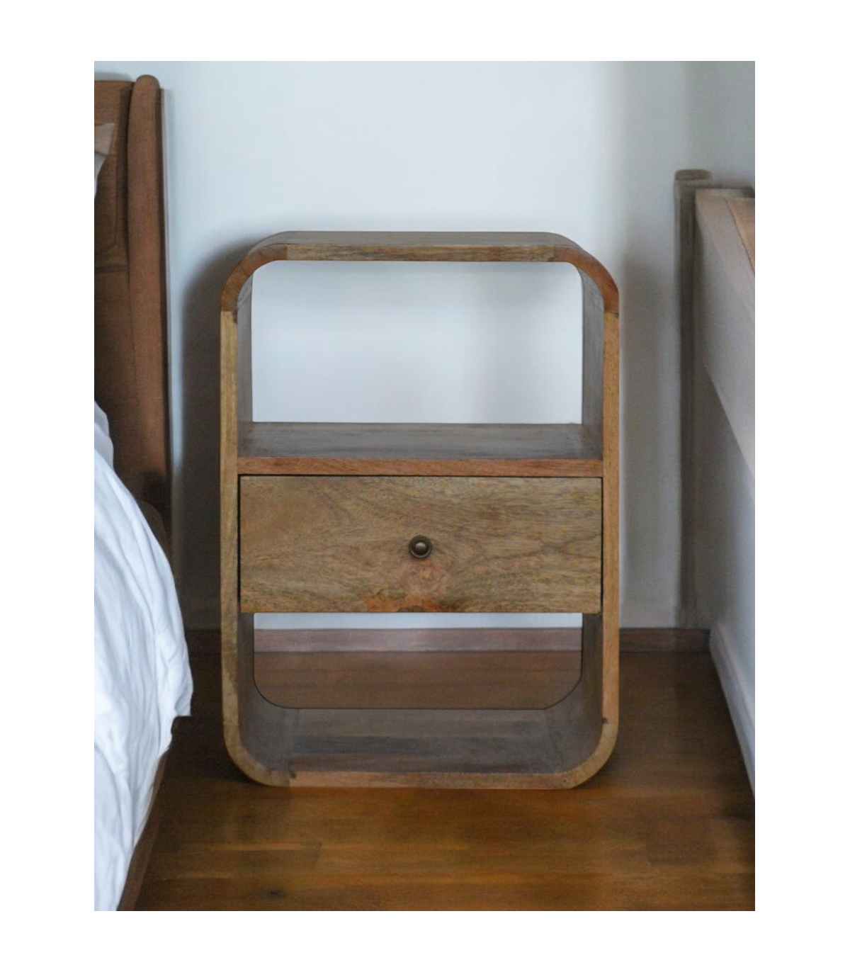 This solid wood bedside table offers a smooth, rounded edge design crafted from 100% solid mango wood in an oak-ish finish. It includes a single drawer equipped with a shiny brass knob for easy access. Beneath the drawer are two open slots for additional storage. The rounded edges soften the overall look and add subtle elegance. Ideal for bedrooms, its simple design suits a variety of d?or styles. Compact and functional?erfect for small spaces. Durable craftsmanship makes it a lasting furniture companion. A clean and modern addition to any home.