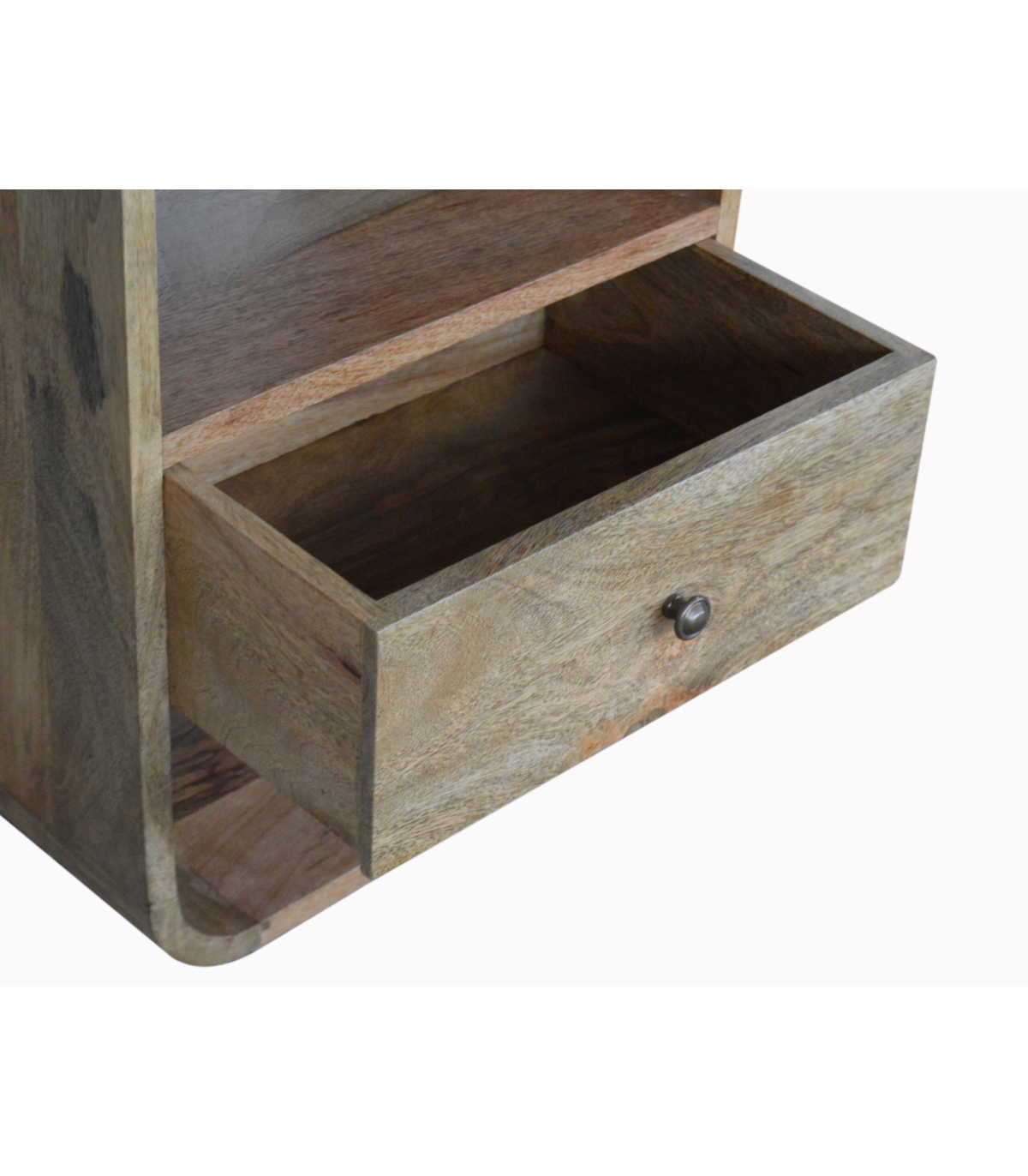 This solid wood bedside has been constructed from 100% solid mango wood in an oak-ish finish and offers a nice rounded look on the edges. It features 1 drawer which comes with a shiny brass knob and 2 open slots for extra storage. A great simple and addition to the bedroom.