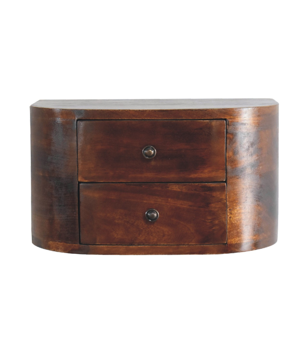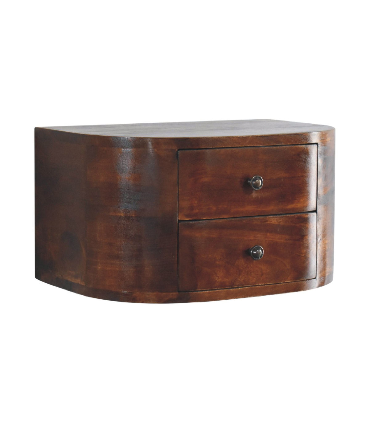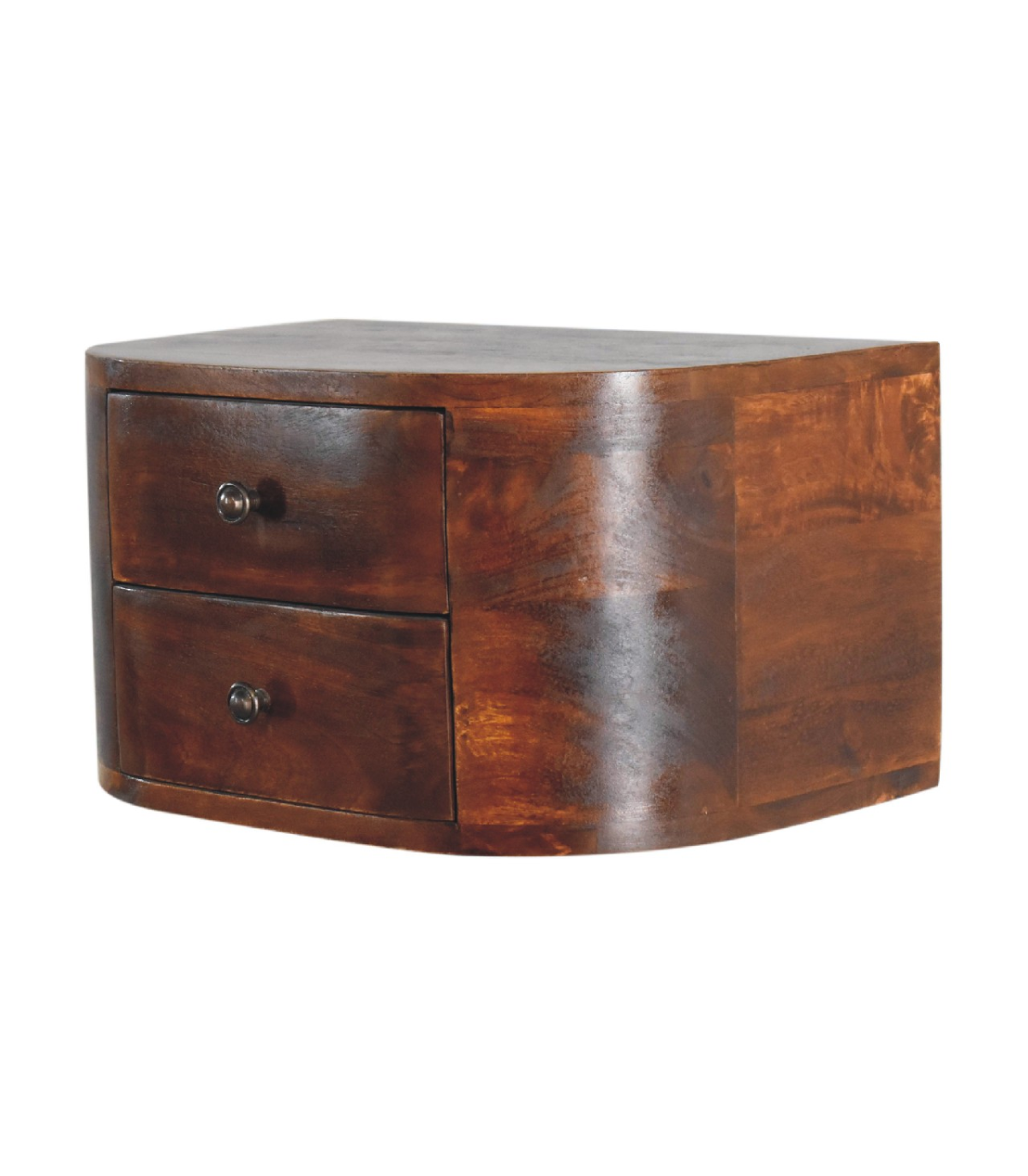 This wall-mounted bedside has been constructed from 100% solid mango wood in a chestnut finish and offers a unique shaped design with rounded edges. It can be easily mounted on the wall without the fuss of legs. It also features 2 drawers perfect for storing any bits and pieces and keeping them close before bedtime.