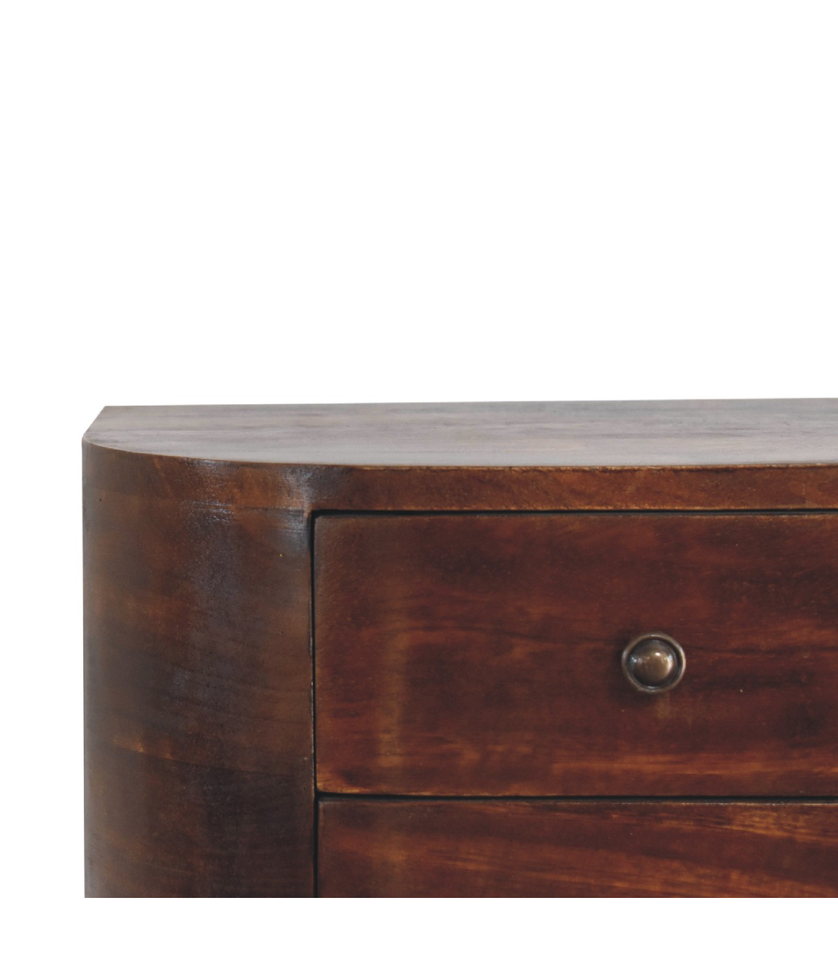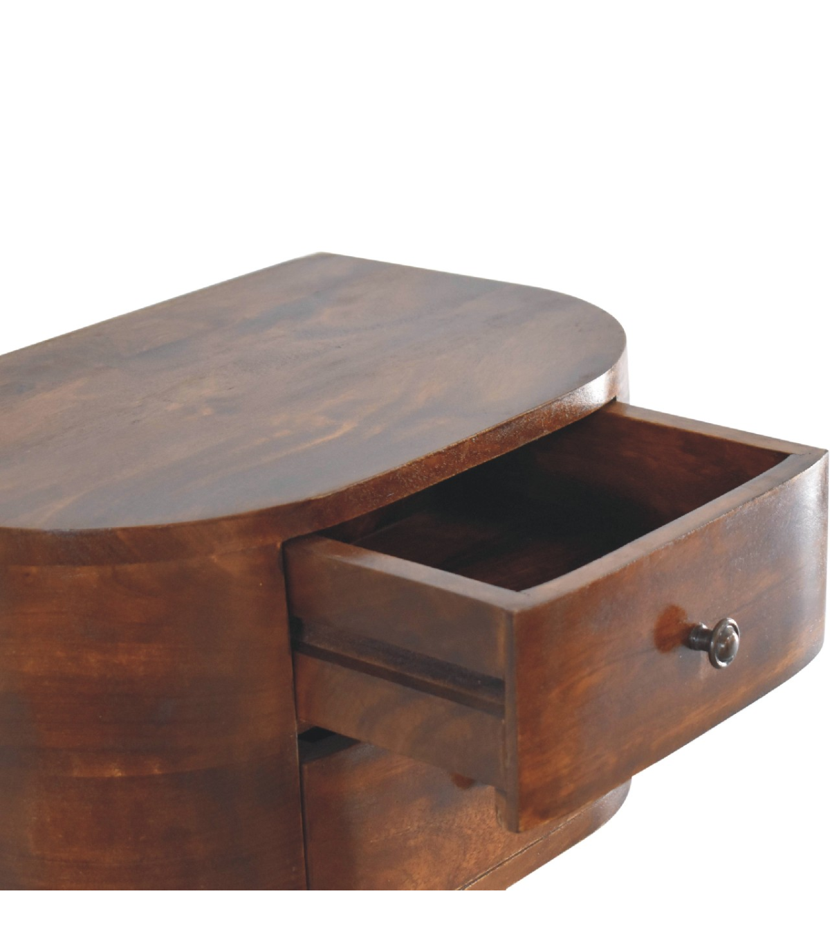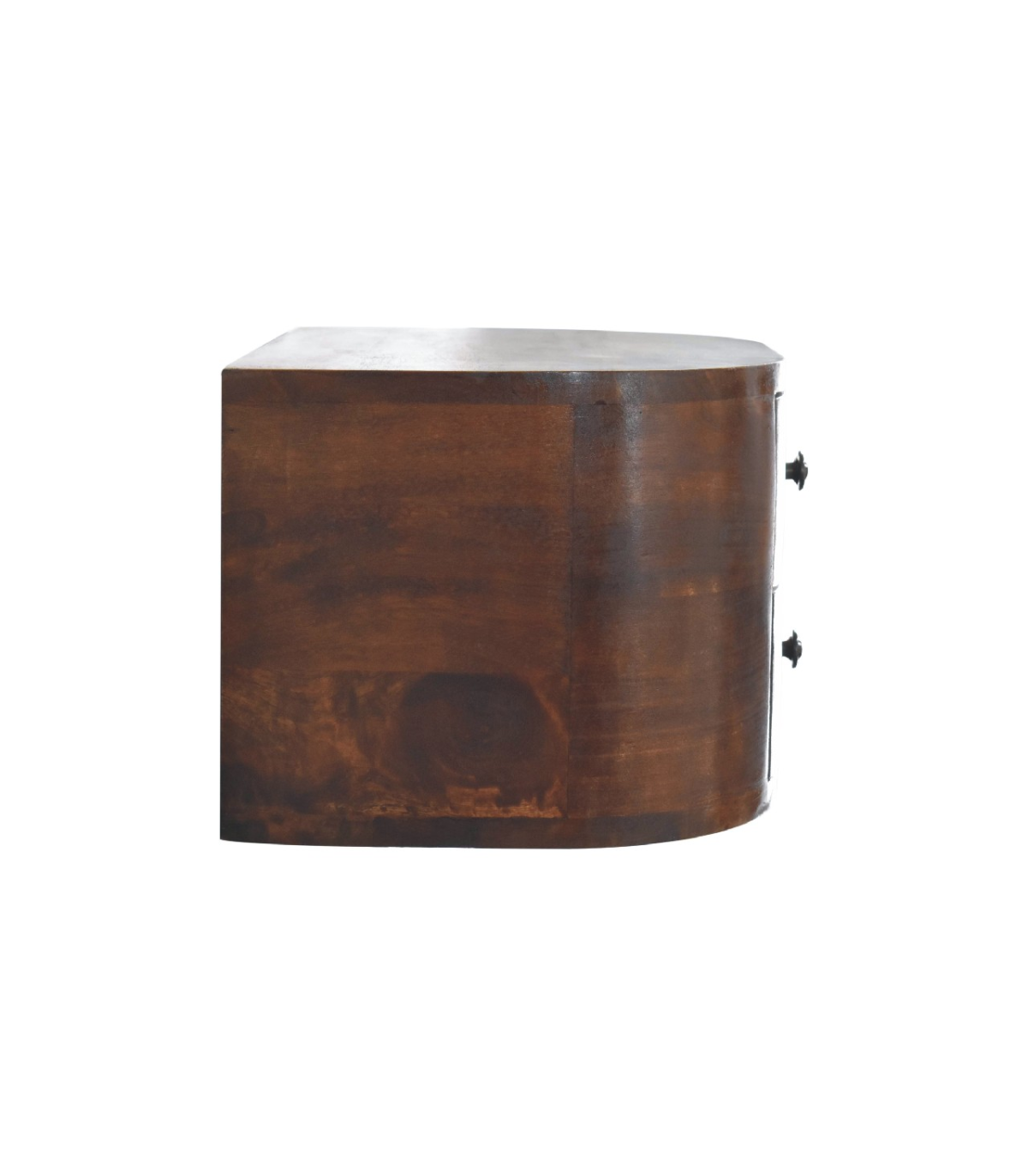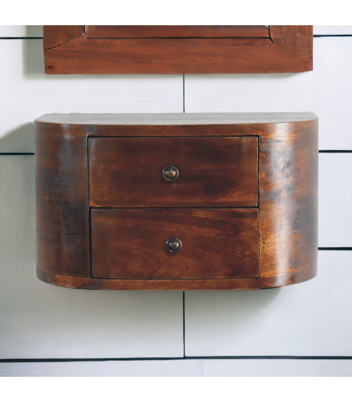This wall-mounted bedside has been constructed from 100% solid mango wood in a chestnut finish and offers a unique shaped design with rounded edges. It can be easily mounted on the wall without the fuss of legs. It also features 2 drawers perfect for storing any bits and pieces and keeping them close before bedtime.