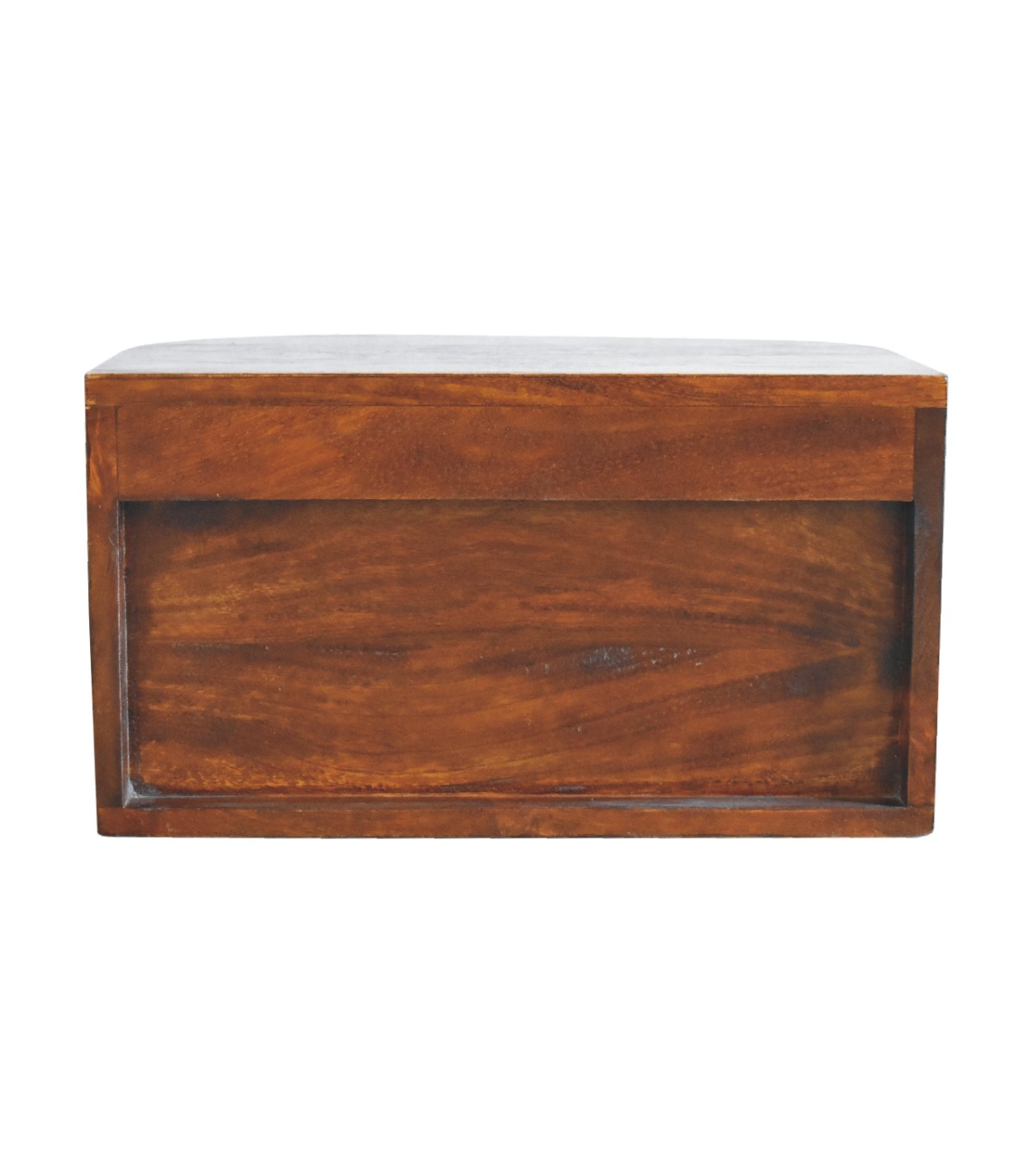 This wall-mounted bedside table is crafted from 100% solid mango wood in a chestnut finish. It features rounded edges that soften the look and blend seamlessly into various d?ors. Two drawers provide ample storage for books, gadgets, or other essentials. The wall-mounted design saves space and keeps the floor area open. Smooth, curved edges enhance both safety and visual appeal. Perfect for modern and minimal bedroom settings. It? functional, stylish, and space-efficient. A smart furniture upgrade for contemporary homes.