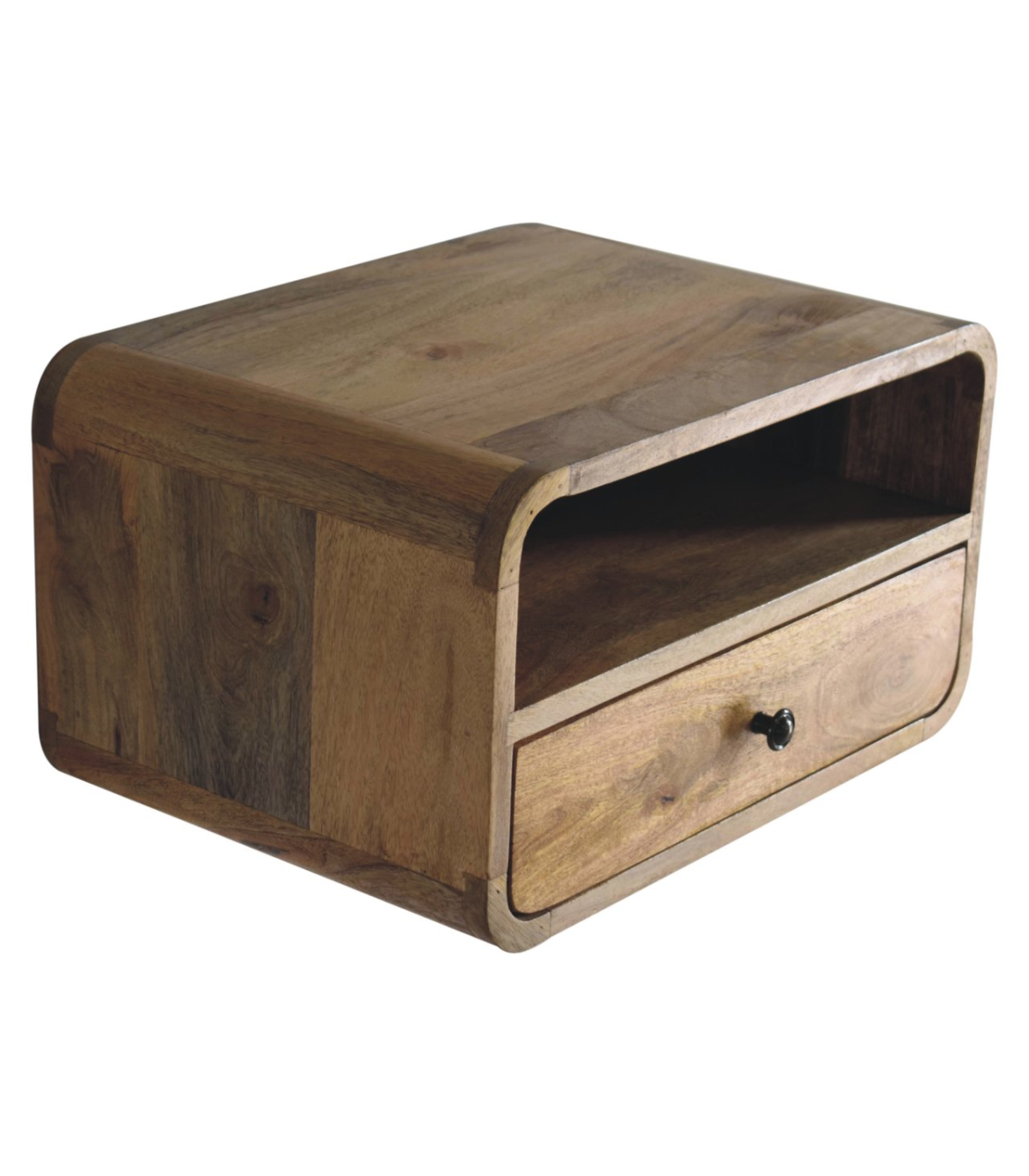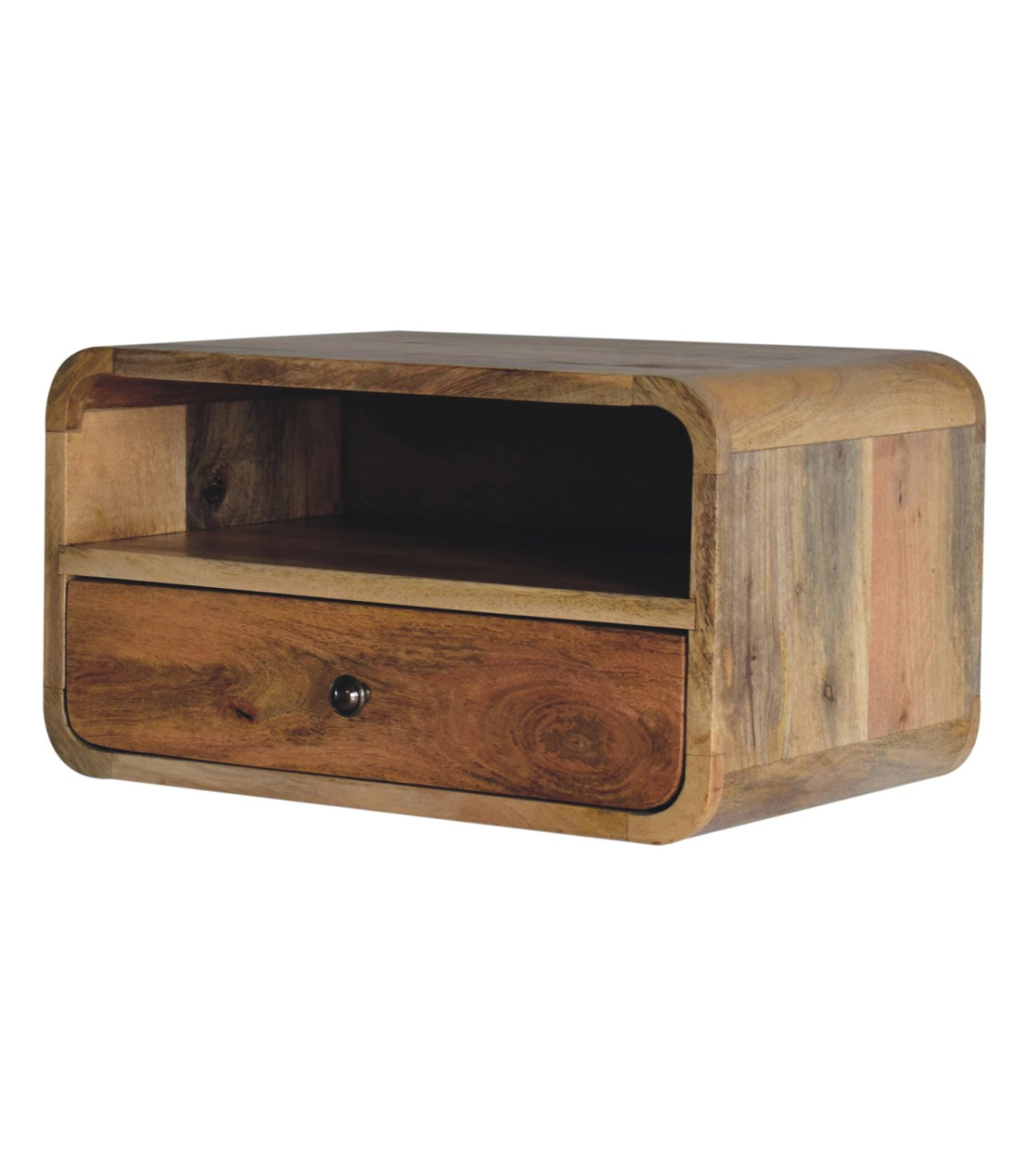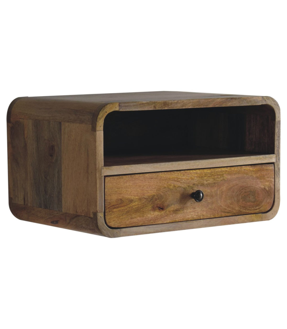 Meet the bigger brother of our Floating Curve Open Slot Bedside, a wall-mounted unit crafted from 100% solid mango wood. Finished in a natural oak-ish tone, it features one drawer with a shiny knob and one open shelf. This minimalistic design offers clean lines and efficient use of space. Wall-mounting keeps your floor clear and creates an uncluttered look. It? great for holding essentials like books, remotes, or your phone. A sleek and modern piece for bedrooms of any size. Note: not designed to support sitting or excessive weight.