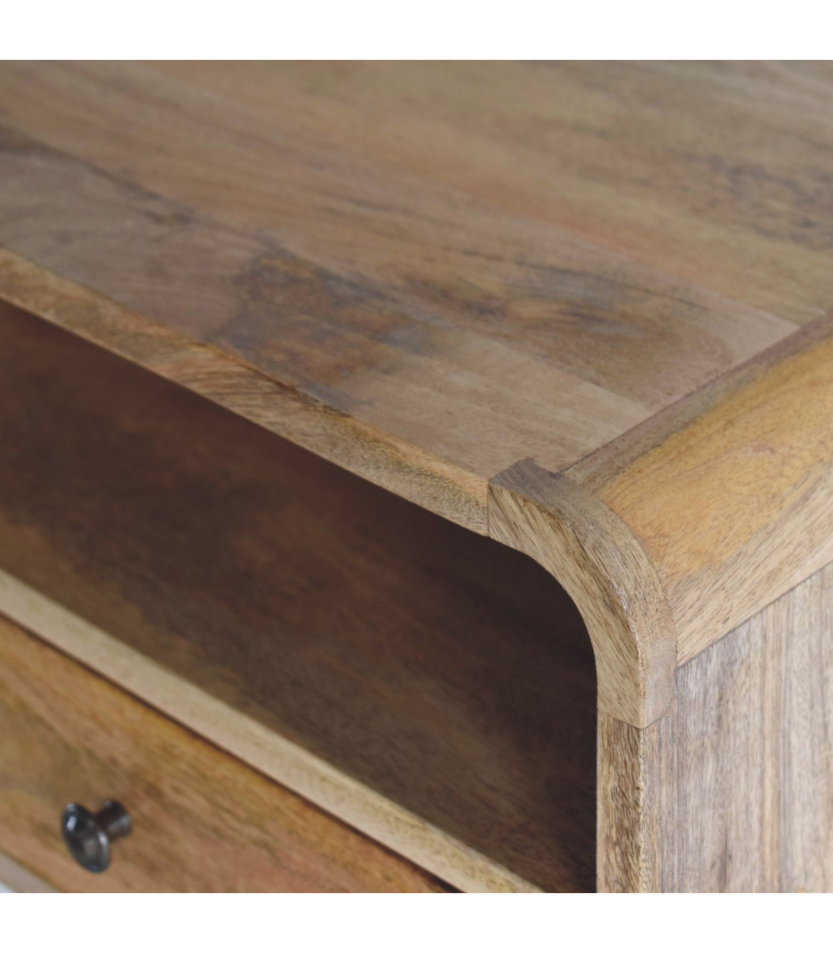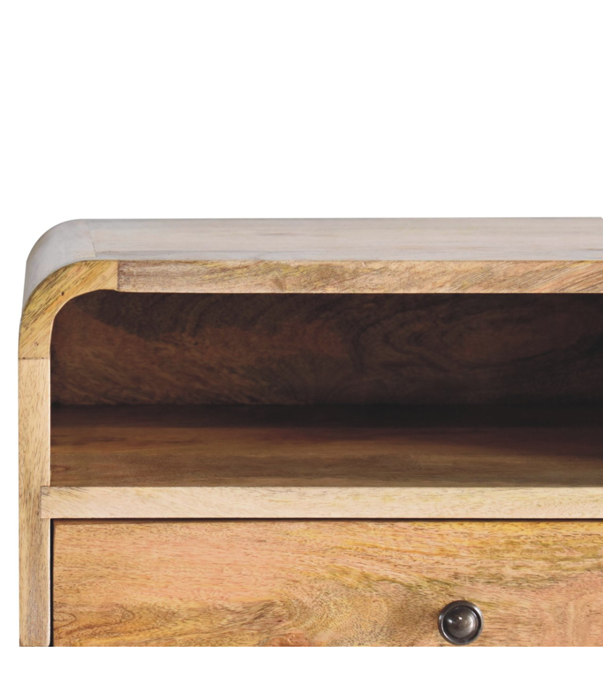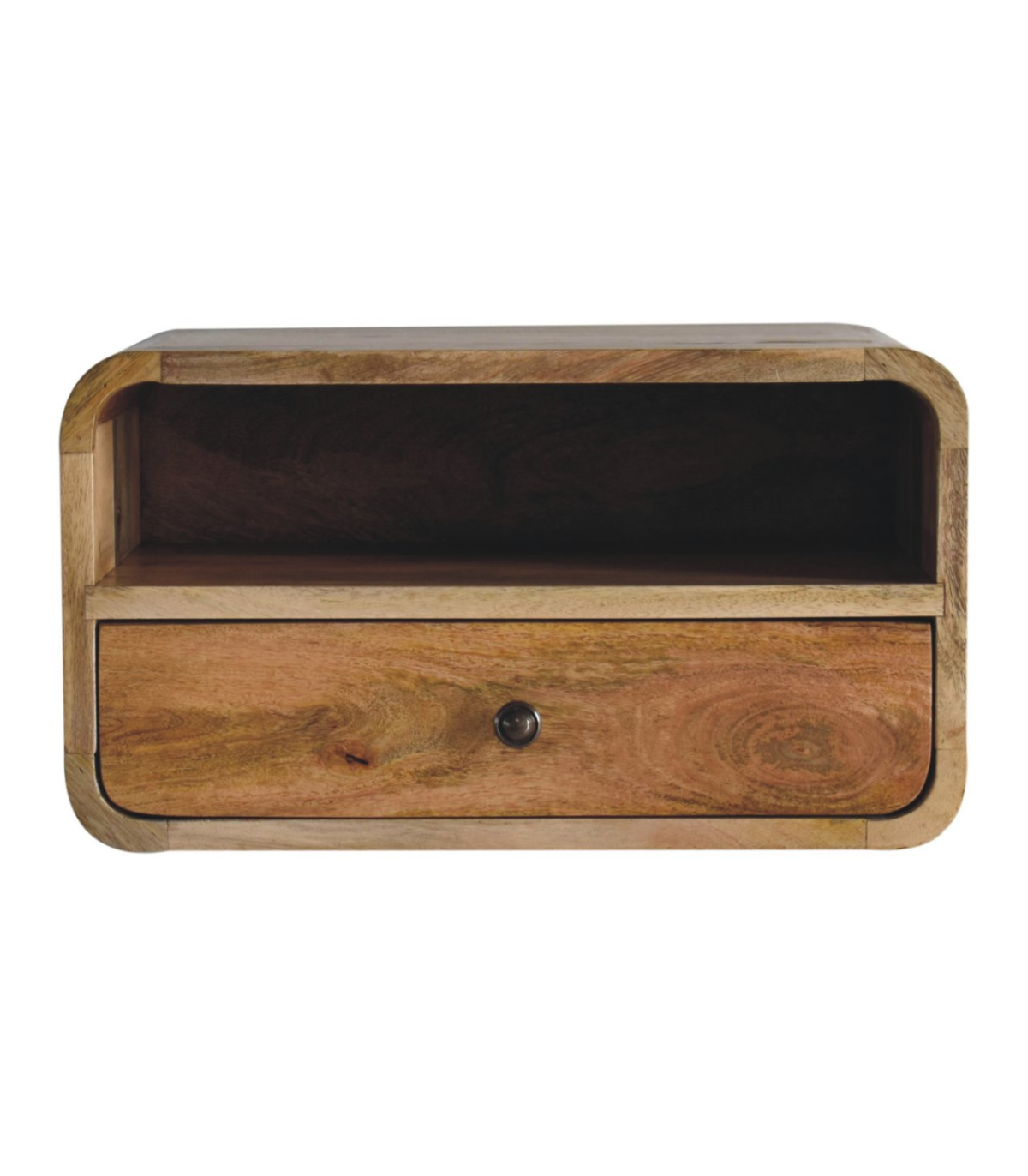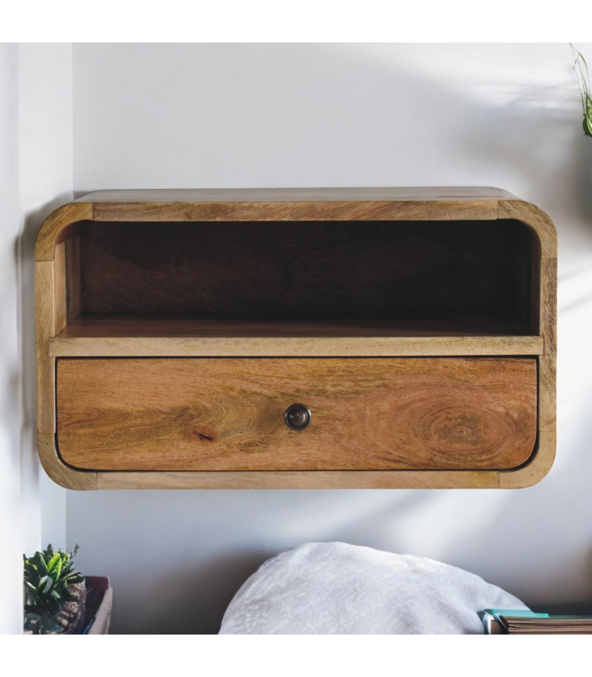 Meet the bigger brother of our Floating Curve Open Slot Bedside, a wall-mounted unit crafted from 100% solid mango wood. Finished in a natural oak-ish tone, it features one drawer with a shiny knob and one open shelf. This minimalistic design offers clean lines and efficient use of space. Wall-mounting keeps your floor clear and creates an uncluttered look. It? great for holding essentials like books, remotes, or your phone. A sleek and modern piece for bedrooms of any size. Note: not designed to support sitting or excessive weight.