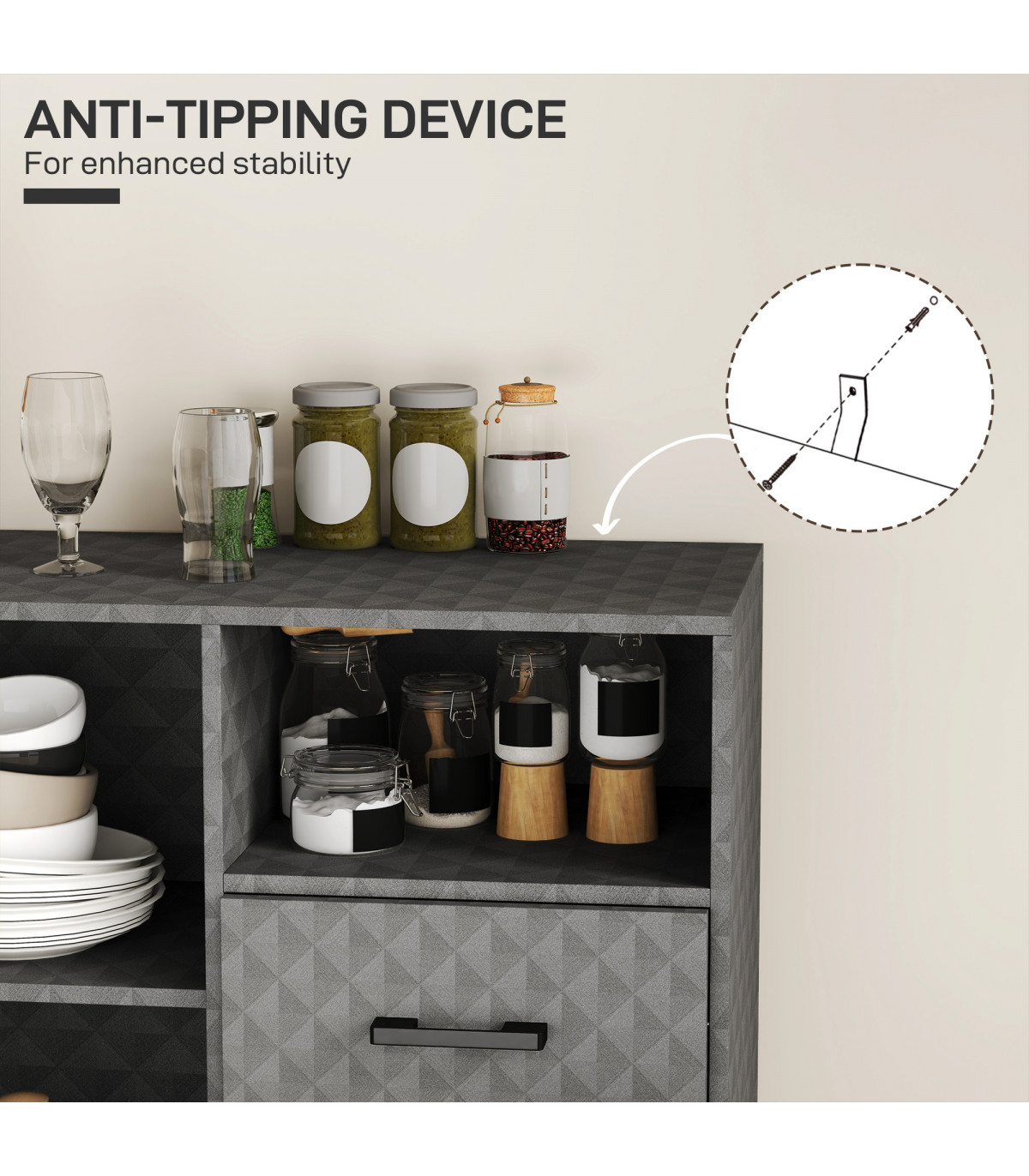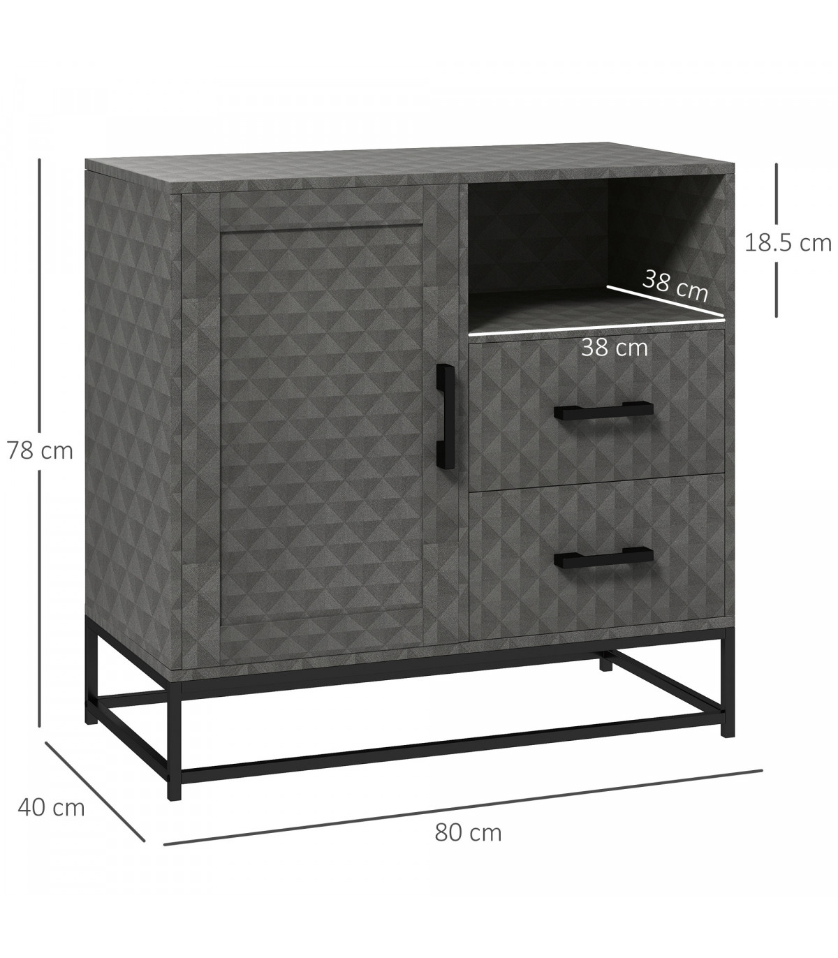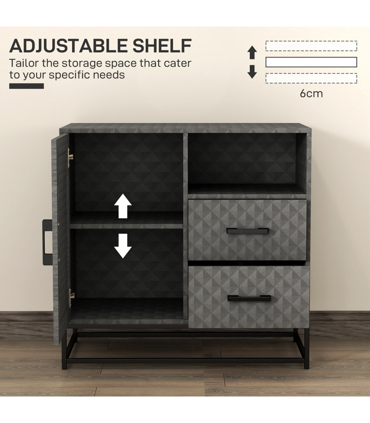 Discover the charm and functionality of the HOMCOM sideboard. This versatile piece features a storage cupboard with an adjustable shelf, an open compartment and two drawers, ensuring that every item is stored neatly and within easy reach. It' s a stylish and practical solution for any home, ensuring everything has its place while adding a touch of elegance to your decor.