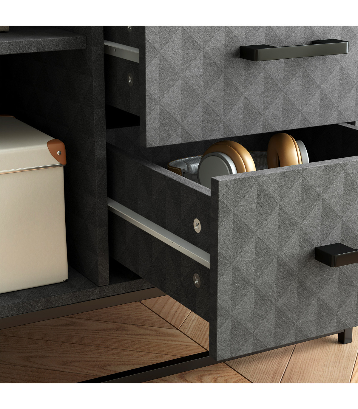 ● A storage cabinet, an open compartment and two drawers maximise organisation