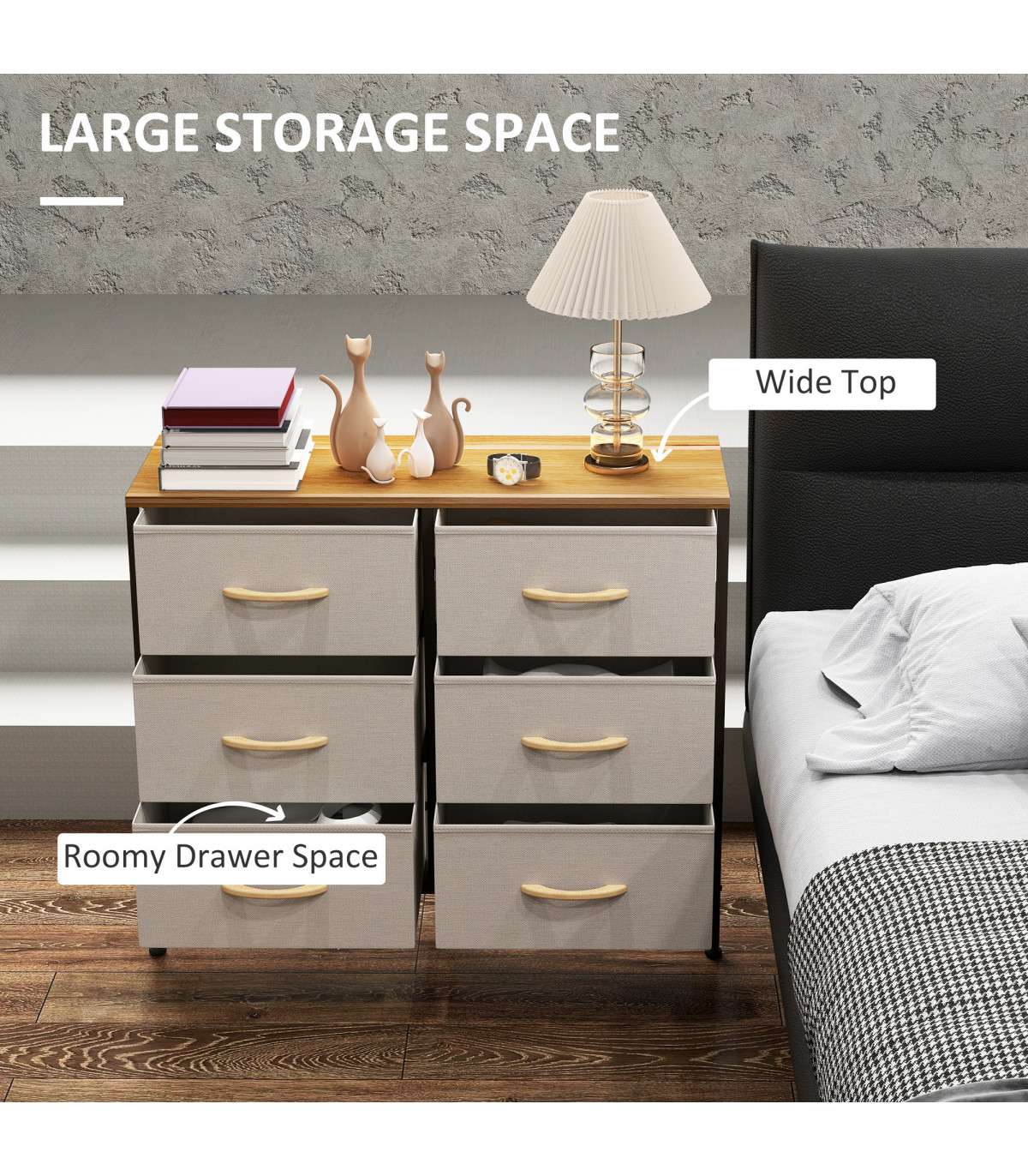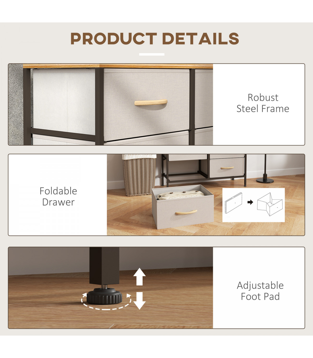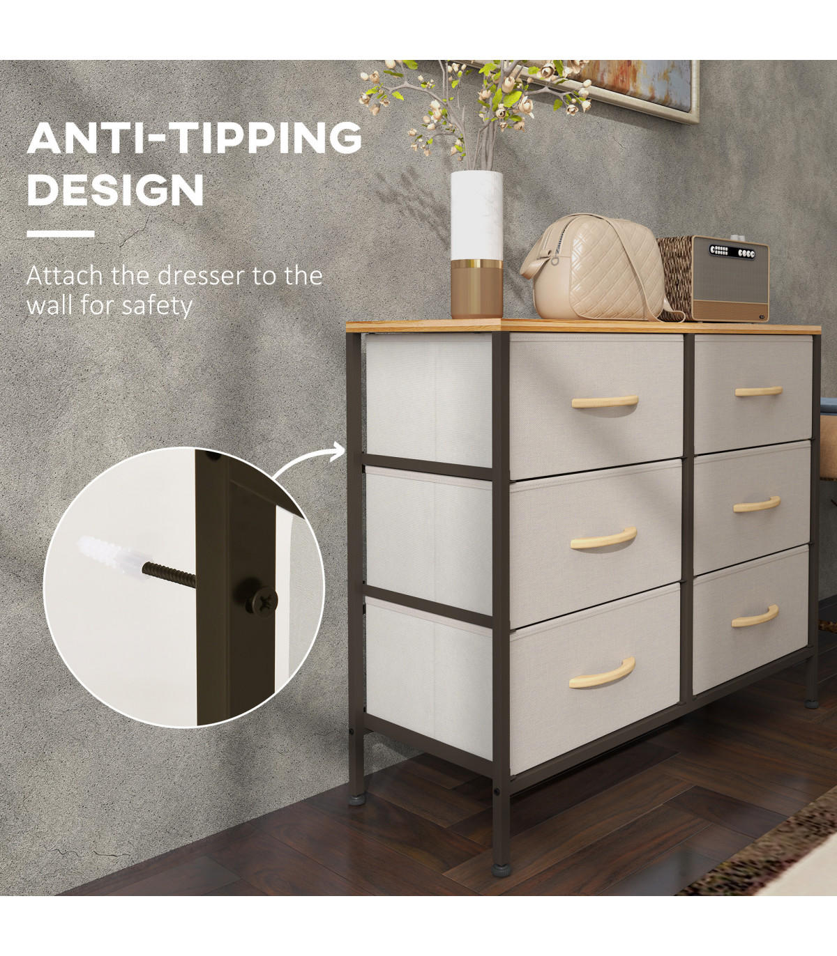 Home storage with this HOMCOM fabric chest of drawers. The six fabric drawers offer room for lots of things - keep t-shirts, tops, bottoms and more organised. The wood-effect top offers more room: a great place to display your favourite photos. The steel frame makes a strong core, with adjustable feet for balance. Comes with anti-tipping straps for safety. Use all over the home and office.