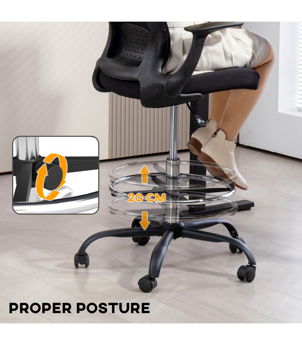 ● Adjustable seat height and foot ring height, enhance comfort and posture
